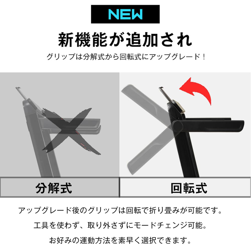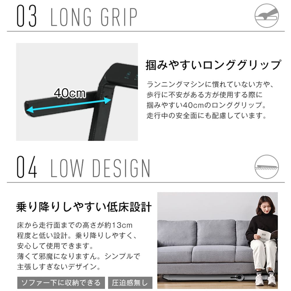 【2 WAY仕様で使い分け】使い分けができるので目的に合わせて使える! ウォーキングモード (フレームを下した状態) 気軽に運動したい時に 時速1~6km ランニングモード (フレームを上げた状態) ハードな運動もしたい時に 時速1~14km
