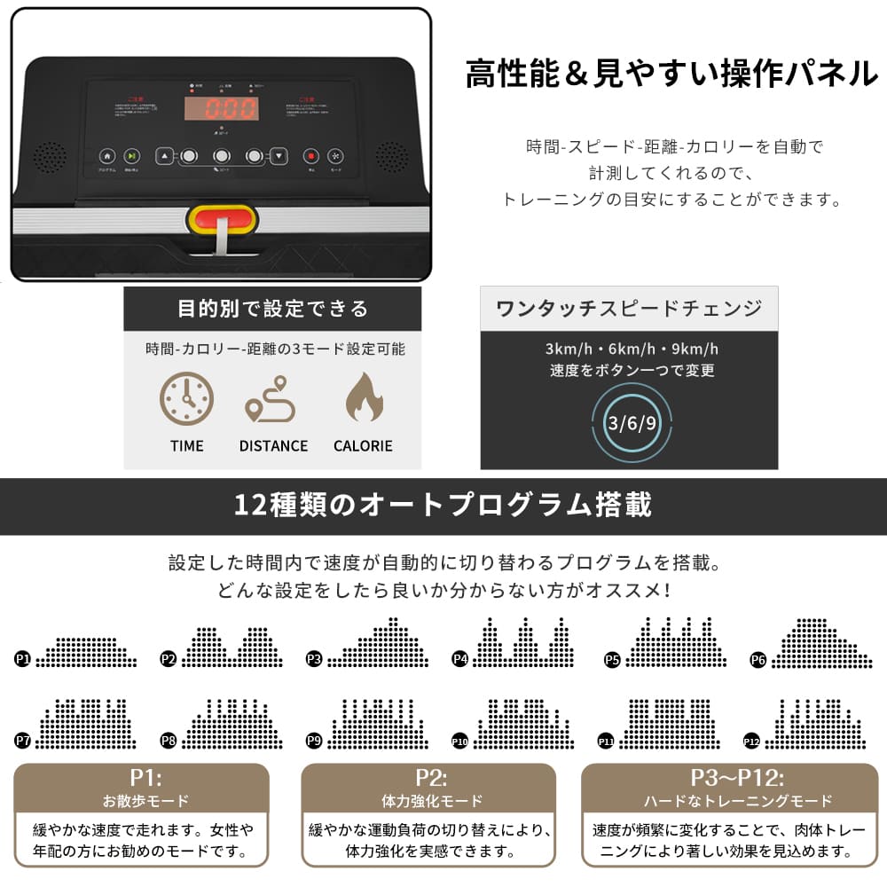 【速度調整1~12km/h】スピード調整は1~12km/h でスピード自由自在これ一台で、ゆっくりウォーキングからハードなランニングまで!家族でシェアもオススメ!!0.1km/h刻みで調節できるので、に合わせてお好みの速度に設定できます。1km/h リハビリ・軽めのお散歩に 5km/h ちょっと早歩きに7km/h ジョギングに 10km/h ダイエット