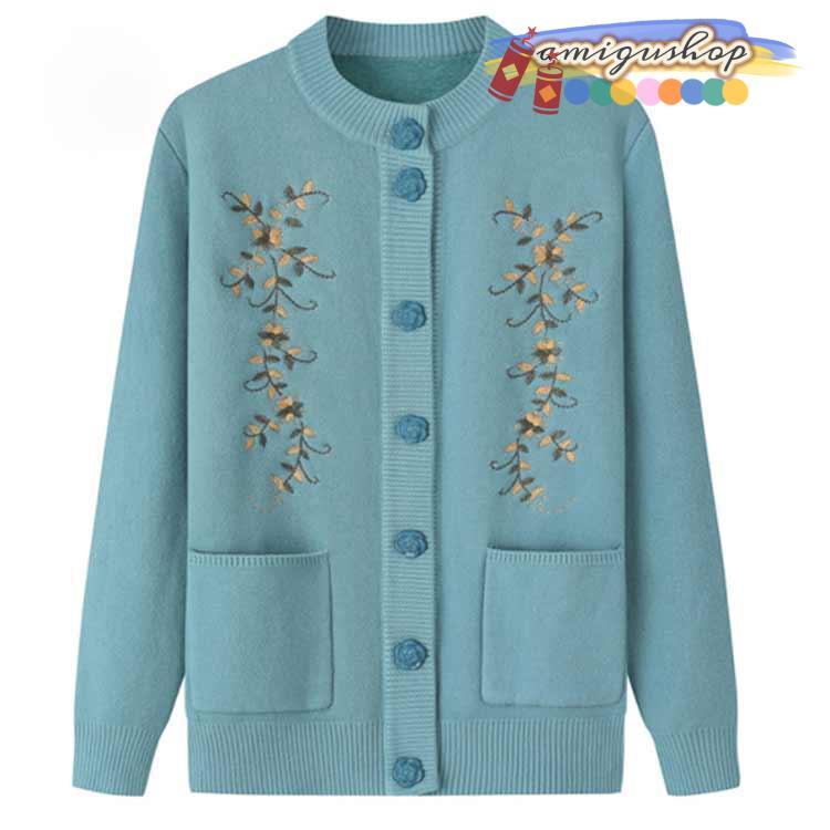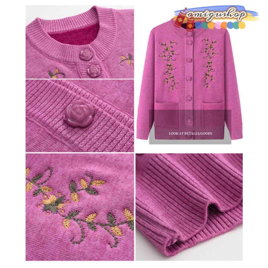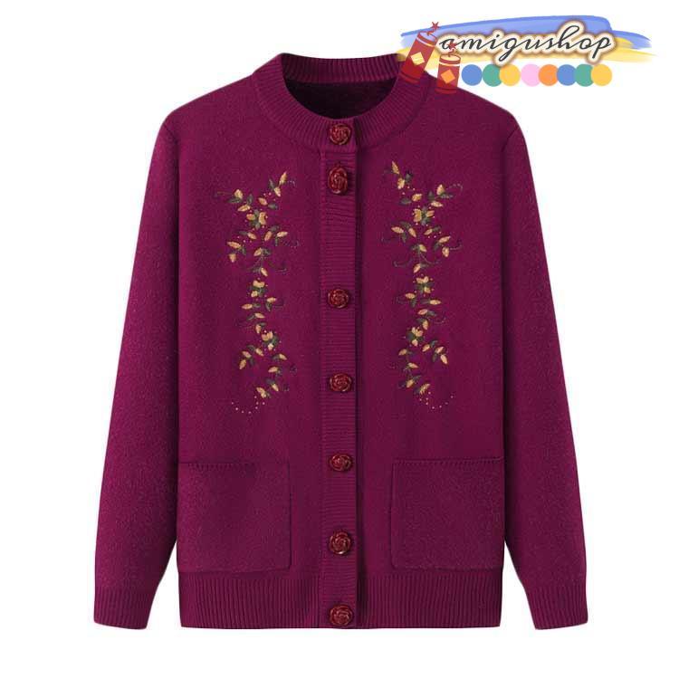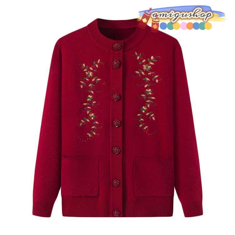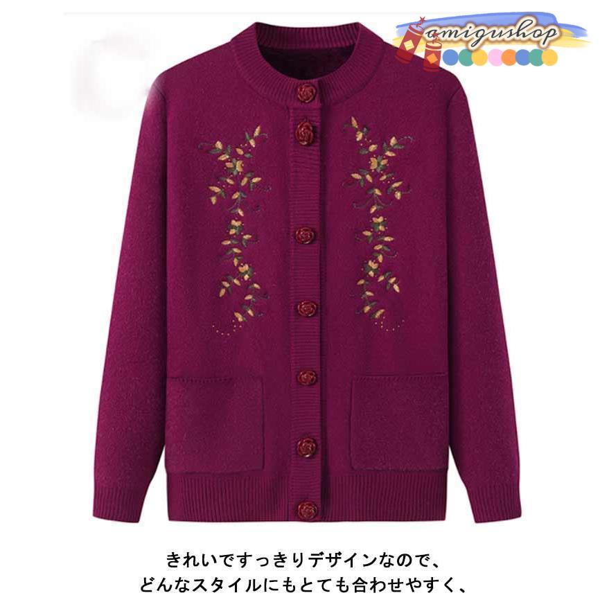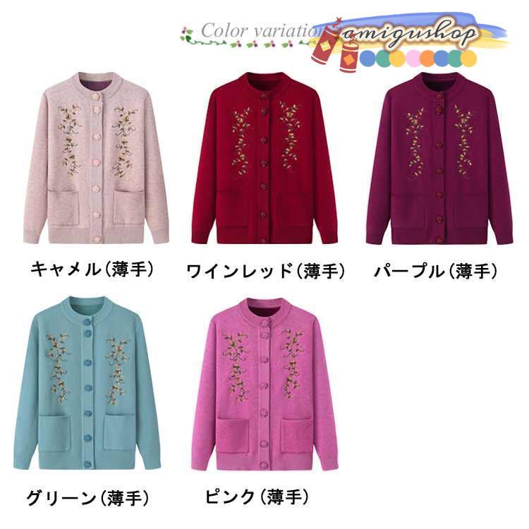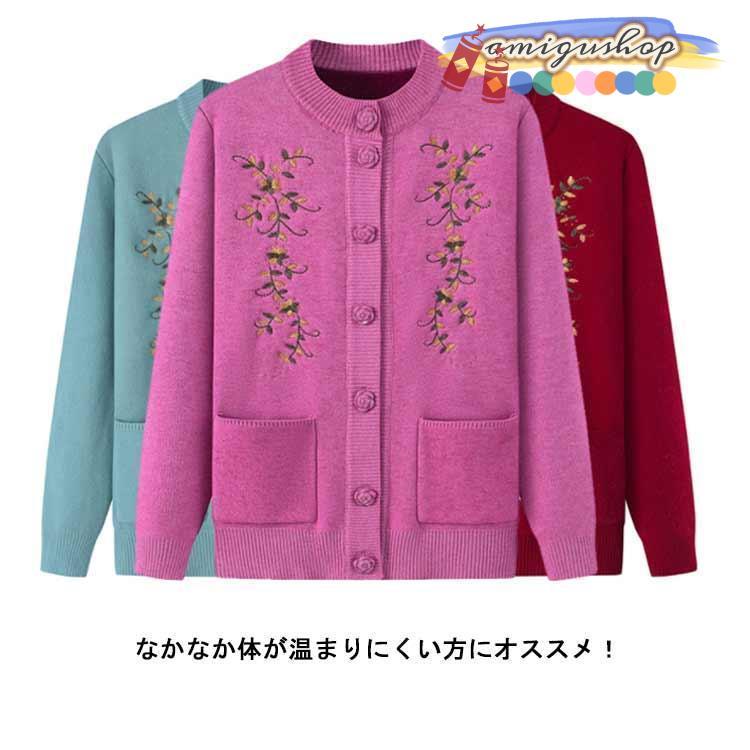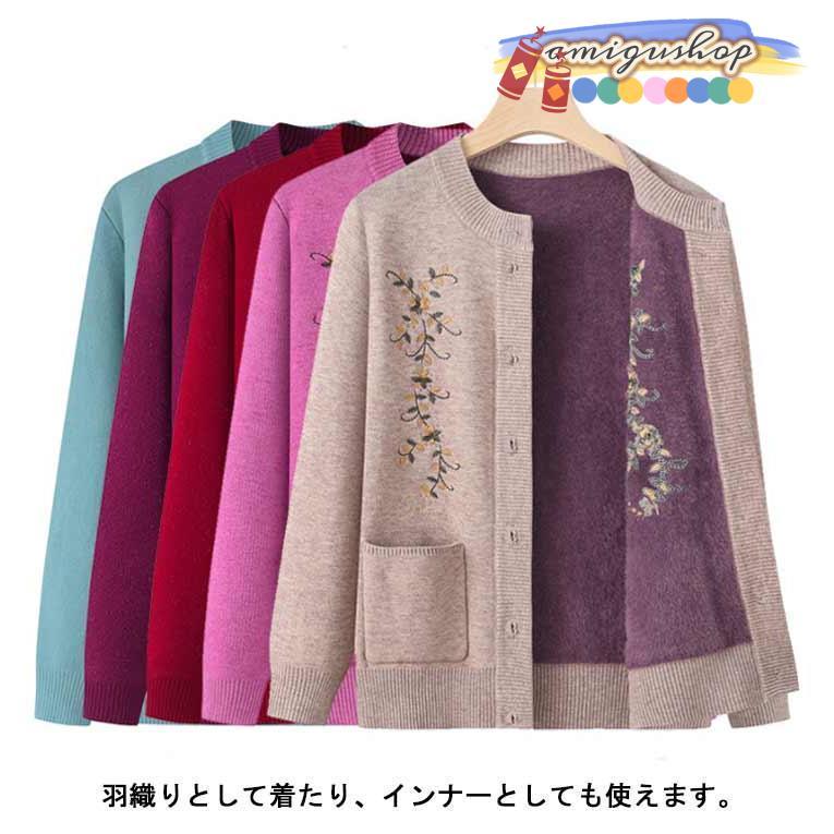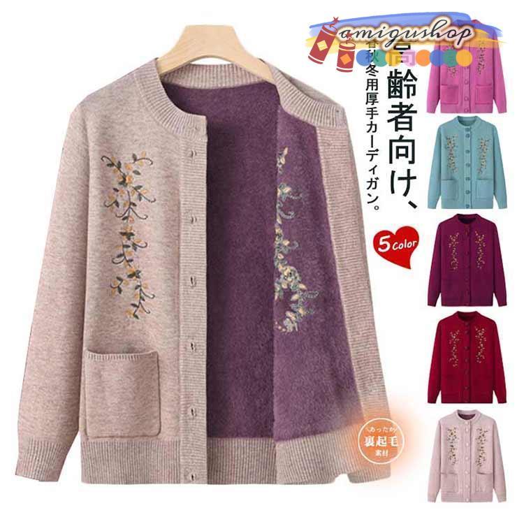 シニアファッション ニットカーディガン レディース 春 秋 冬 セーター ニット 花柄 前開きボタン 薄手 裏起毛 暖かい おばあちゃん 防寒 寒さ対