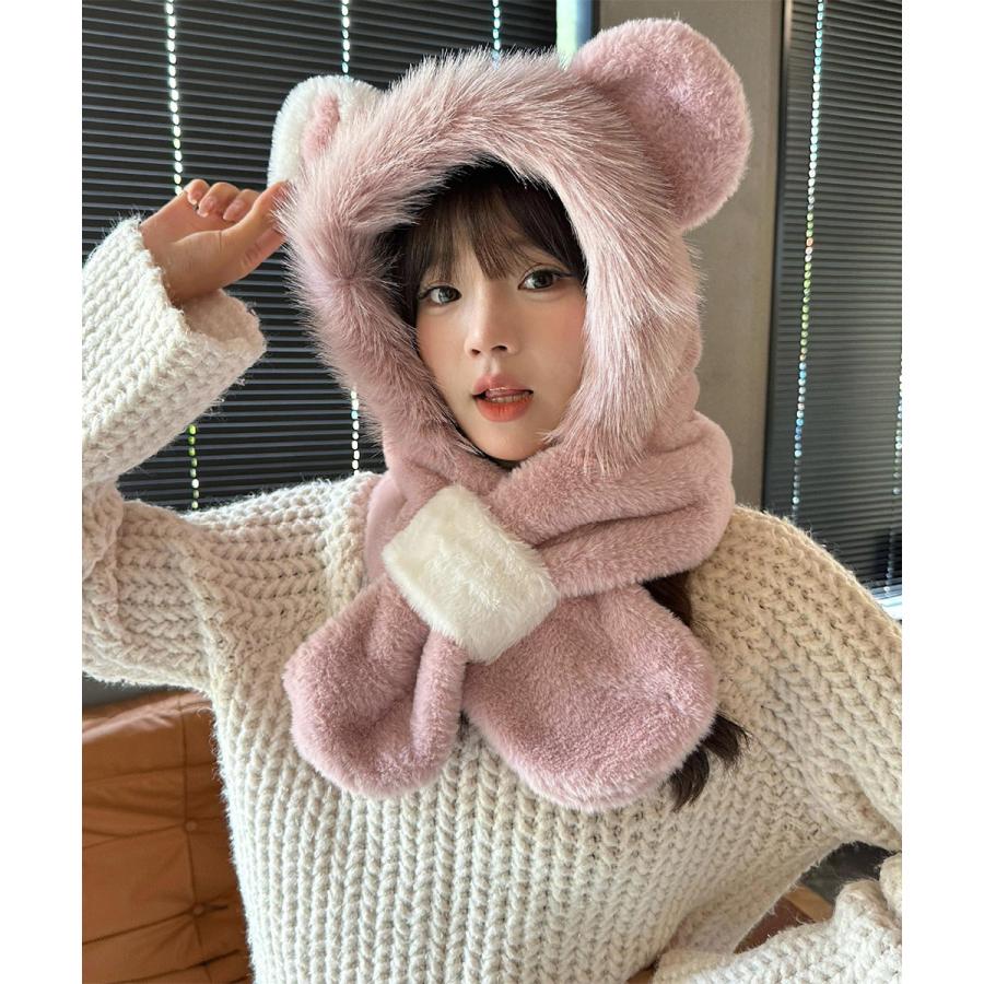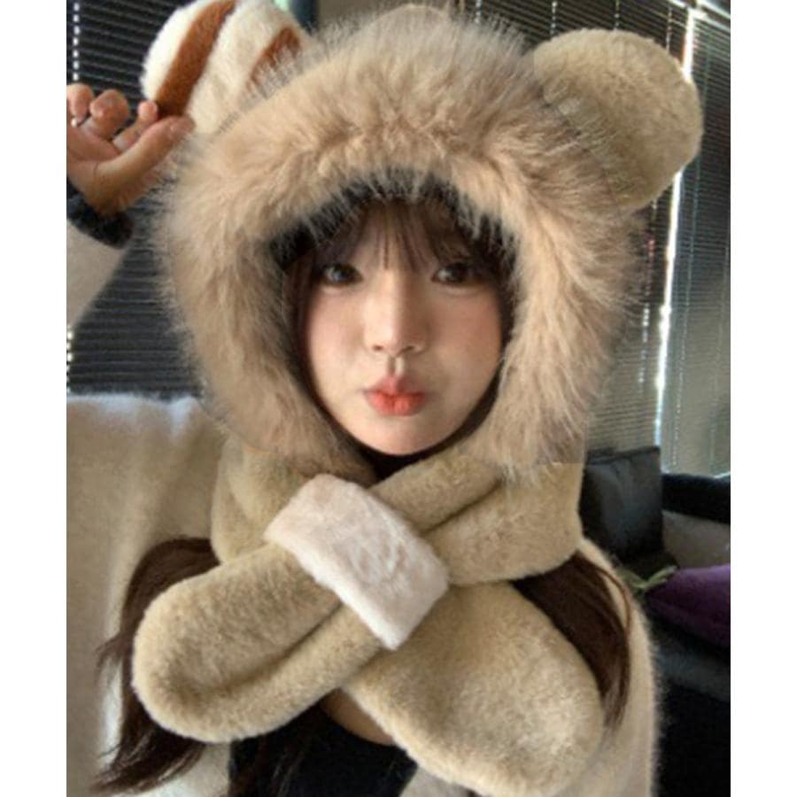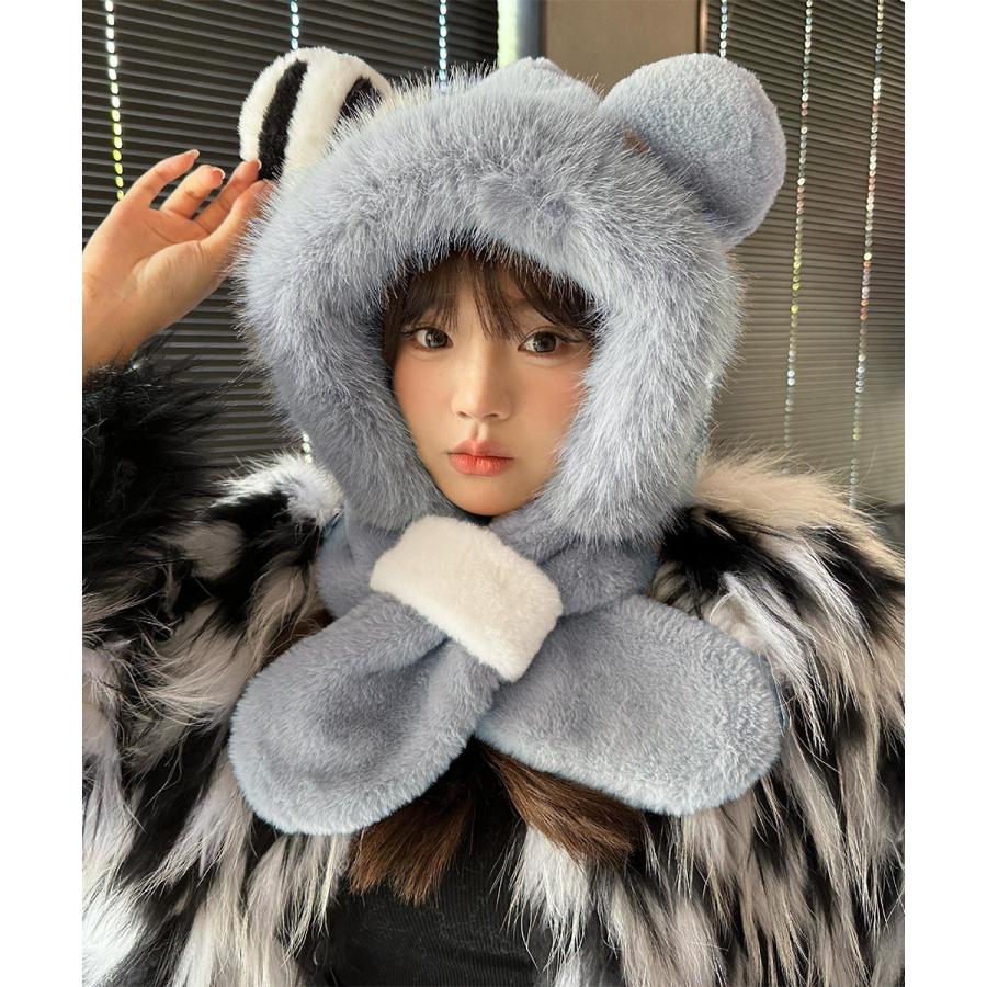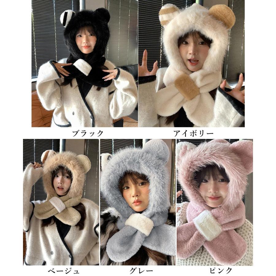 人气 新作 くまみみ帽子 マフラー付きファー帽子暖か スヌード