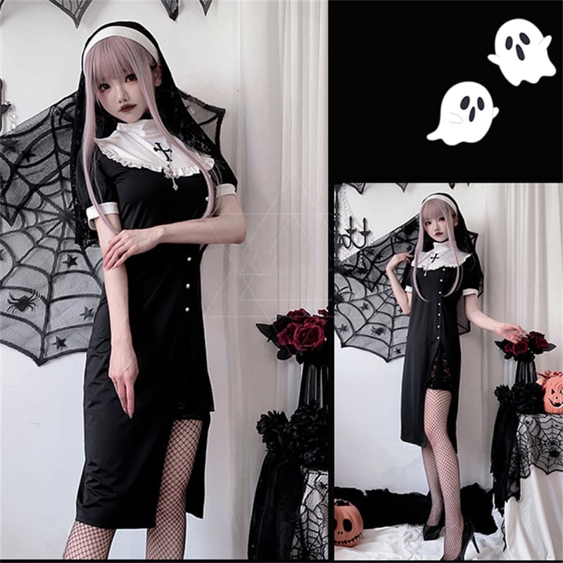 2024 短纳期 ハロウィン 修道女 仮装 コスチューム 衣装 学園祭 文化祭 制服 切り替え ワンピース かわいい コスプレ ハロウィン