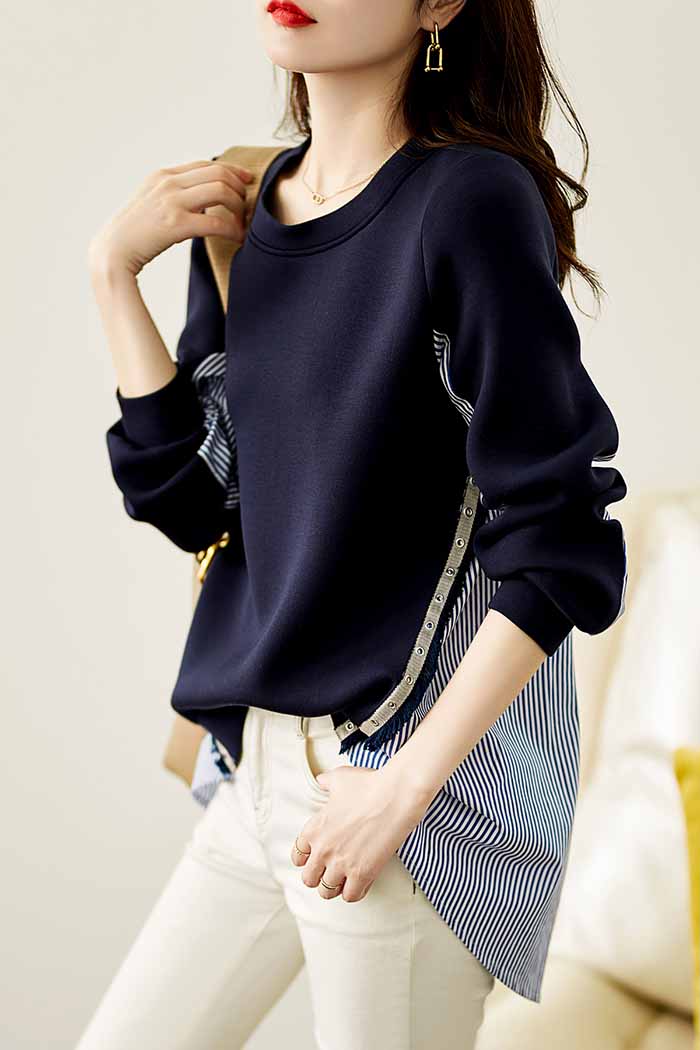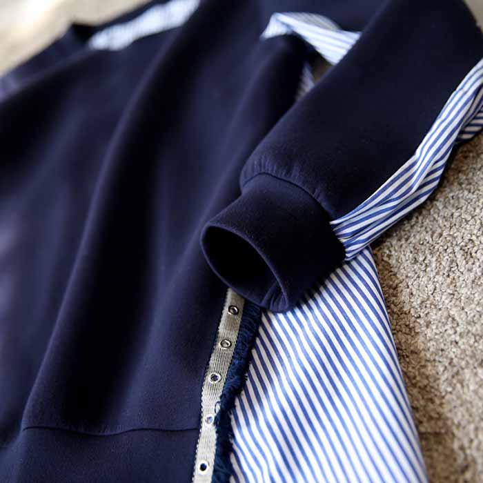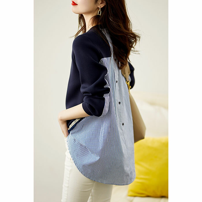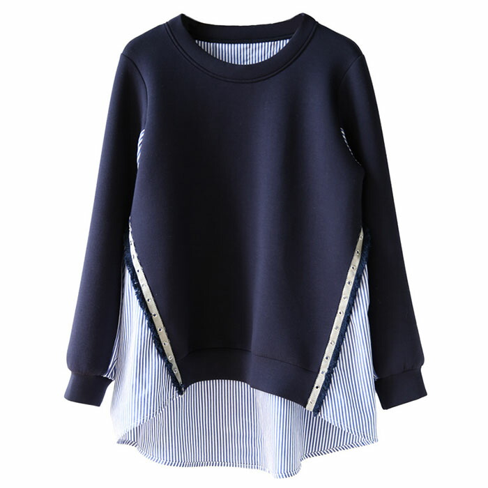 トレーナー Tシャツ プルオーバー 切り替え ハイカラー トップス ストライプ 重ね着風 シャツ風 レディース ゆったり レイヤード シンプル ゆる カジュアル 普段着 可愛い 綿混 柔らかい 着心地