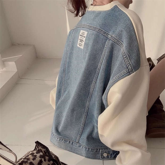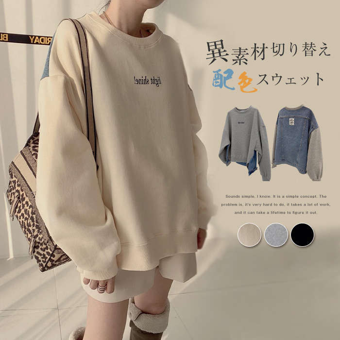 異素材切り替え トップス スウェット トレーナー レディース 春 秋 デニム シンプル 長袖 レディース メンズ ゆったり 大きいサイズ ユニセックス きれいめ 通勤 ゆったり 切り替えスウェット 体