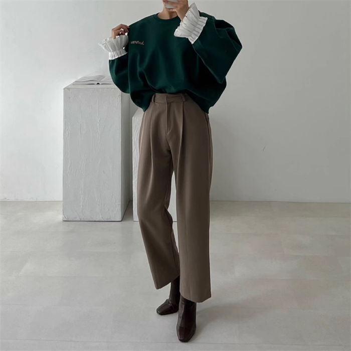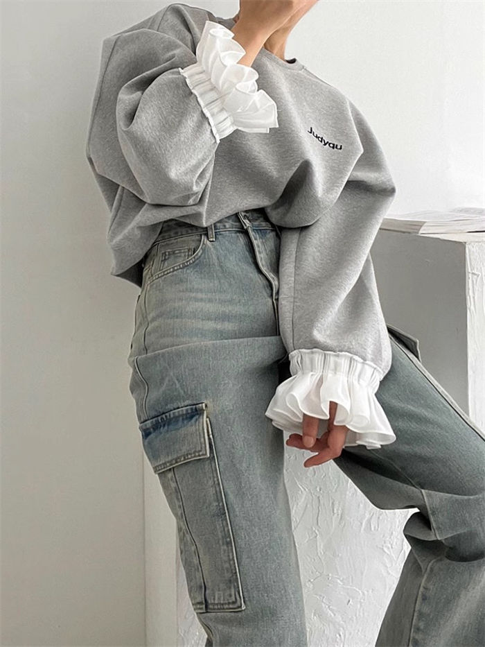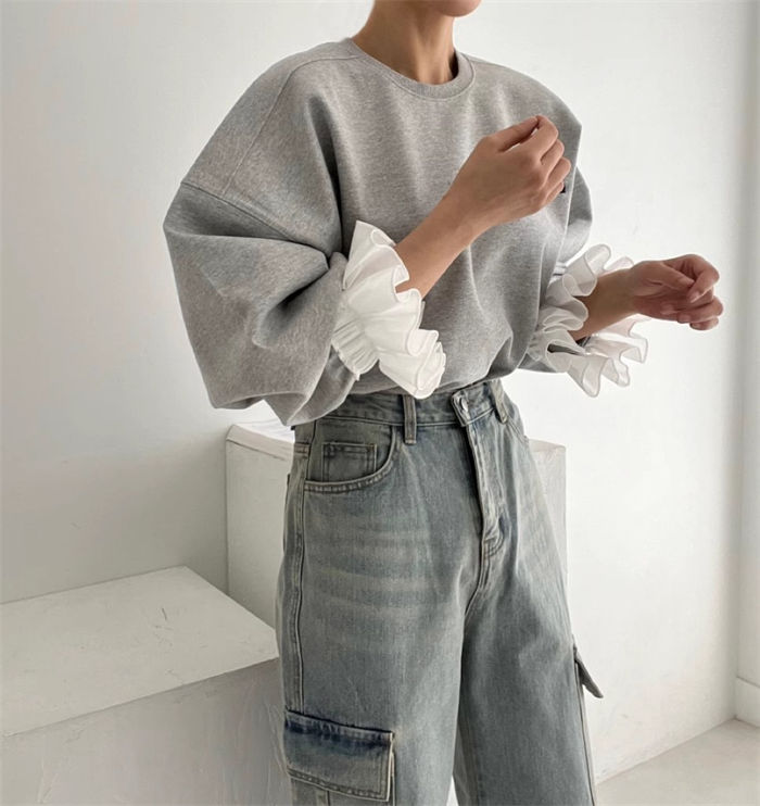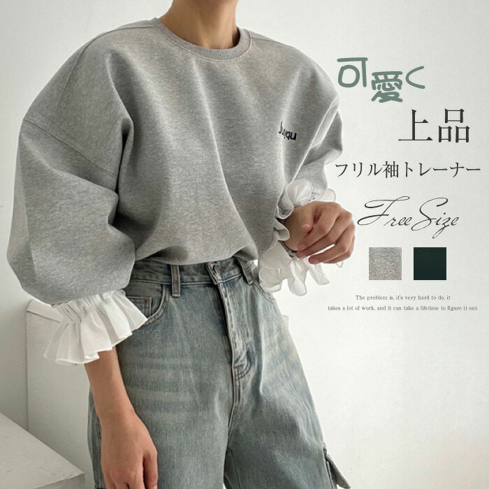 フリル袖トレーナー レディース 春 秋 長袖 トップス スウェット トレーナー 異素材切り替え フリル袖 無地 シンプル ゆったり カジュアル ボリューム袖 大きいサイズ ゆるっと 重ね着風 着瘦せ