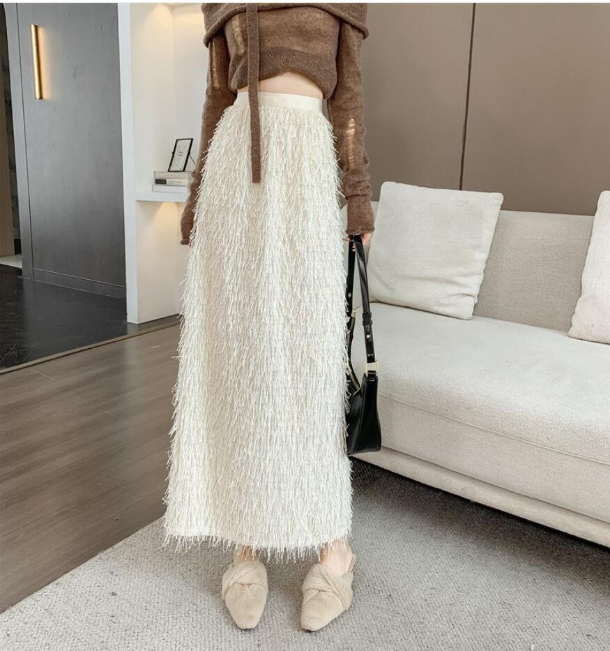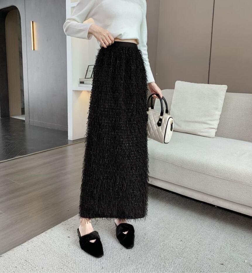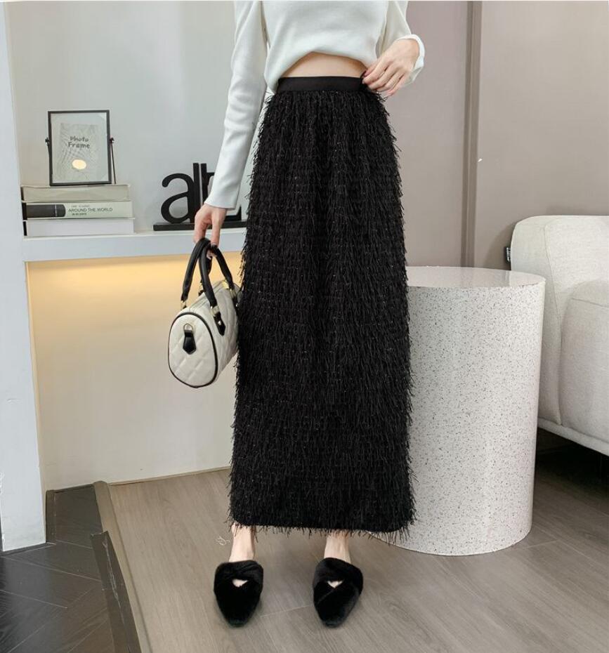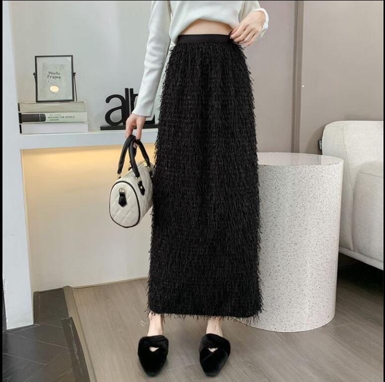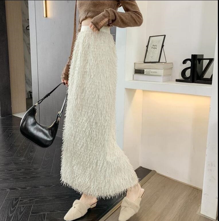 秋冬のギャザーフリンジオーバーサイズ半身スカートレトロなストレートミディアムスカートコーデ ミディアムスカート