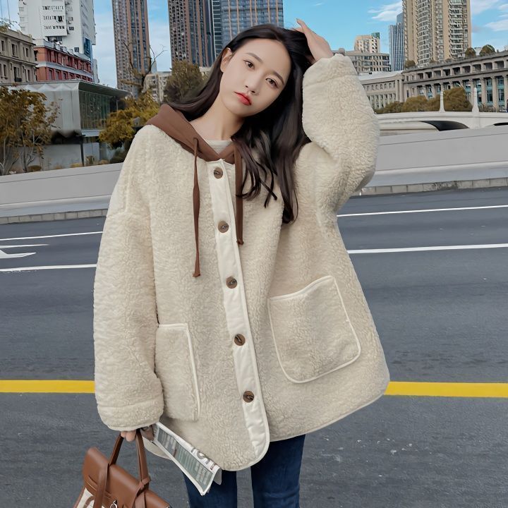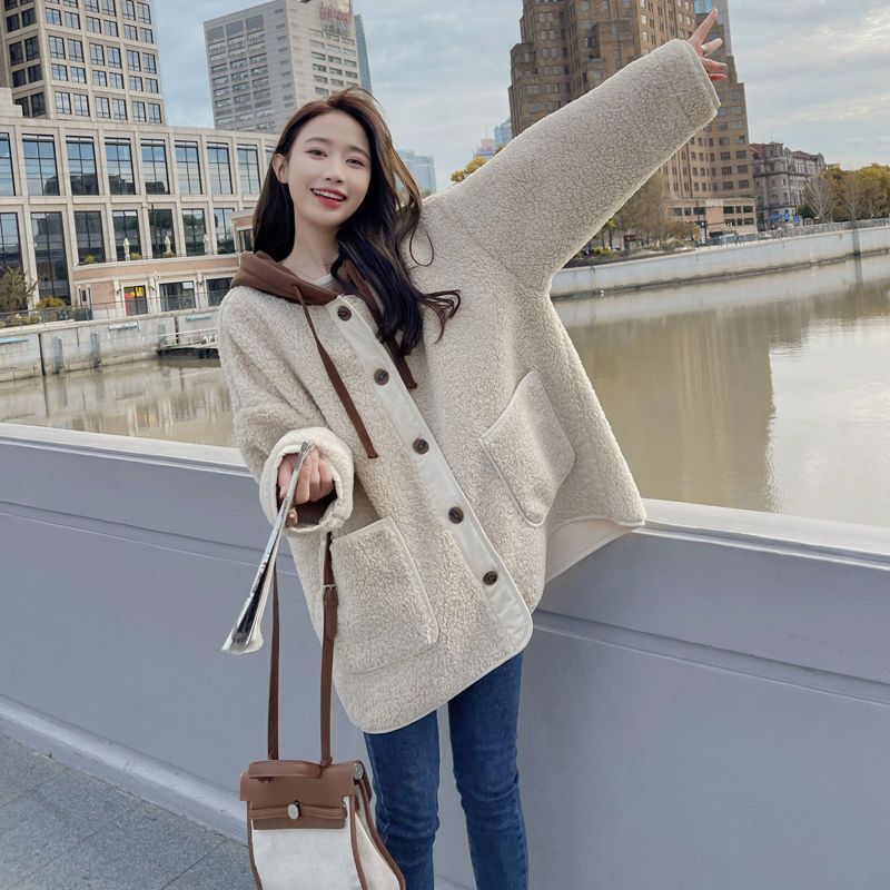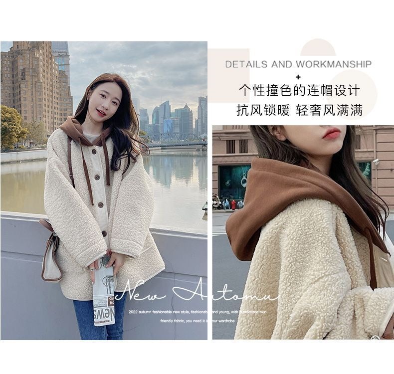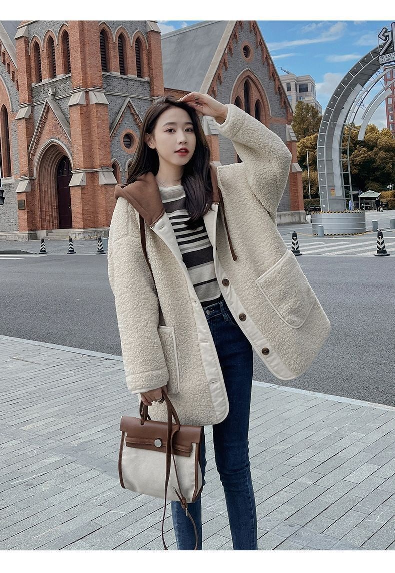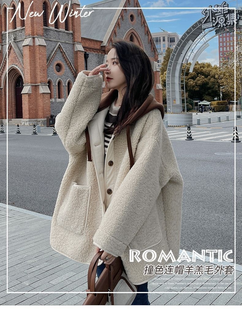 ラシャ 毛皮一体ラムコート秋冬2024新モデル韓系ゆったりパッチワークデザイン感フード付き厚手の上着 トレンチコート