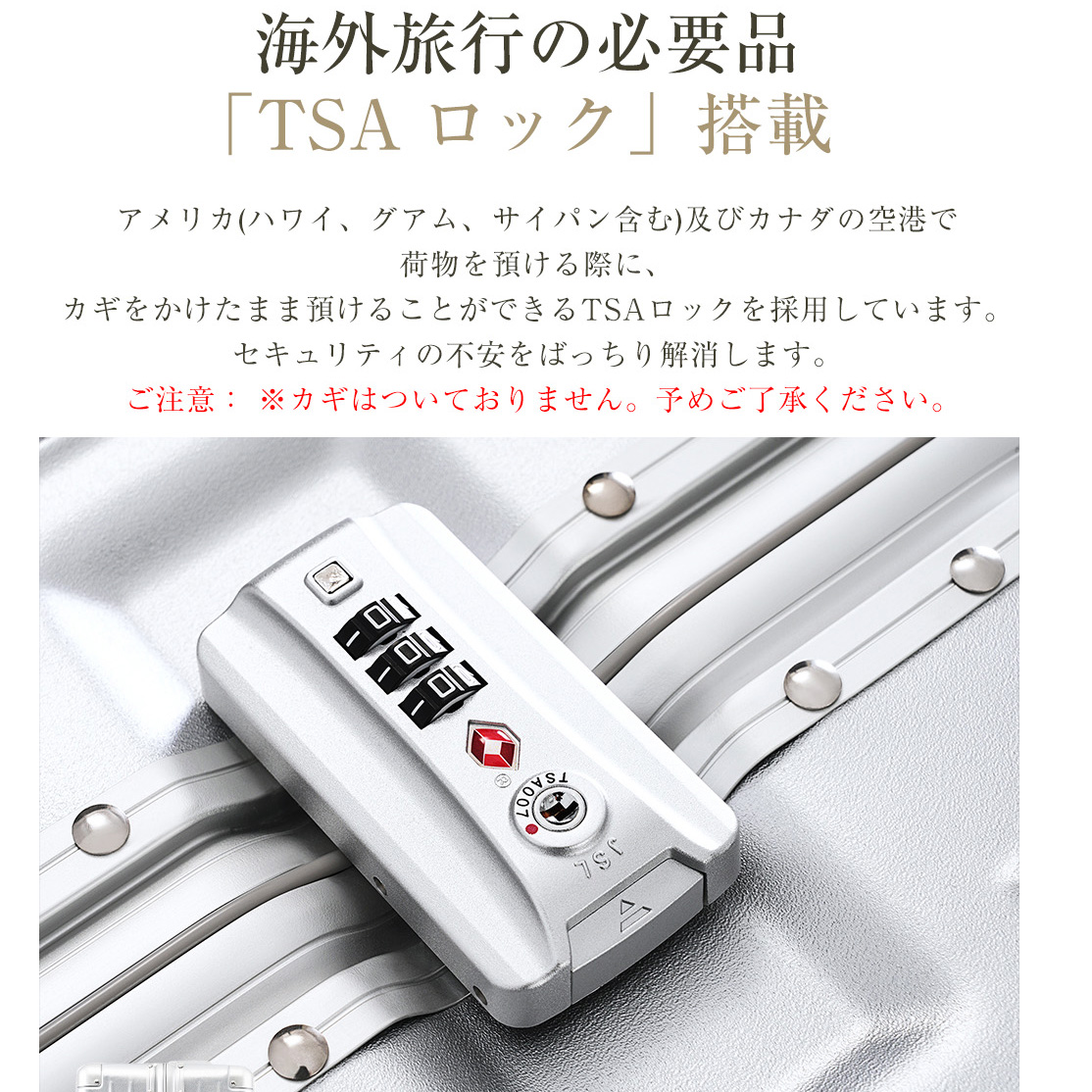 POINT7 【海外旅行の必要品「TSAロック」搭載】アメリカ(ハワイ、グアム、サイパンを含む)及びカナダの空港で荷物を預ける際に、カギをかけたまま預けることができるTSAロックを採用しています。