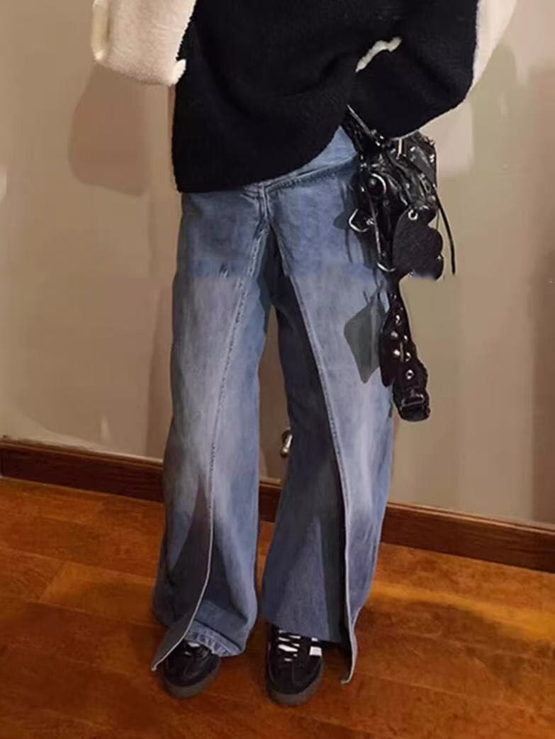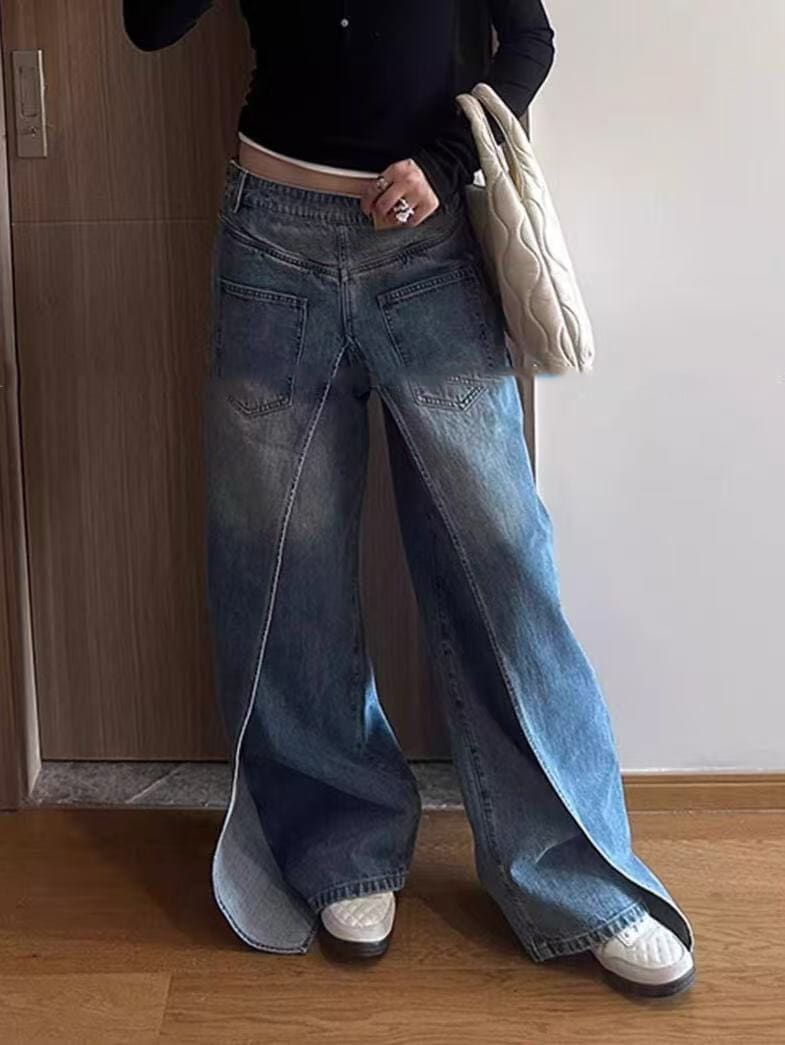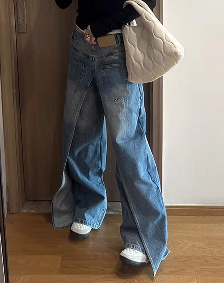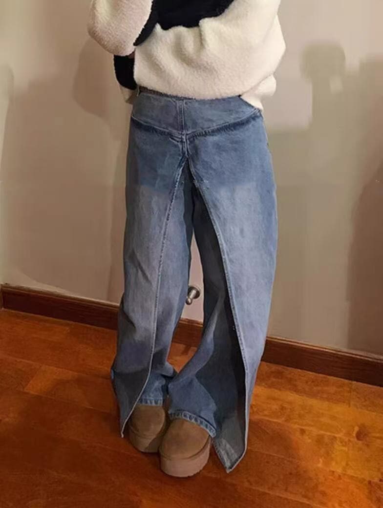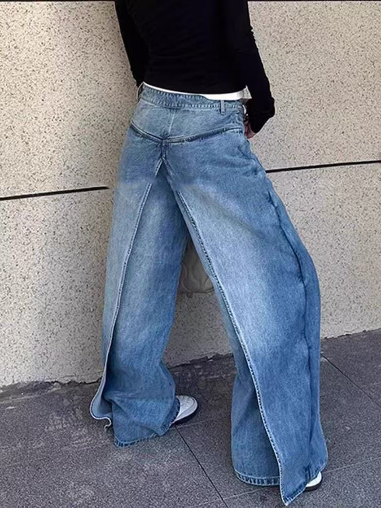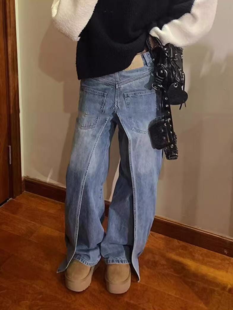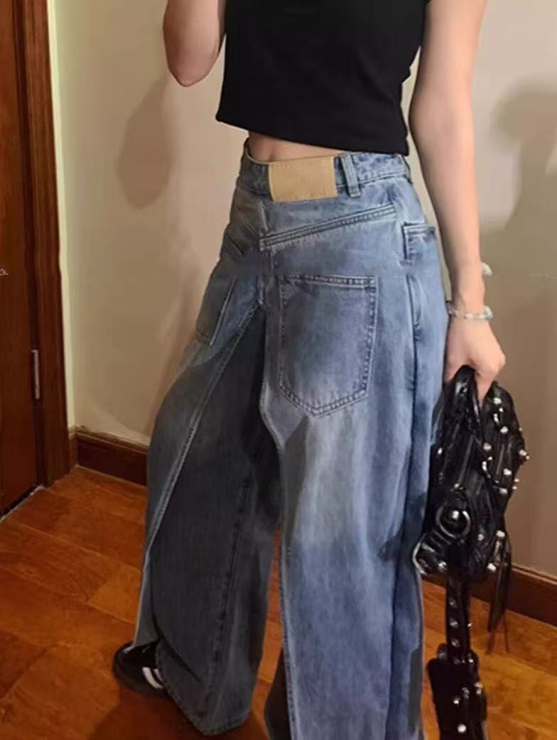 前後 両面 着用ジーンズ ジーンズ レディース デザイン パンツ 春と秋 ニセツーピース ワイドパンツ デニム ジーンズ