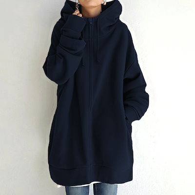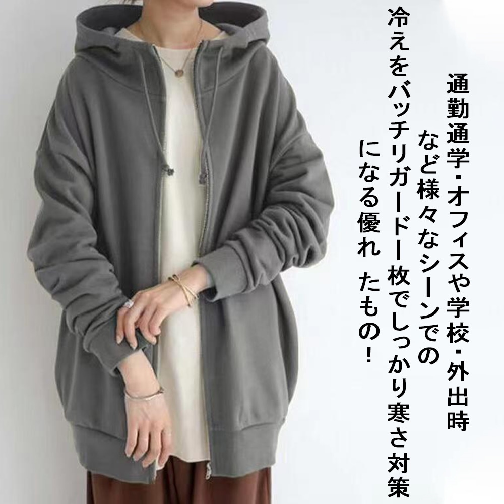 パーカー レディース ジップアップパーカー 重ね着風 ロング丈 パーカー フード付き 無地 秋冬 アウター 部屋着 大きいサイズ ゆったり チュニック