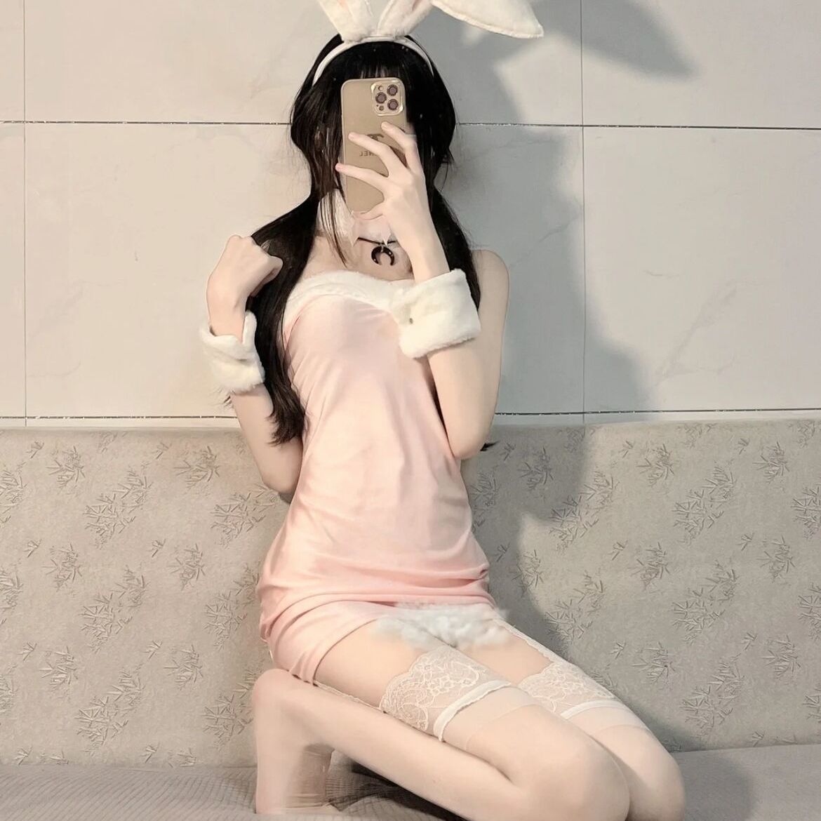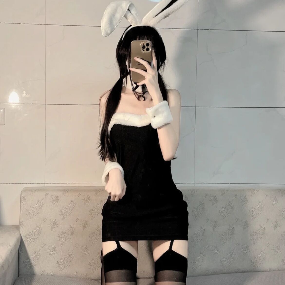 Color: ブラック【ヘアバンド、スカート、ネックリング、ブレスレット】 ピンク【ヘアバンド、スカート、ネックリング、ブレスレット】 黒のフルセット + 黒のストッキング ピンクのフルセット+白ストッキング 黒のコンプリートセット + お揃いのガーターソックス ピンクのコンプリートセット + おそろいのガーターストッキング