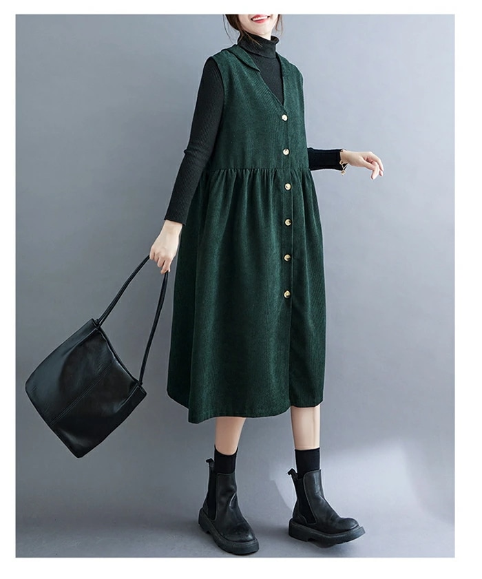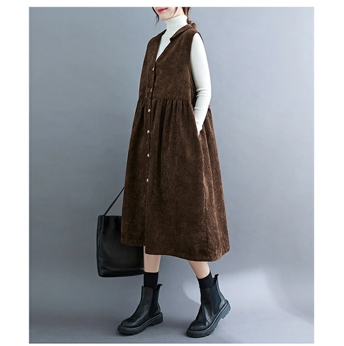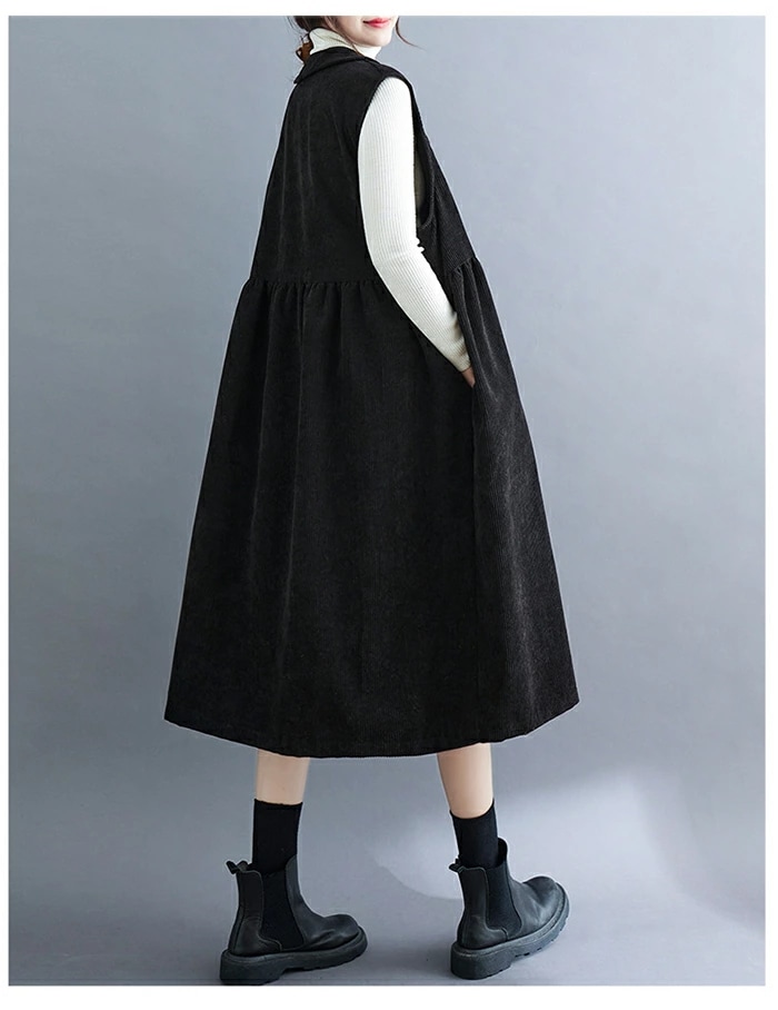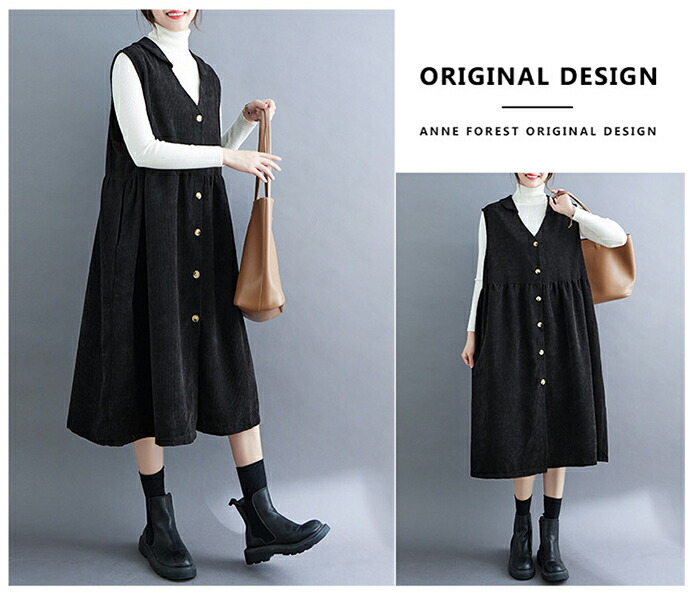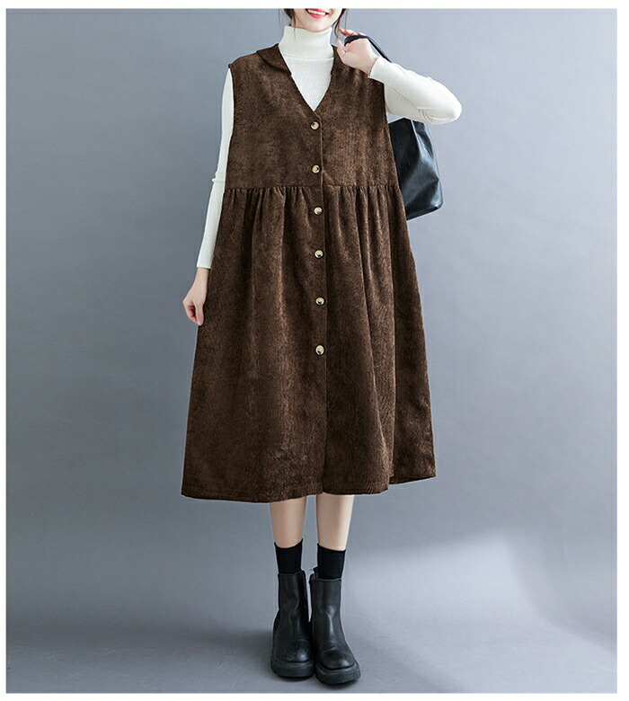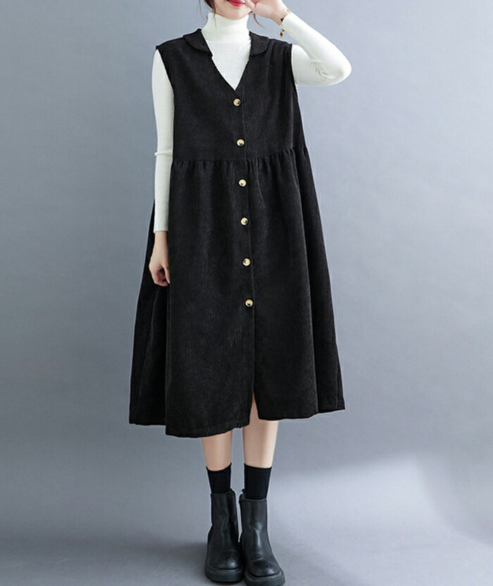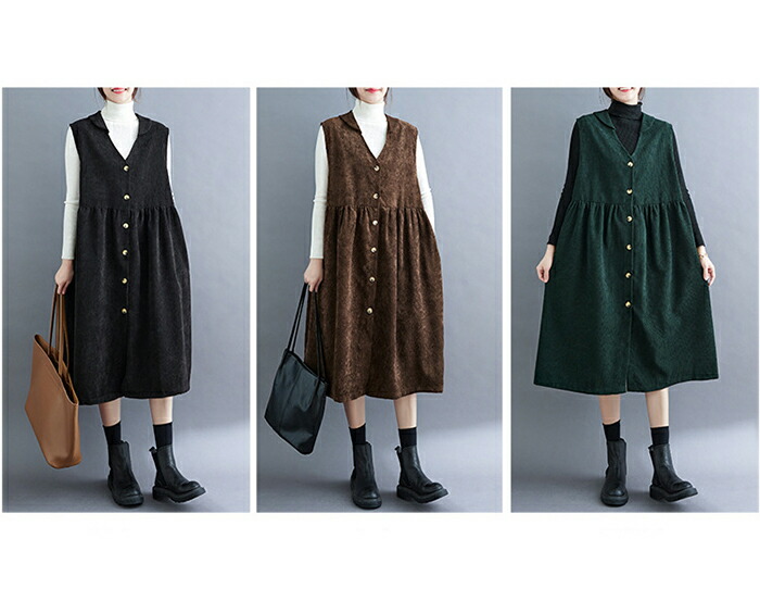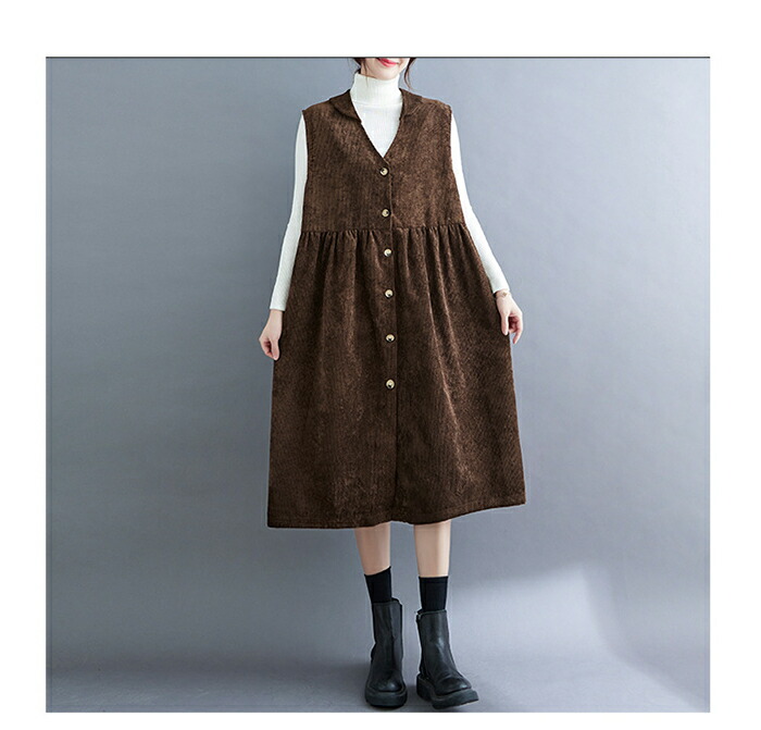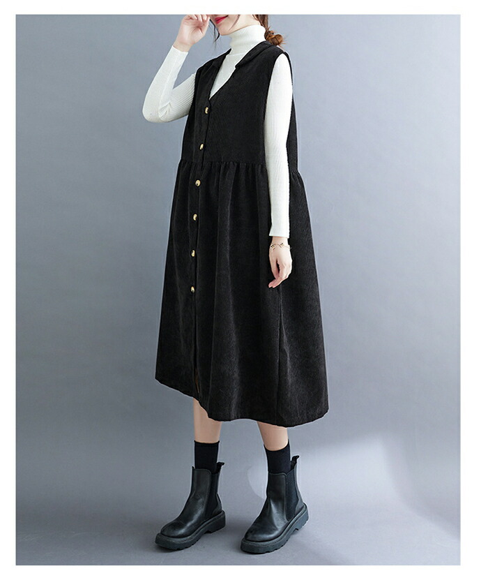 ジャンパースカート コーデュロイ レディース ジャンスカ vネック 無地 秋冬 サロペット ロングワンピース 大きいサイズ ノースリーブ ミモレ丈 レイヤード 重ね着 ゆったり カジュアル 体型カバー
