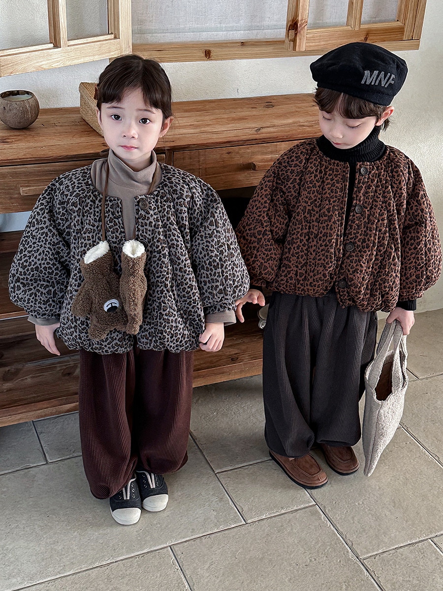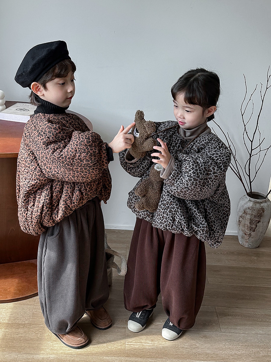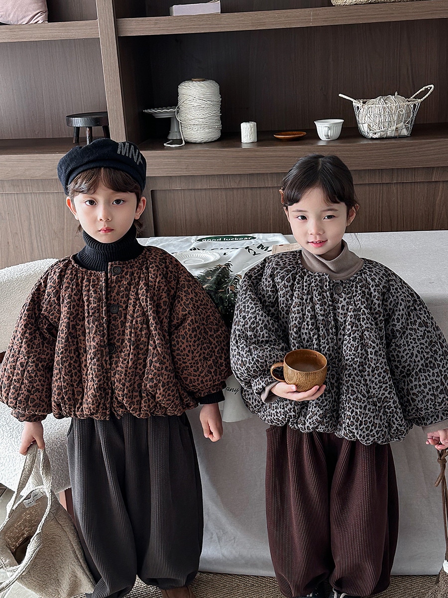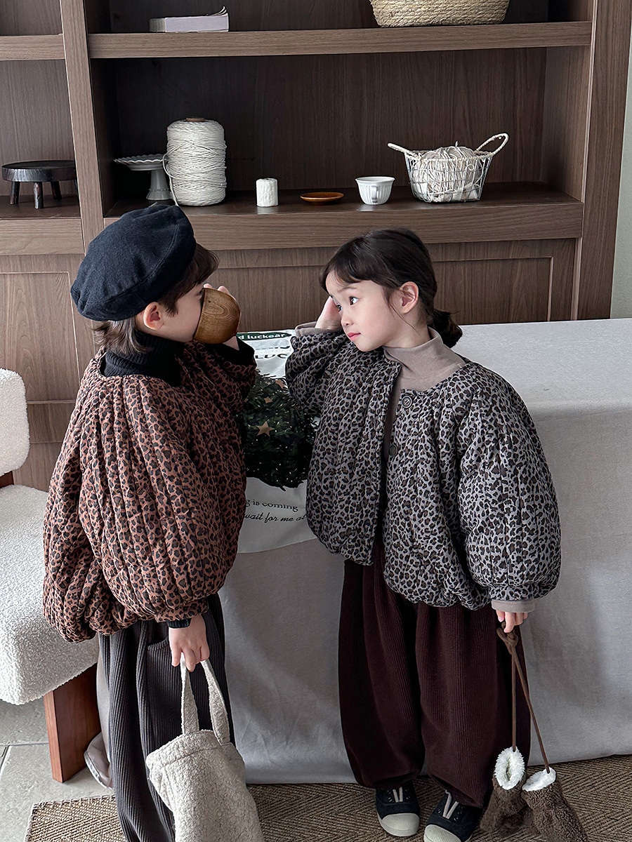 2024子供の冬の新作ヒョウ柄綿入れの中小童森系レトロなコートのパン服裏起毛 アウター