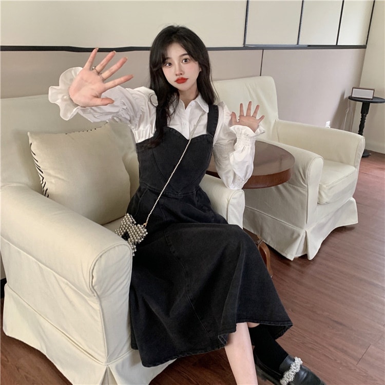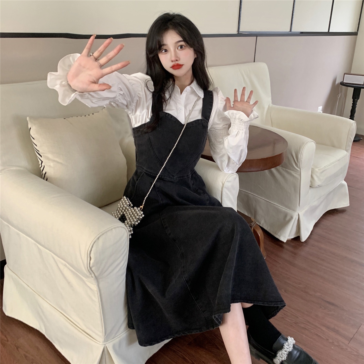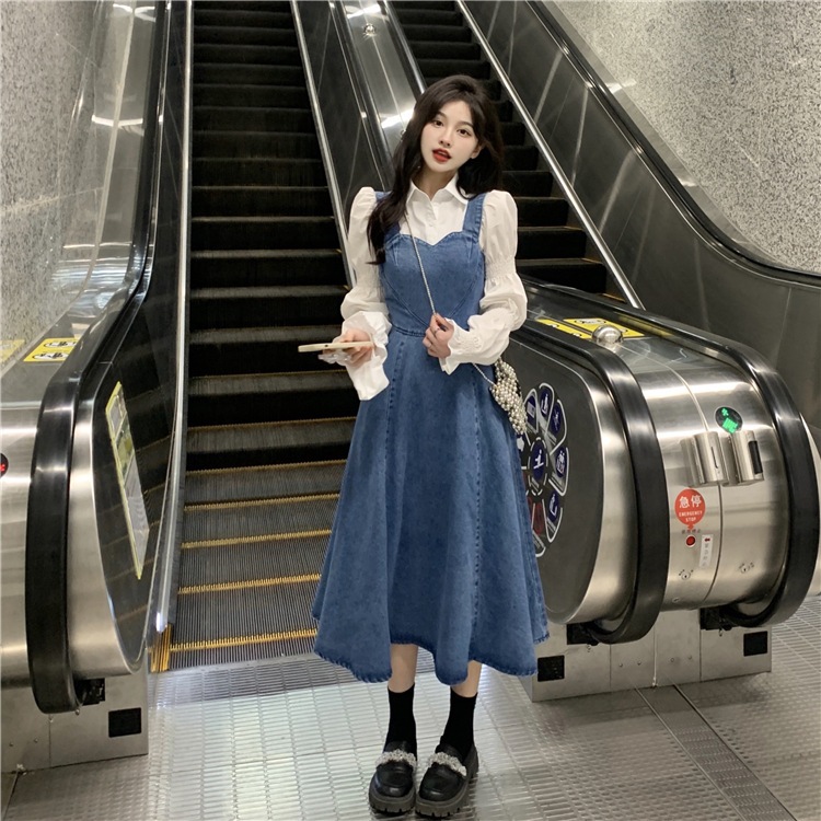 愛のデニムの背もたれのスカートの女性のフランスのデザイン感の小さい大衆の復古の優しい甘辛い港の味のchiのロングスカートのワンピース デニムスカート