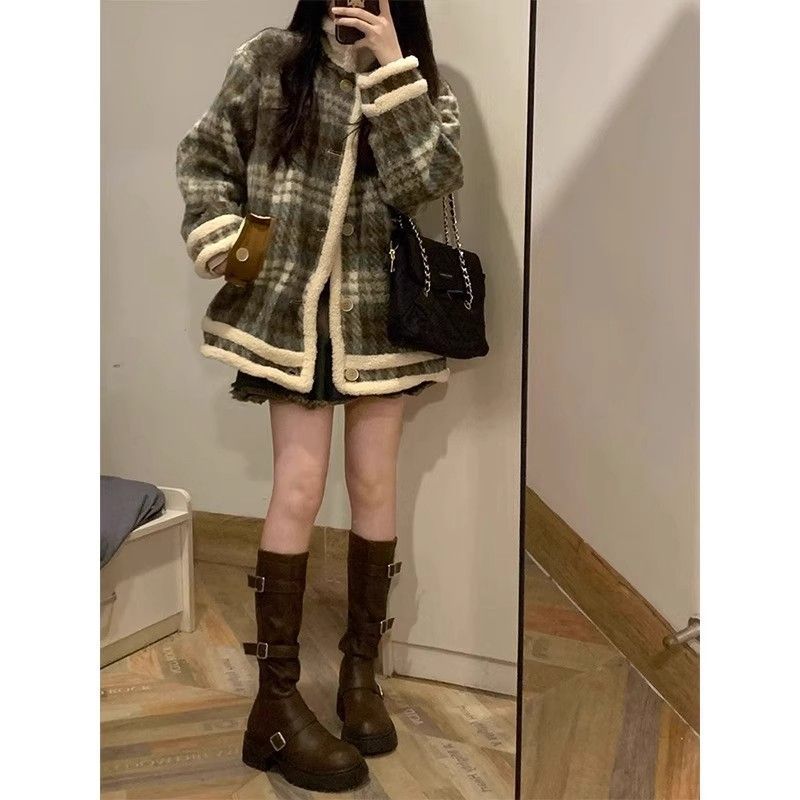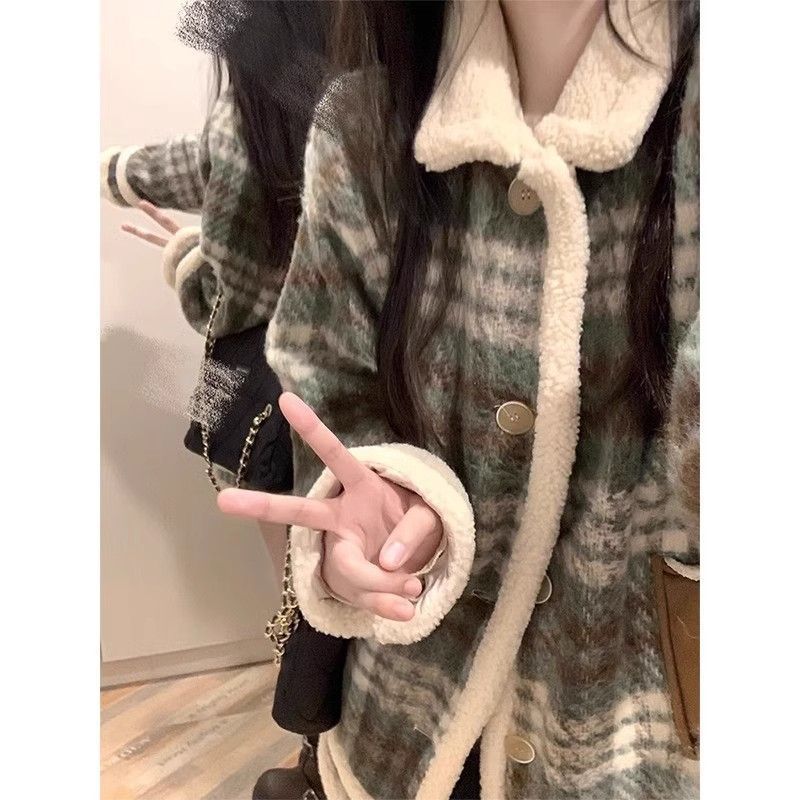 冬 新作 日系 レトロ アウター ジャケット 裏起毛 レディース 厚手ラシャアウターラムズウールチェック 流行り トレンチコート