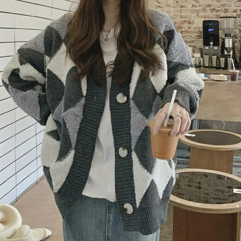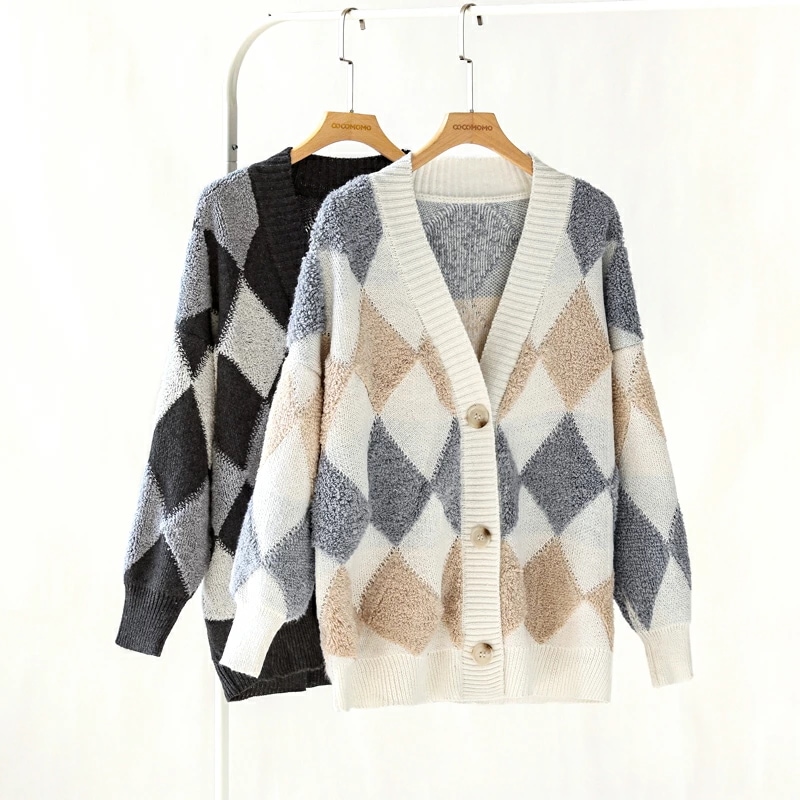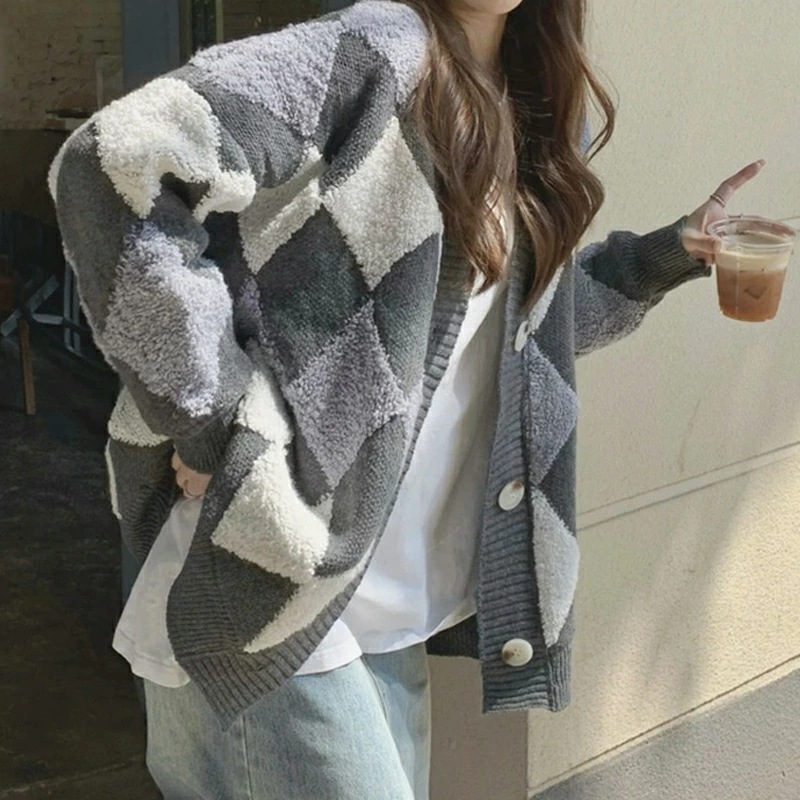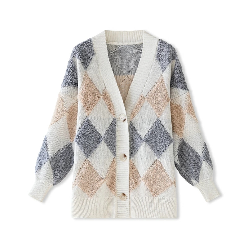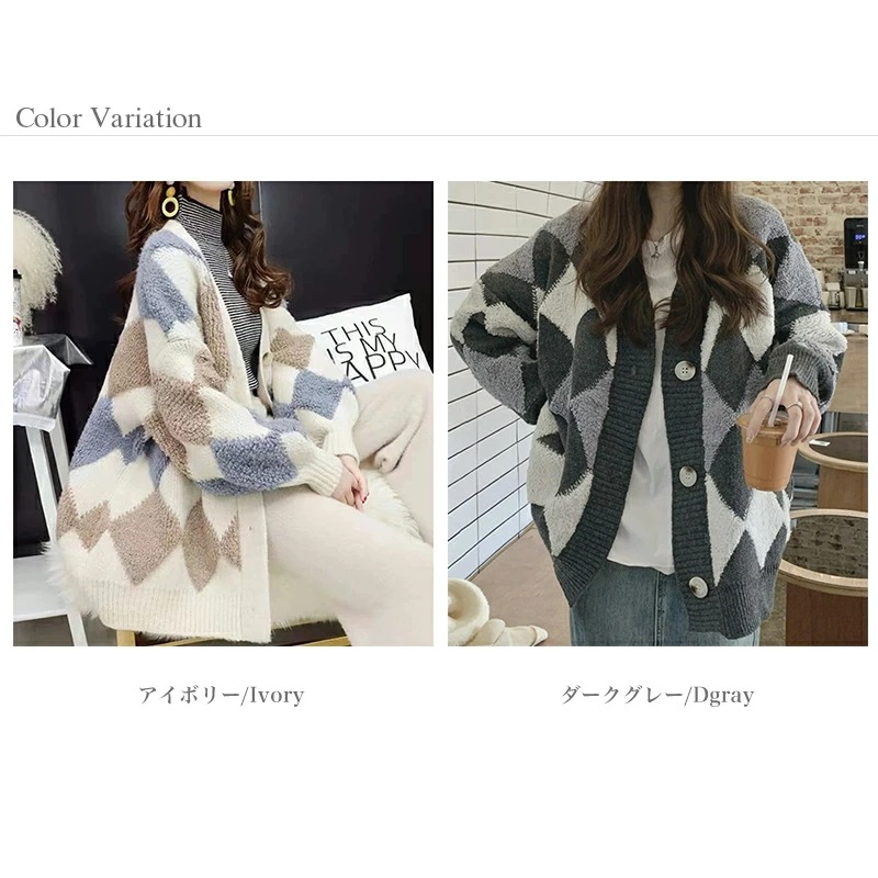 アーガイルカーディガン カーディガン オーバーサイズ アーガイル ニットカーディガン ゆったり ニット レディース 長袖 Vネック ドロップショルダー アーガイル柄