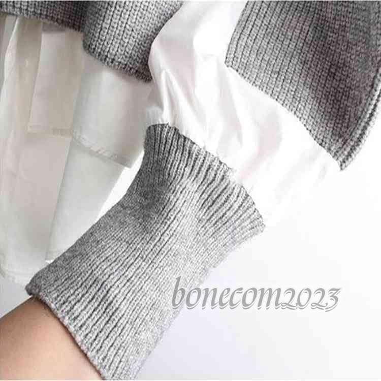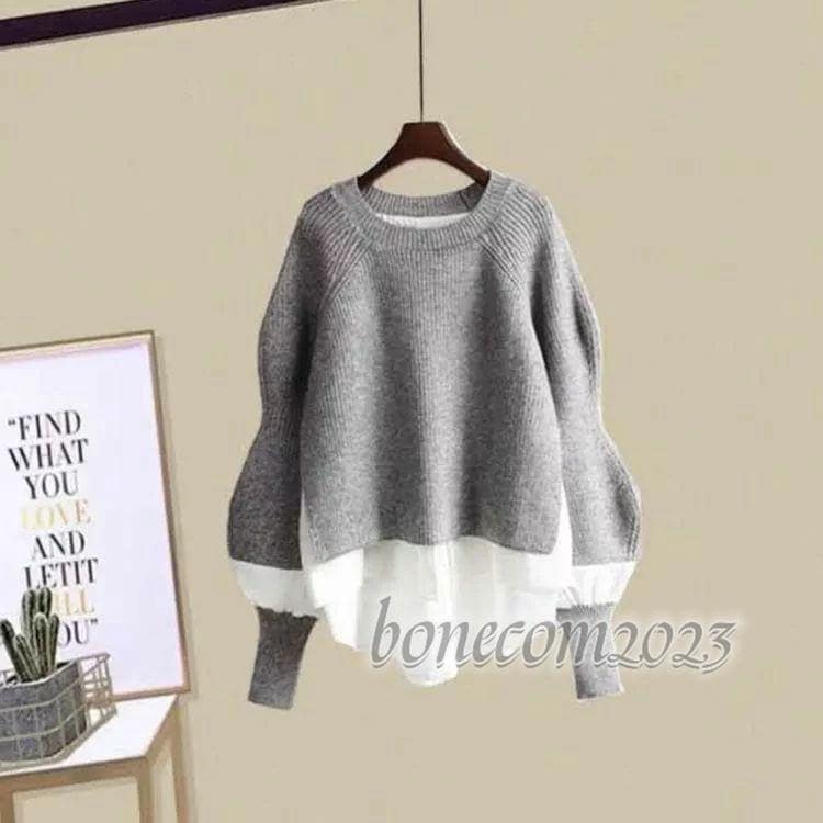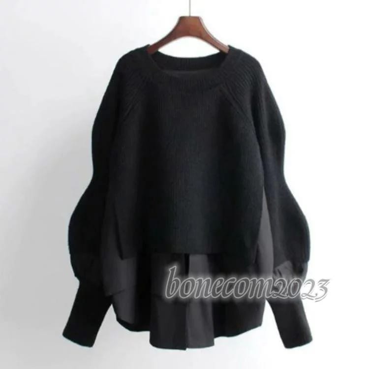 ゆったり セーター ニット ふんわり プルオーバ ブラウス バルーンスリーブ レディース クルーネック 長袖 ニットドッキング バルーン袖 レイヤード風 重ね着風
