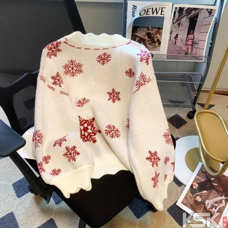 2025クリスマス新型赤い秋冬セーター雪花けだるいニット厚手ゆったりしたコート甘くて暖かい長袖上着潮 クリスマス