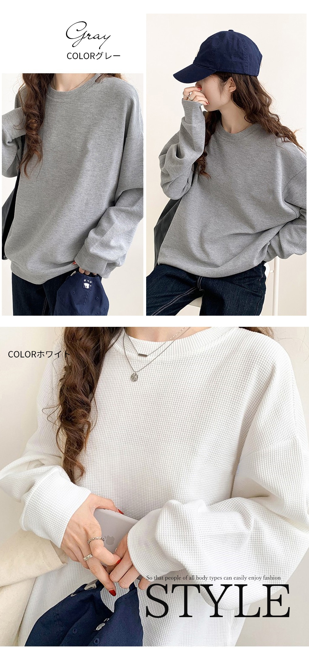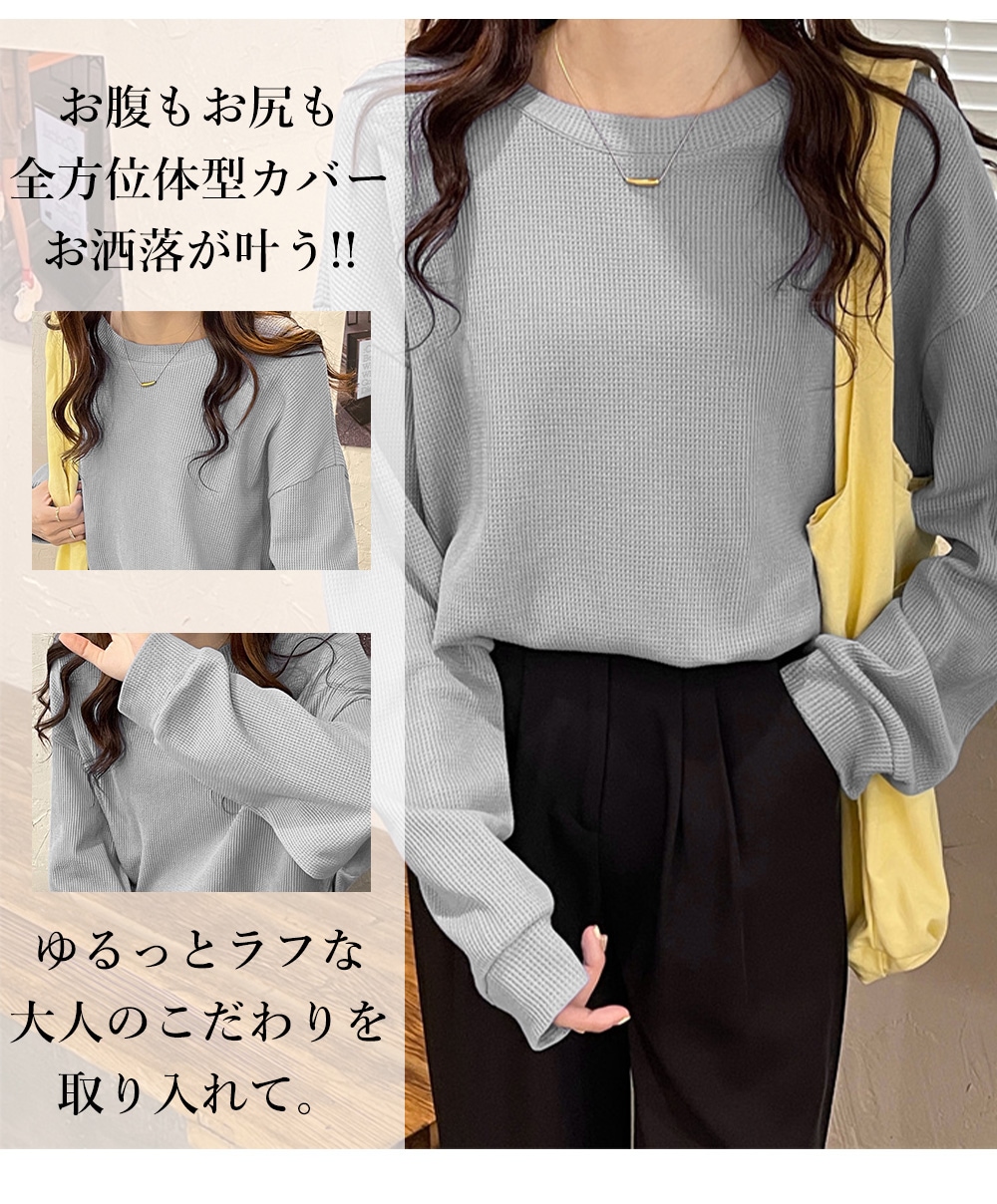 2枚同時買うと100円OFF ワッフル生地トップス長袖 メロウラウンドネック 長袖 メロウ フリル ボーダー ニット トップス カットソー ツートーン メロー おしゃれ 無地 かわいい シン