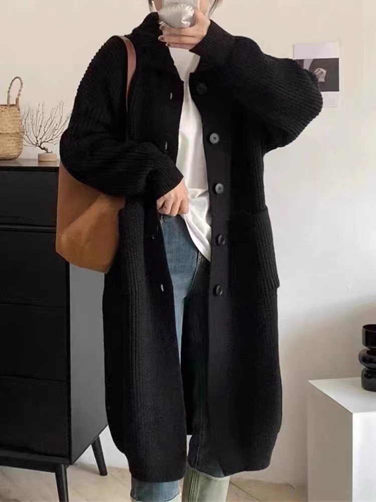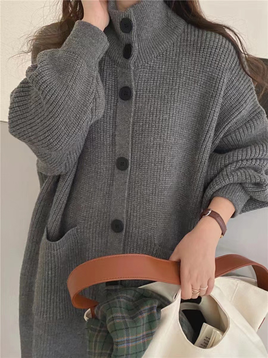 ロングニット カーディガン ゆったり こなれ感 ハイネック レトロ ボタン 長袖 セーター 暖かい 防寒保温 可愛い おしゃれ 韓国ファッション