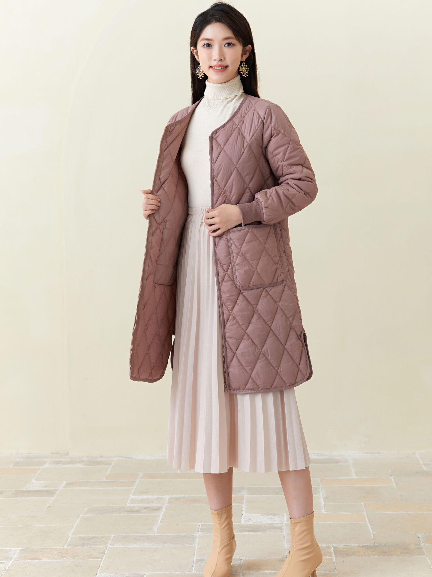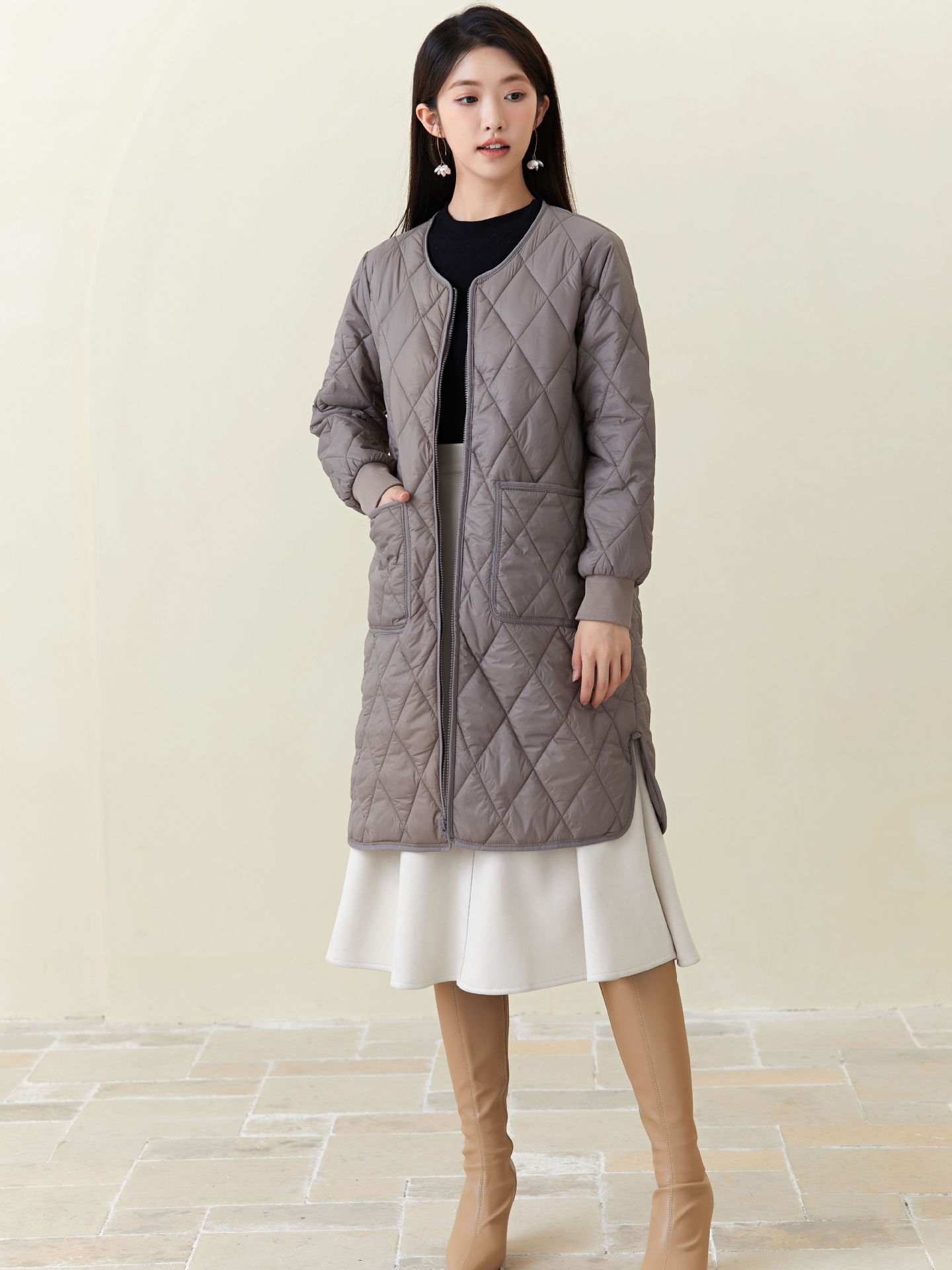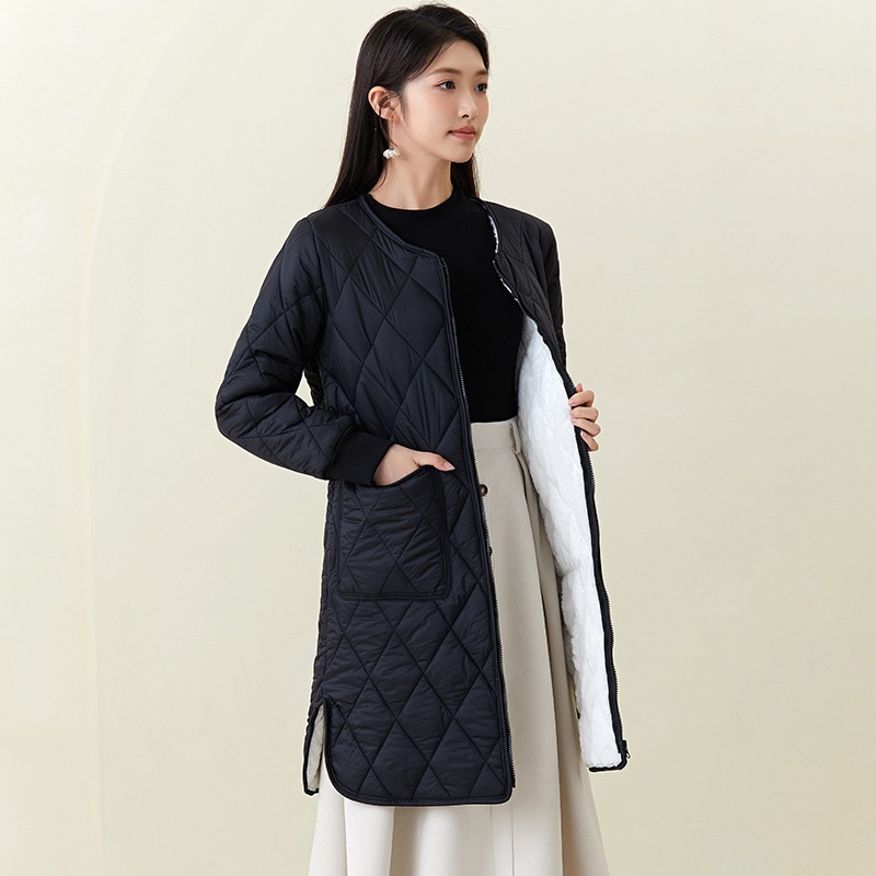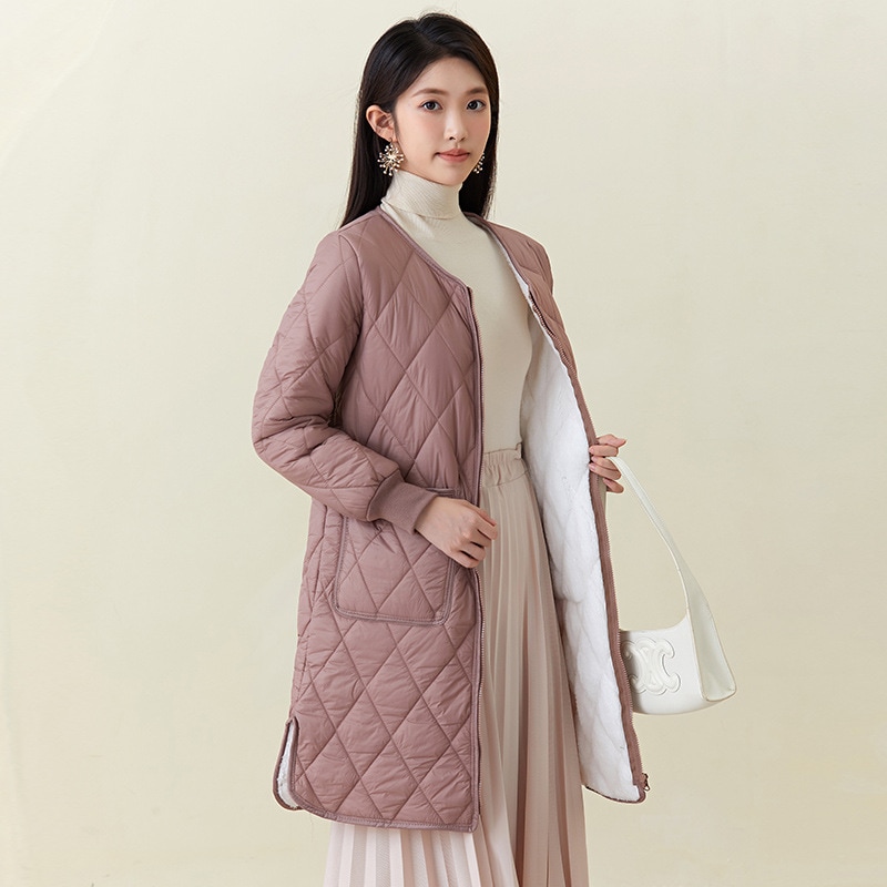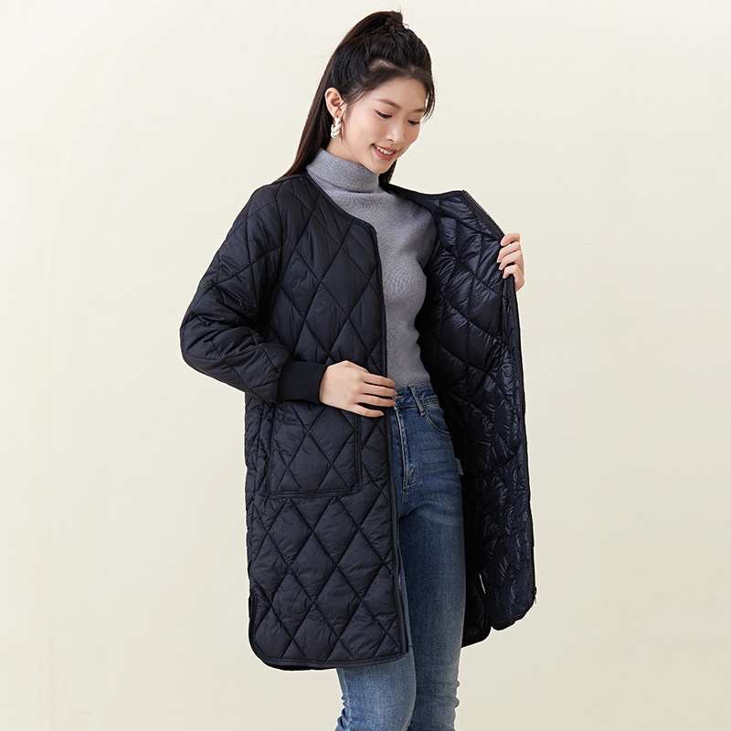 秋冬新品入荷レディース厚手ウォーム長袖中綿コートセミロング中綿アウター 超軽量 ルームウェア キルティングアウターノーカラージャケット