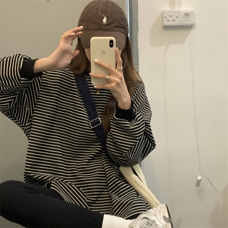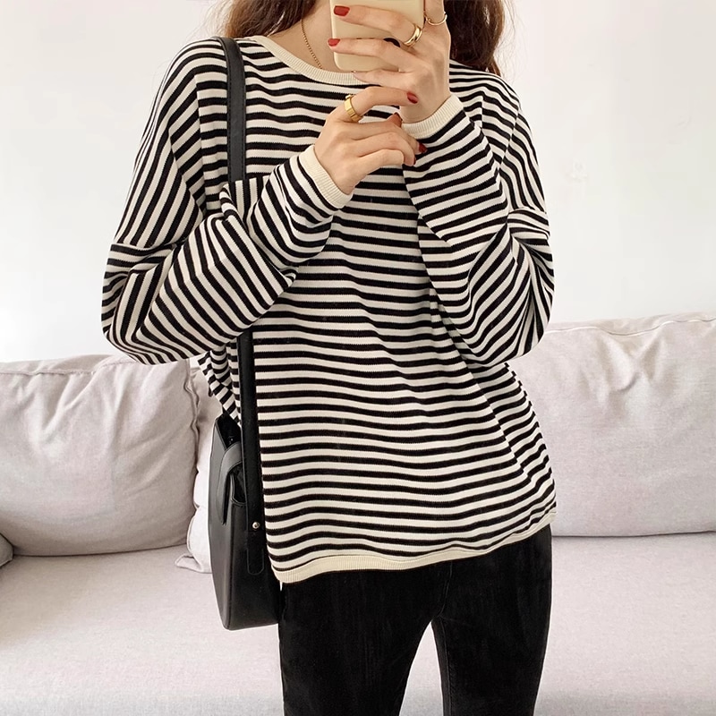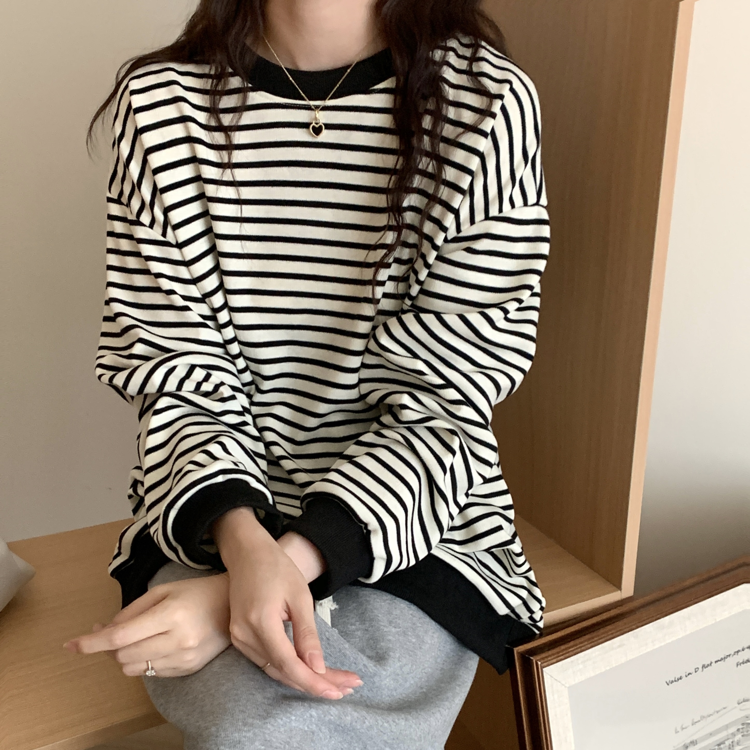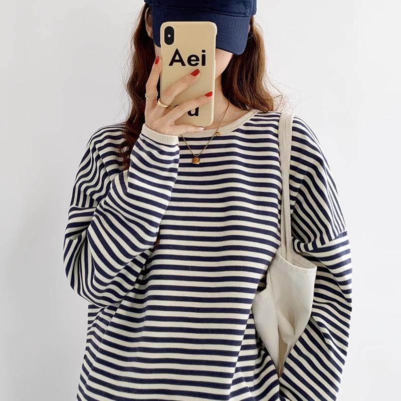 ニットタッチ万能ボーダーカットソー Tシャツトレーナースウェットトップス ストレッチドロップショルダー韓国ファッション