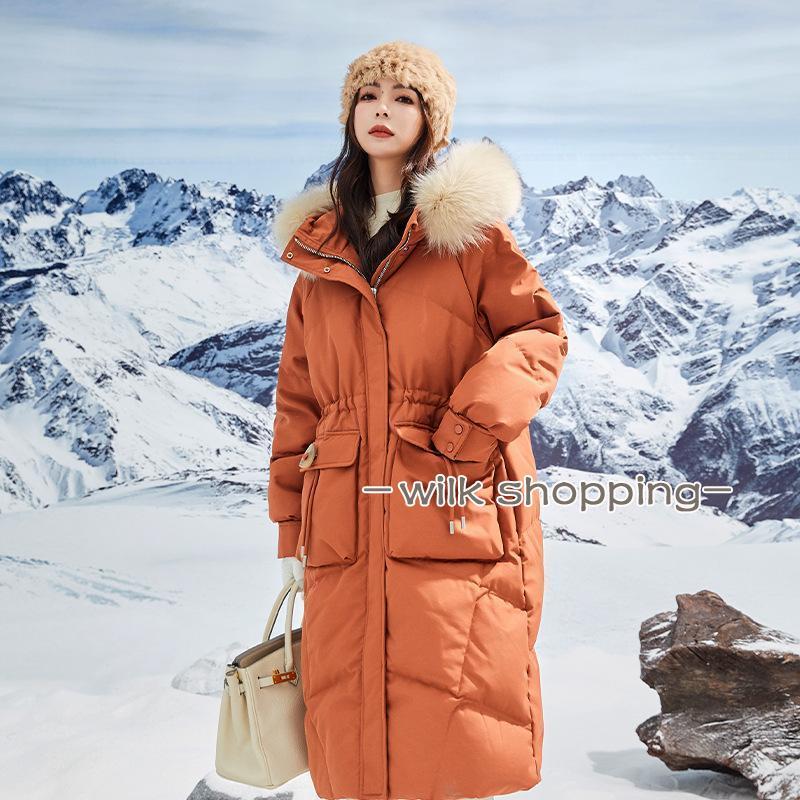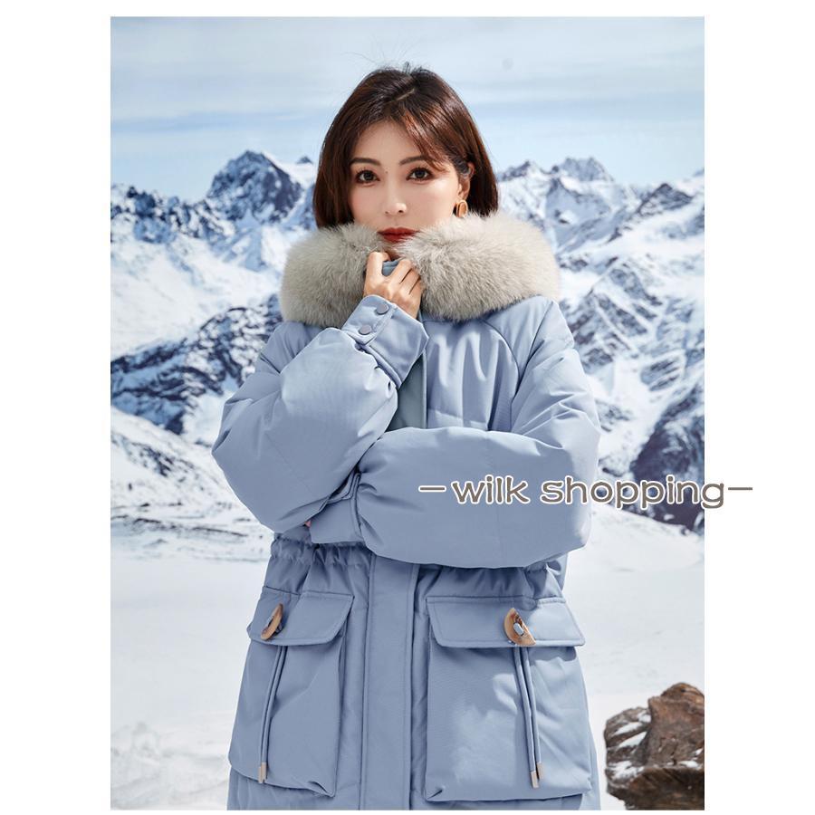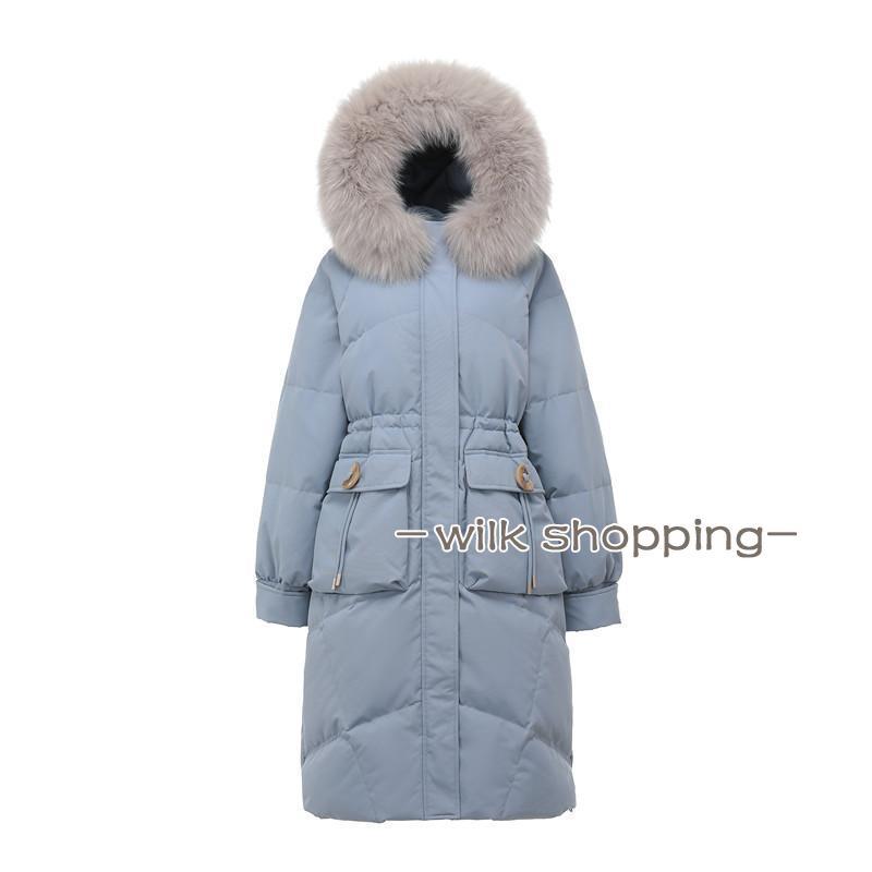 ロングダウンコート レディース ダウンジャケット ダックダウン 黒 ブルー M L 高級 ファー付き アウター ジャンパー 前開き 暖かい 防寒 撥水