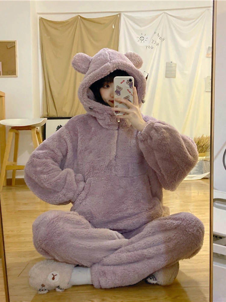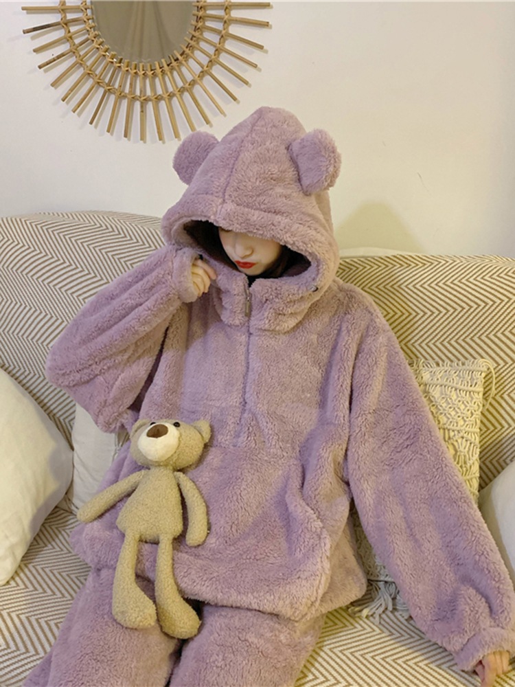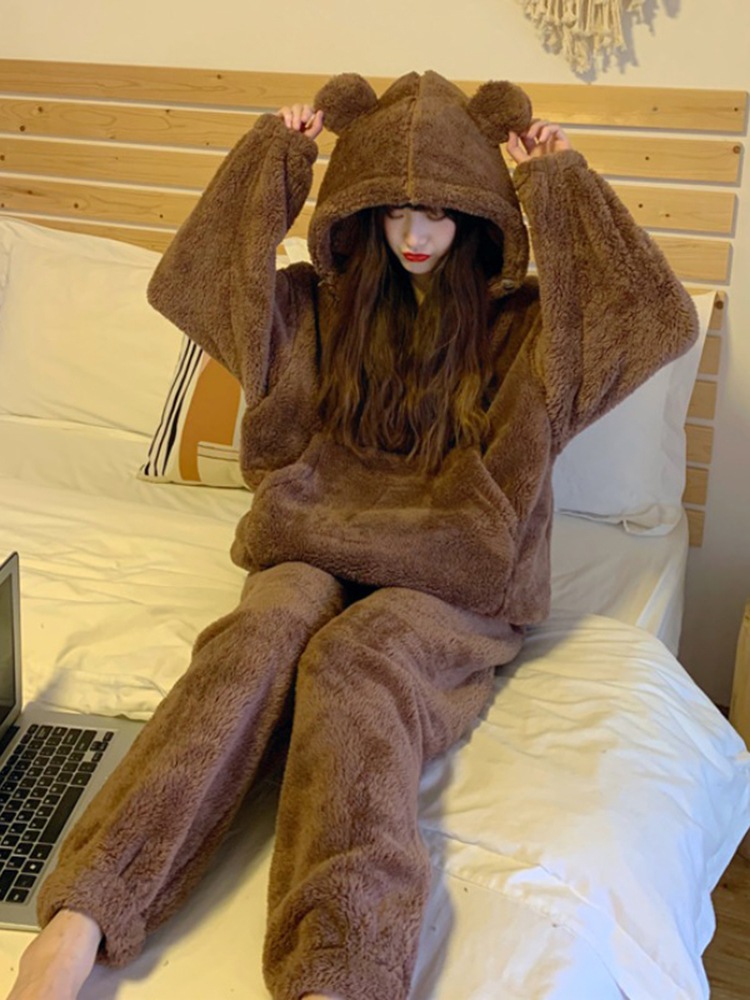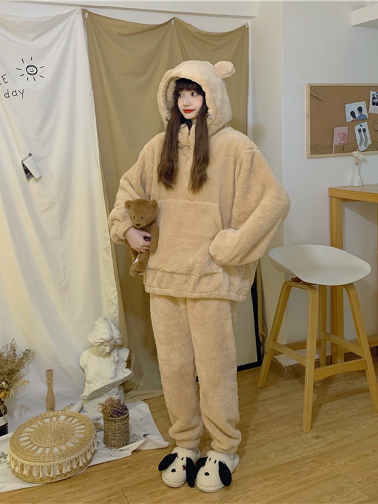パジャマ 冬ルームウェア 冬のベアーとベルベットのパジャマ冬の女性秋冬の新しいかわいいベルベットの厚い家庭服セット パジャマ