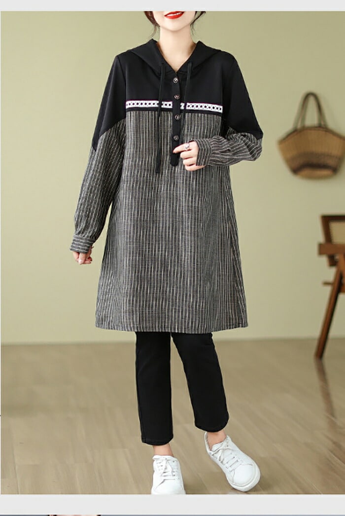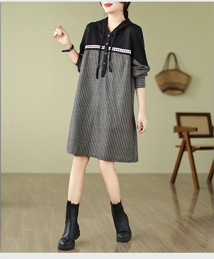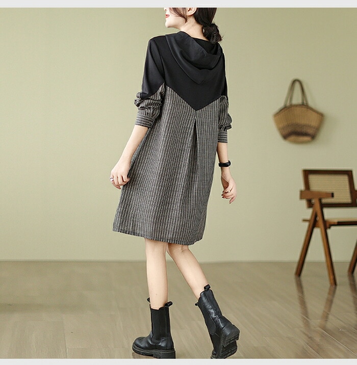 チュニック ワンピース レディース 長袖 ストライプ柄 切替 チュニックワンピース 大きいサイズ トップス プルオーバー 大人可愛い ゆったり 膝丈 体型カバー 森ガール ワンピ レトロ 春 秋 冬
