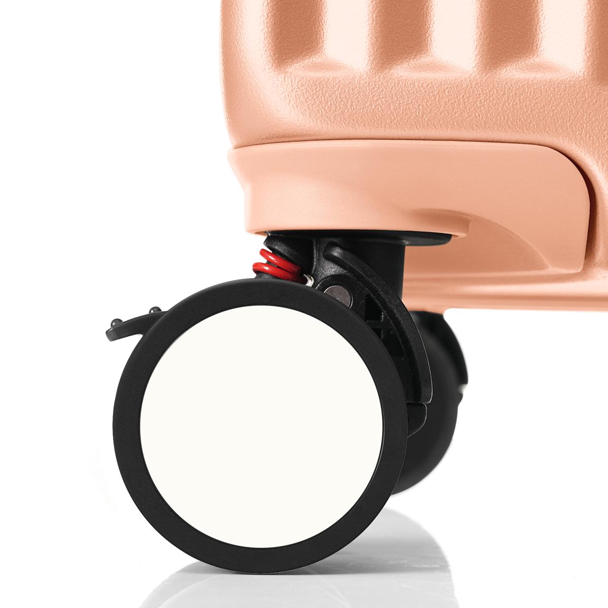 POINT 2.【静音性優れたサスペンションキャスター】サスペンションキャスターは地面の凹凸などによる振動・衝撃を吸収し、振動音を抑えてくれます。ストッパー付いるため、電車が揺れても固定できて安心です。