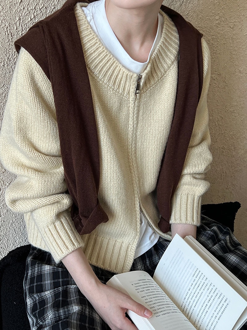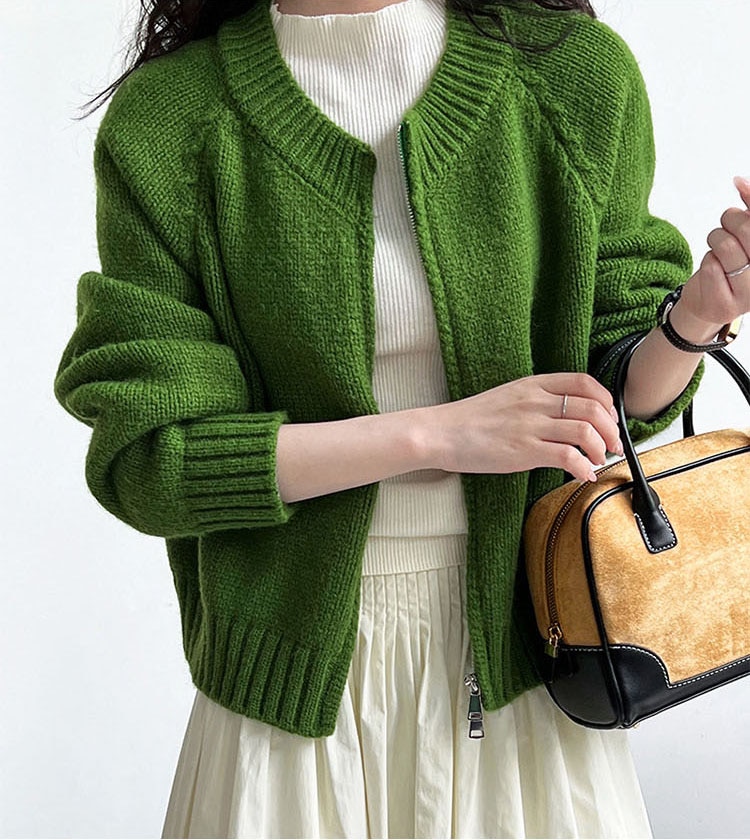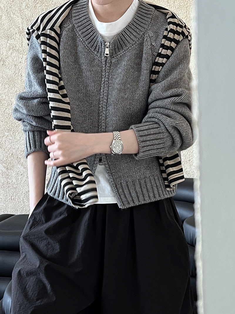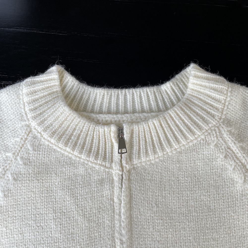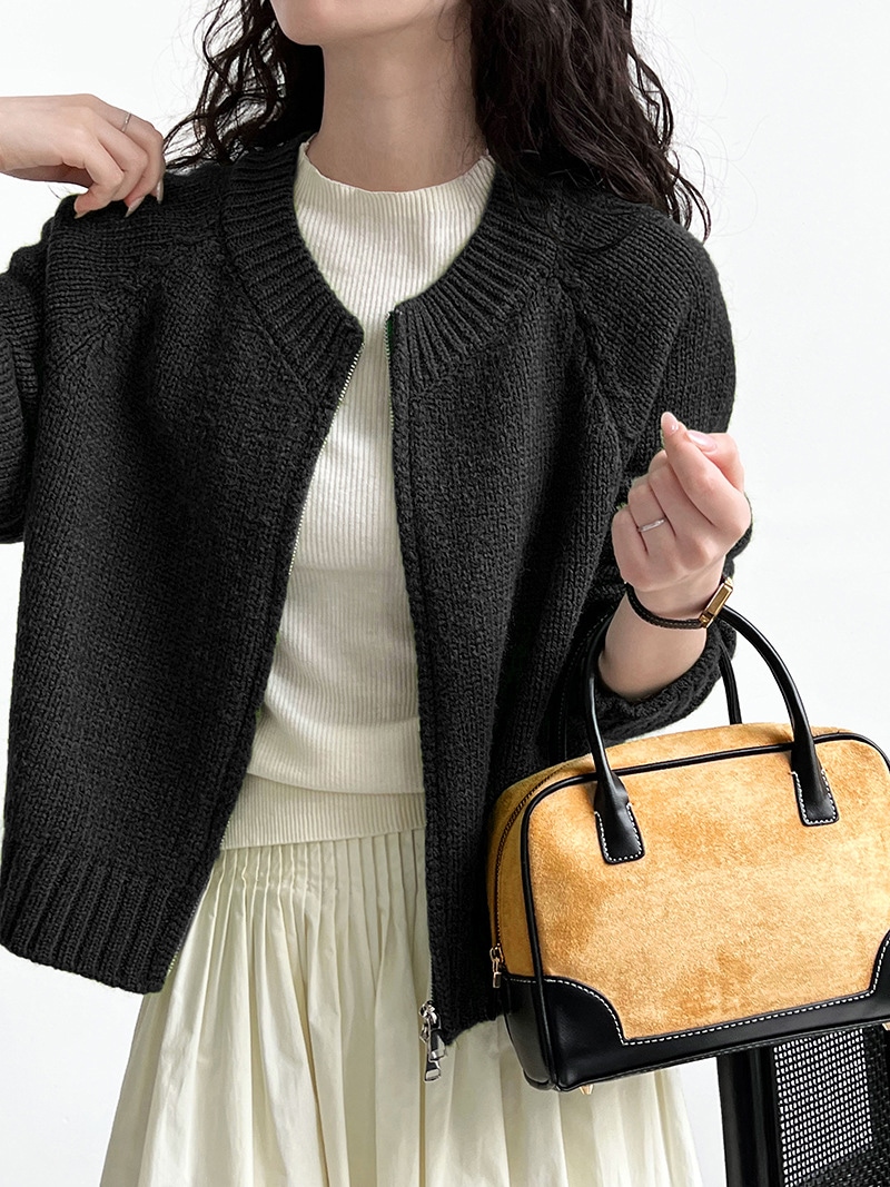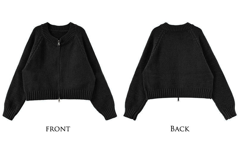 トップス アウター カーディガン ニットセーター レディース 秋冬 長袖 ラウンドネック ニット 厚手 ファスナー ダブルジップ ショート カジュアル 黒 グレー 白
