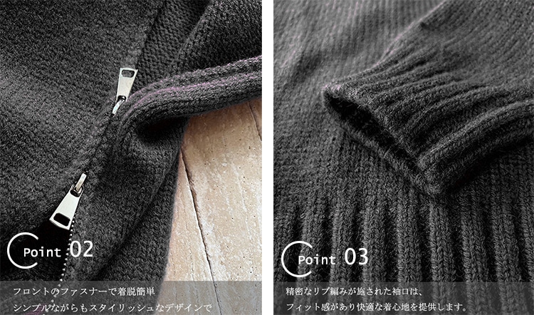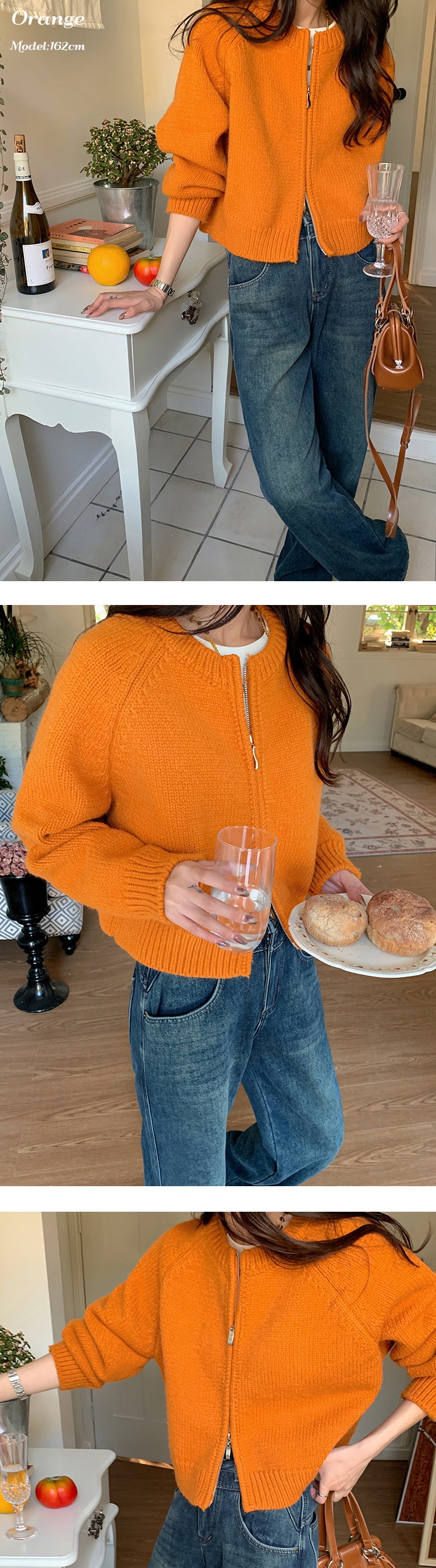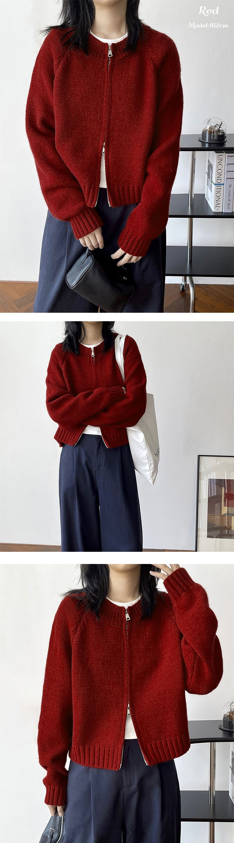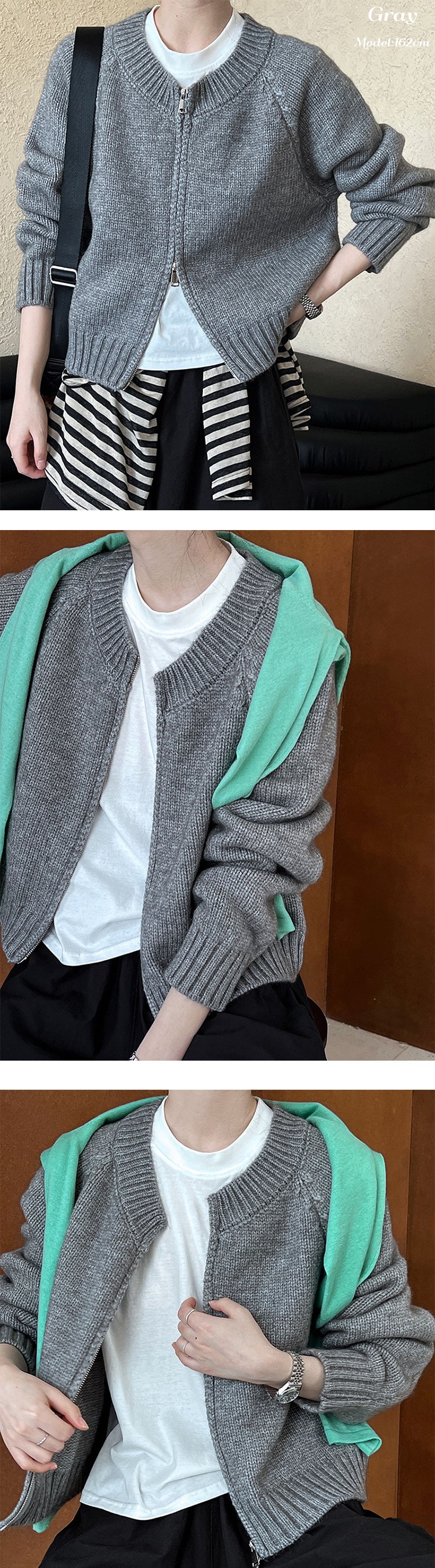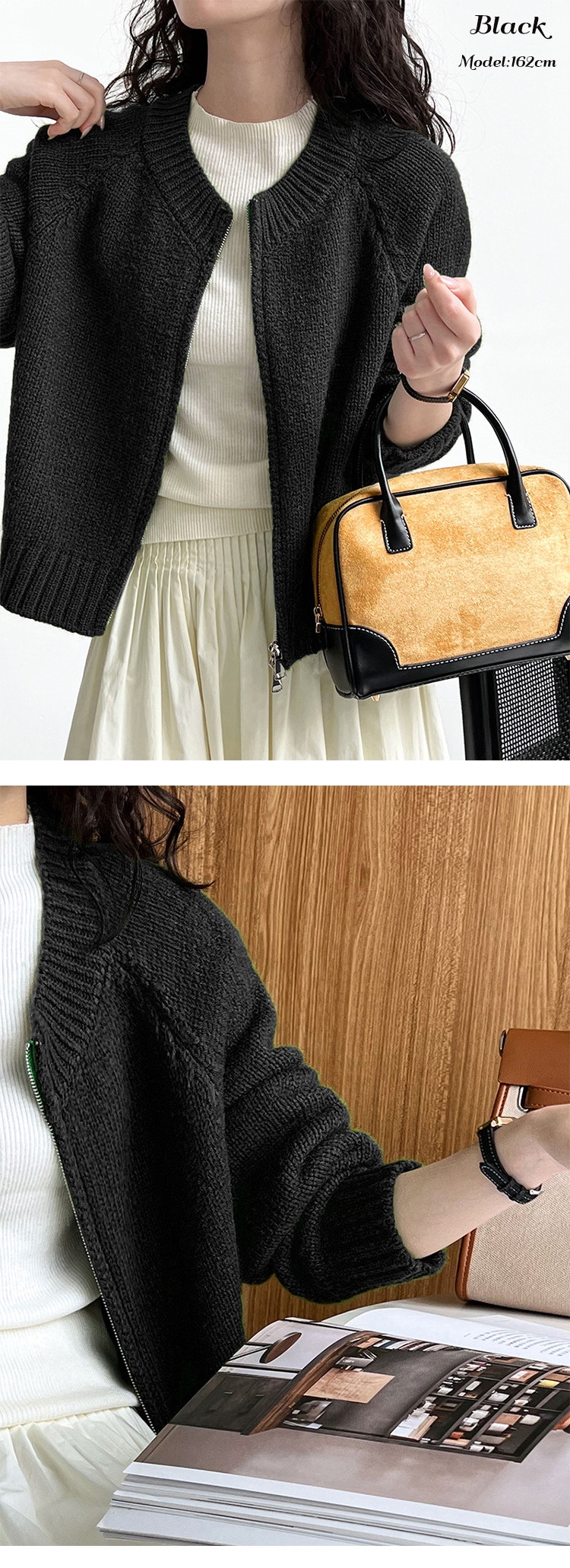 トップス アウター カーディガン ニットセーター レディース 秋冬 長袖 ラウンドネック ニット 厚手 ファスナー ダブルジップ ショート カジュアル 黒 グレー 白