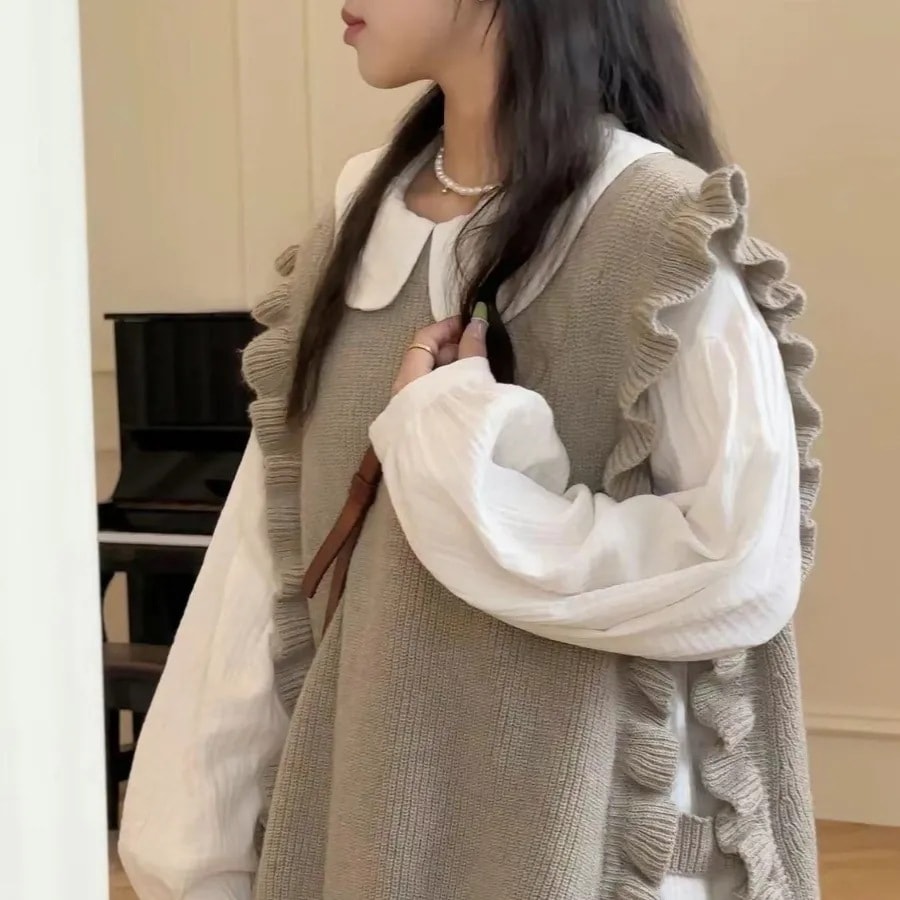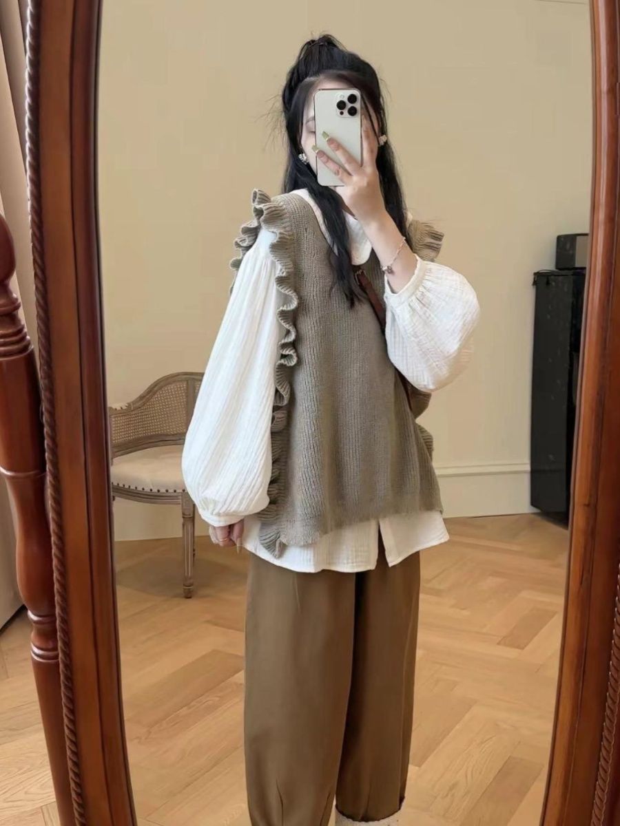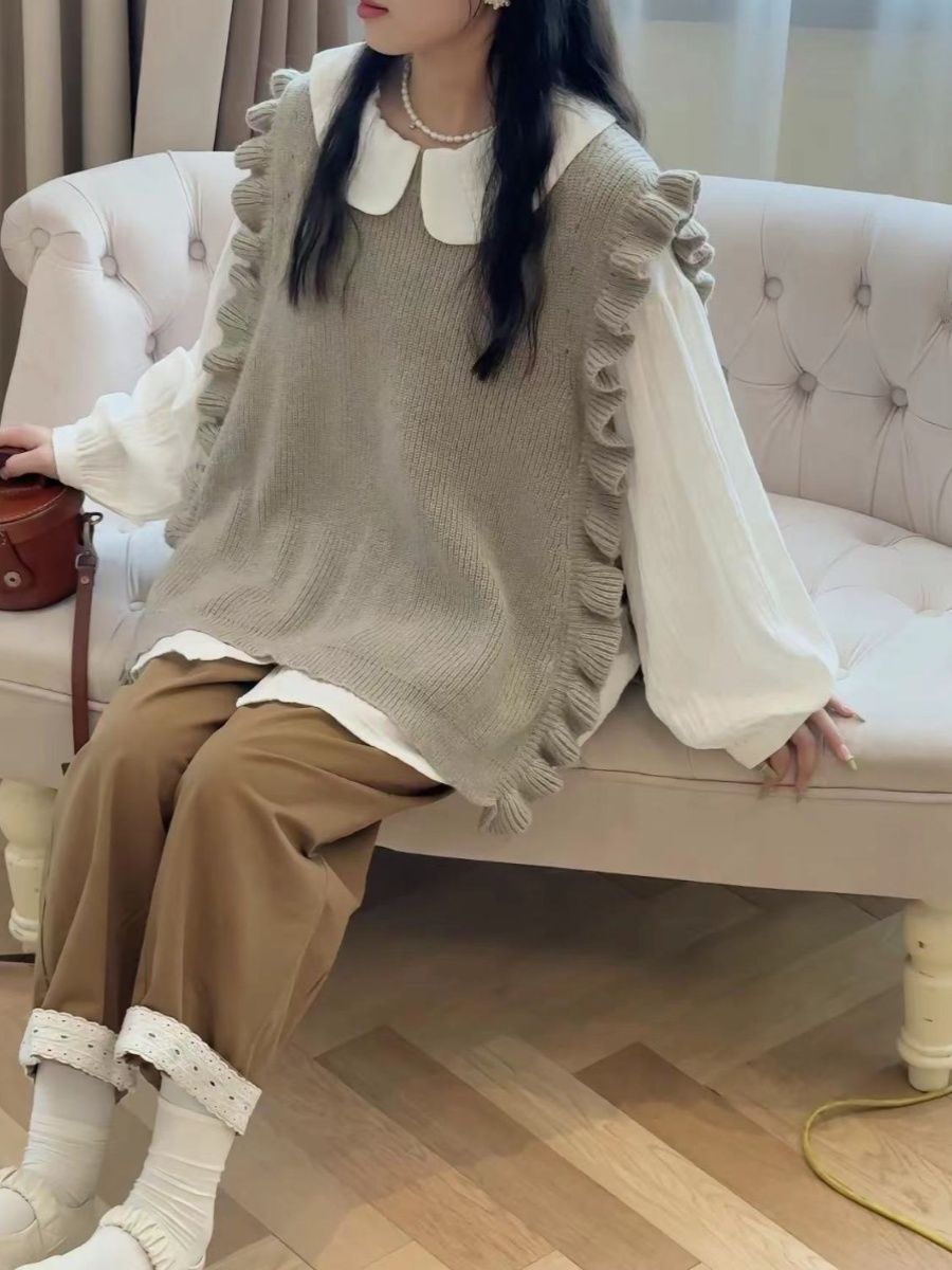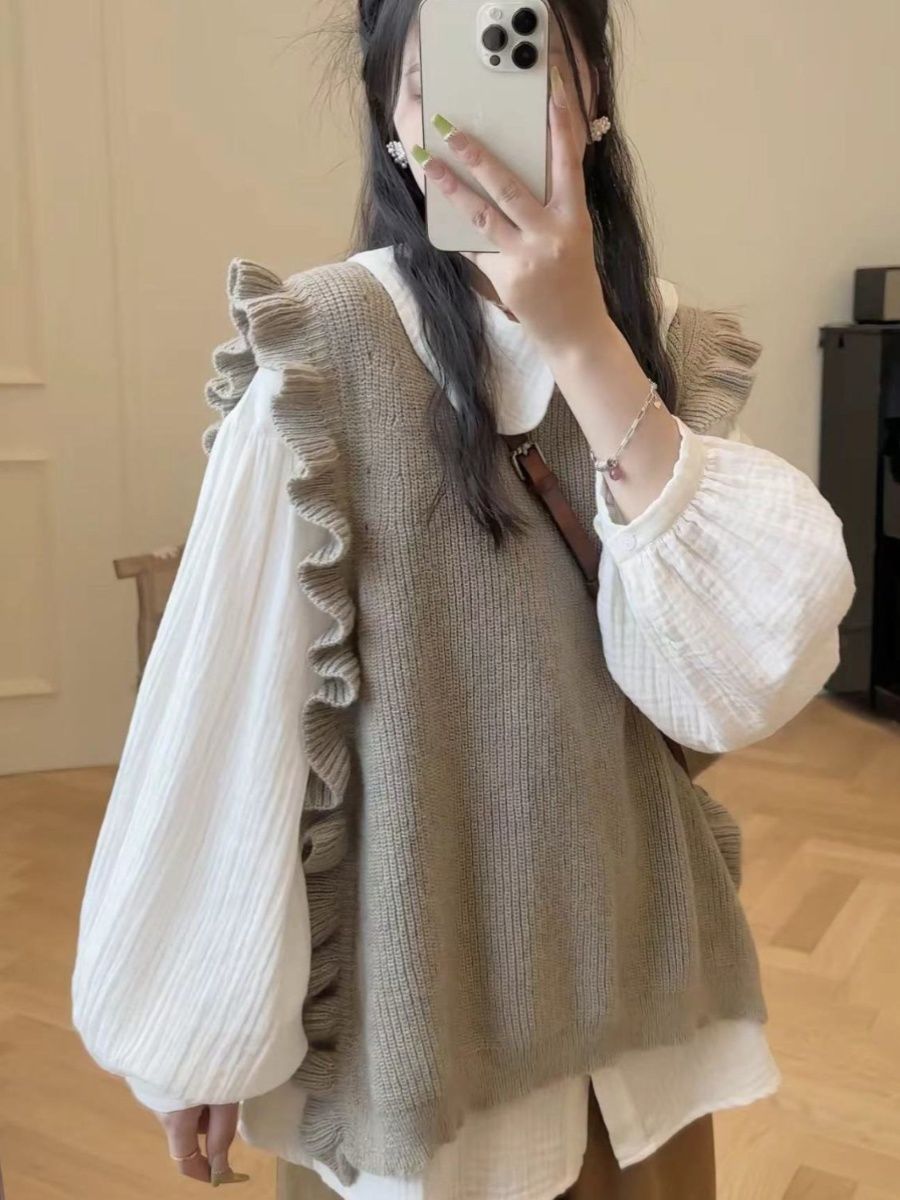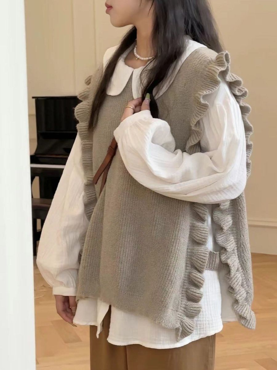 マウンテンパーカー ベスト ラッフル ニット レイヤード 韓国ファッション 人気なリプニット Vネック カシミヤタッチ クリスマスコスプレ 上品 裏起毛 ベーシックニット ニット 長袖 レディース 大