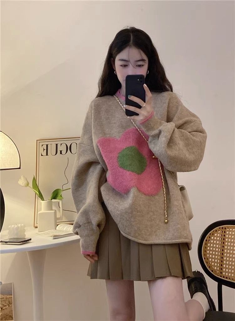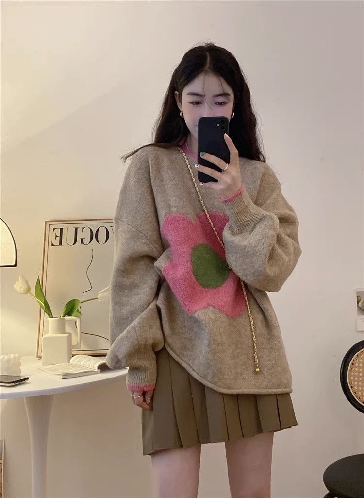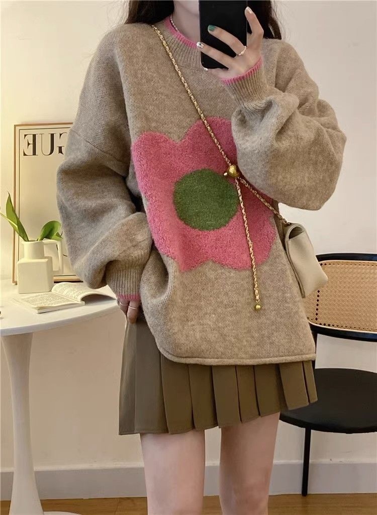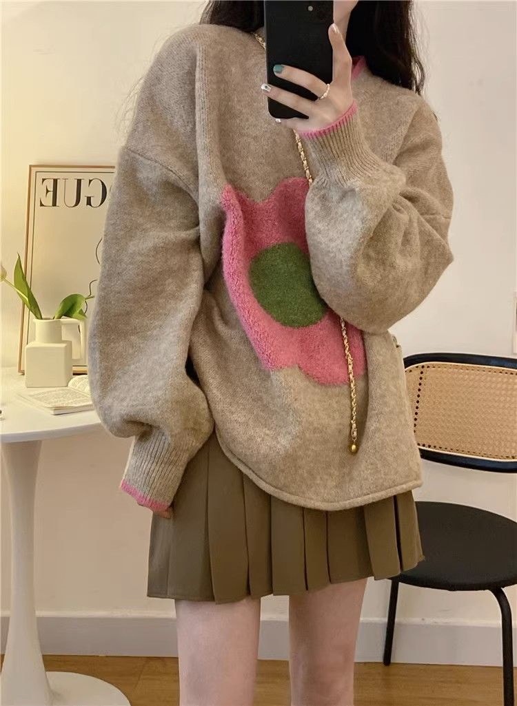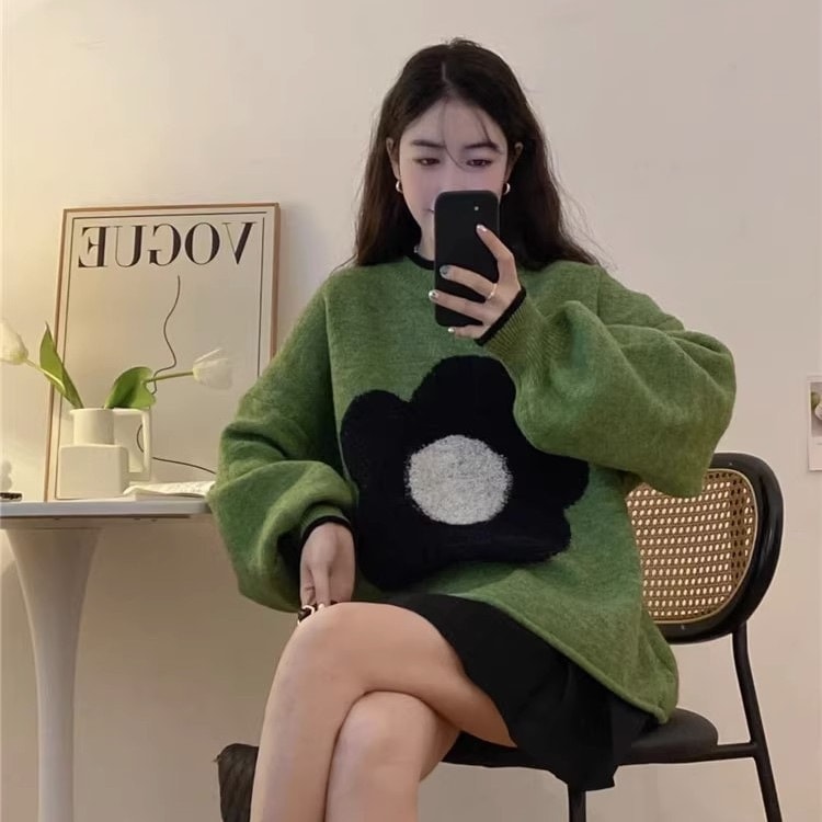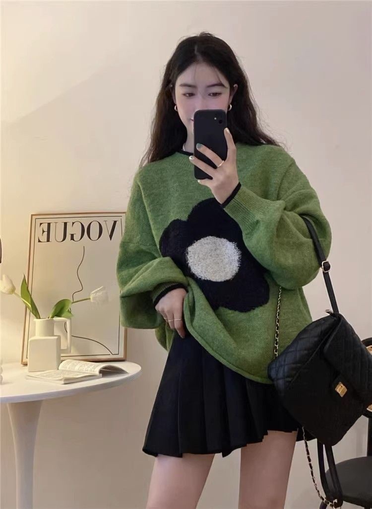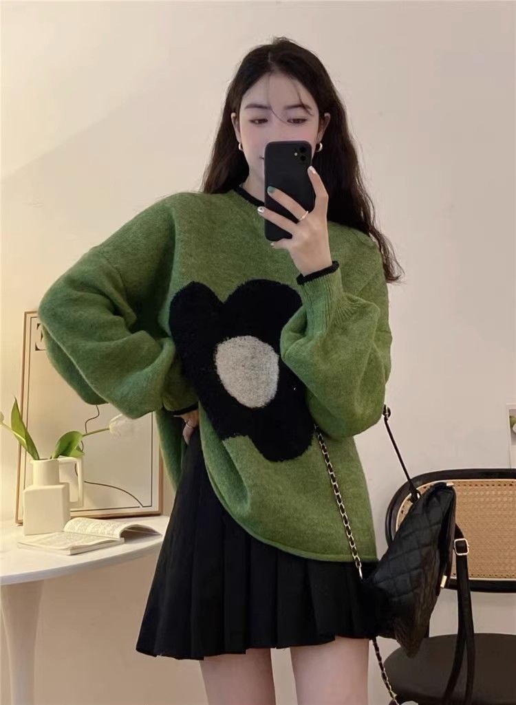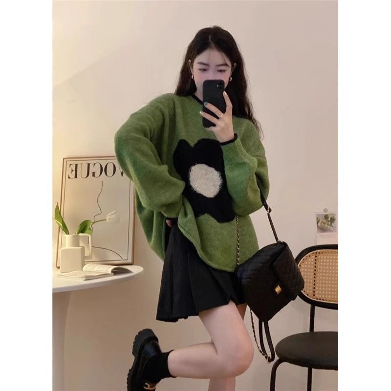カシミャタッチ かわいいデザイン感小衆グリーンの花ニットセーター秋冬新作ぶつかり色ゆったり丸首長袖トップス メガ割 ニットカーディガン ベーシックニット リブニット
