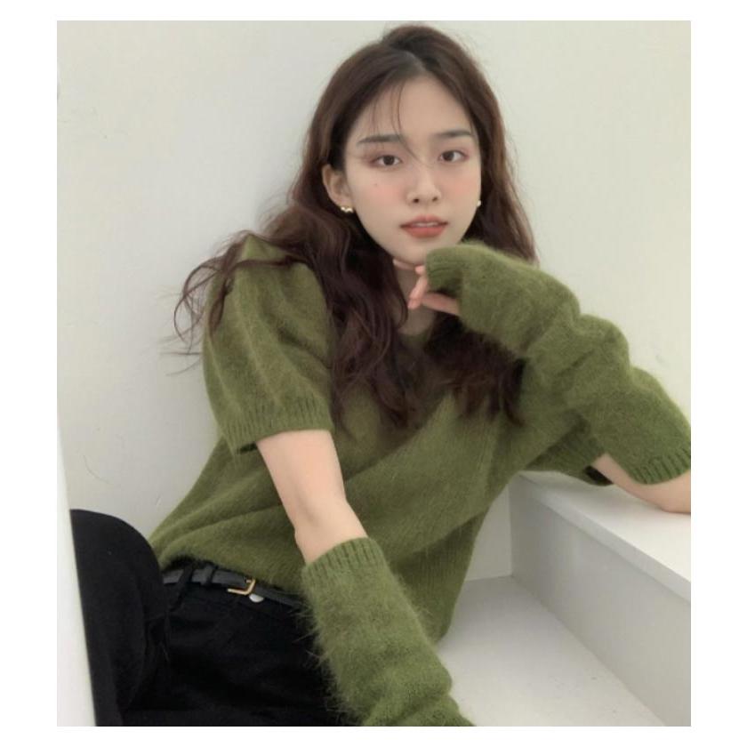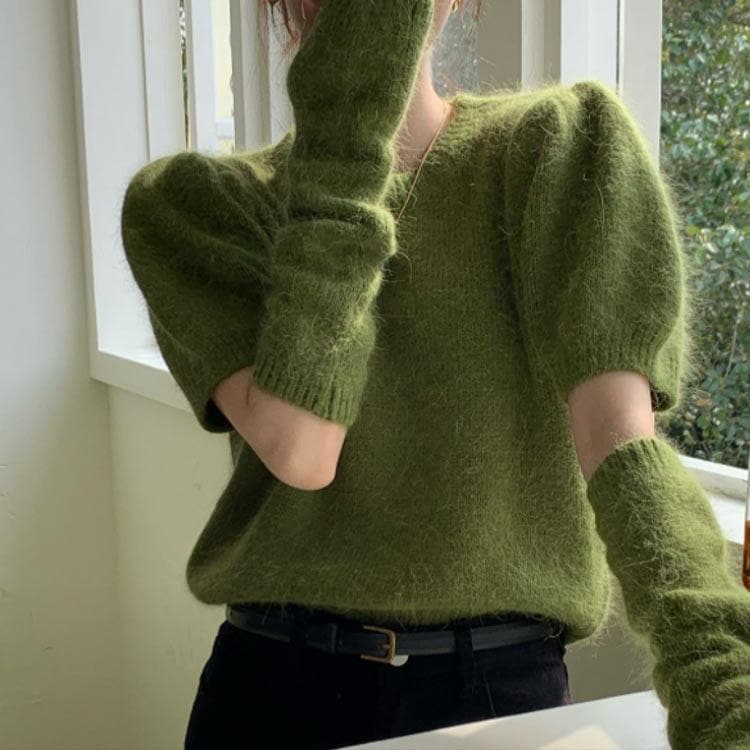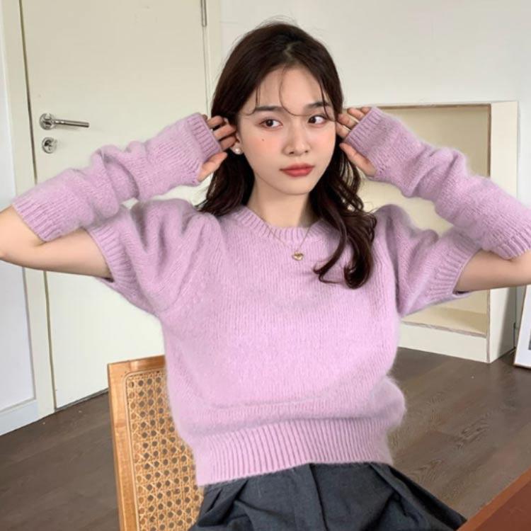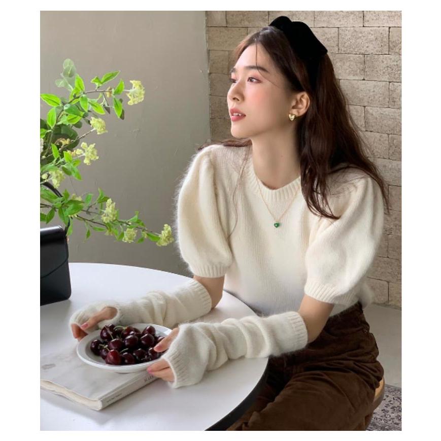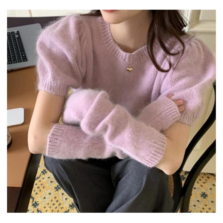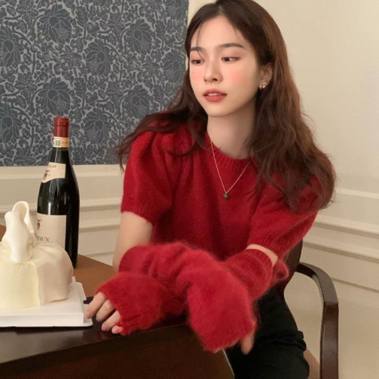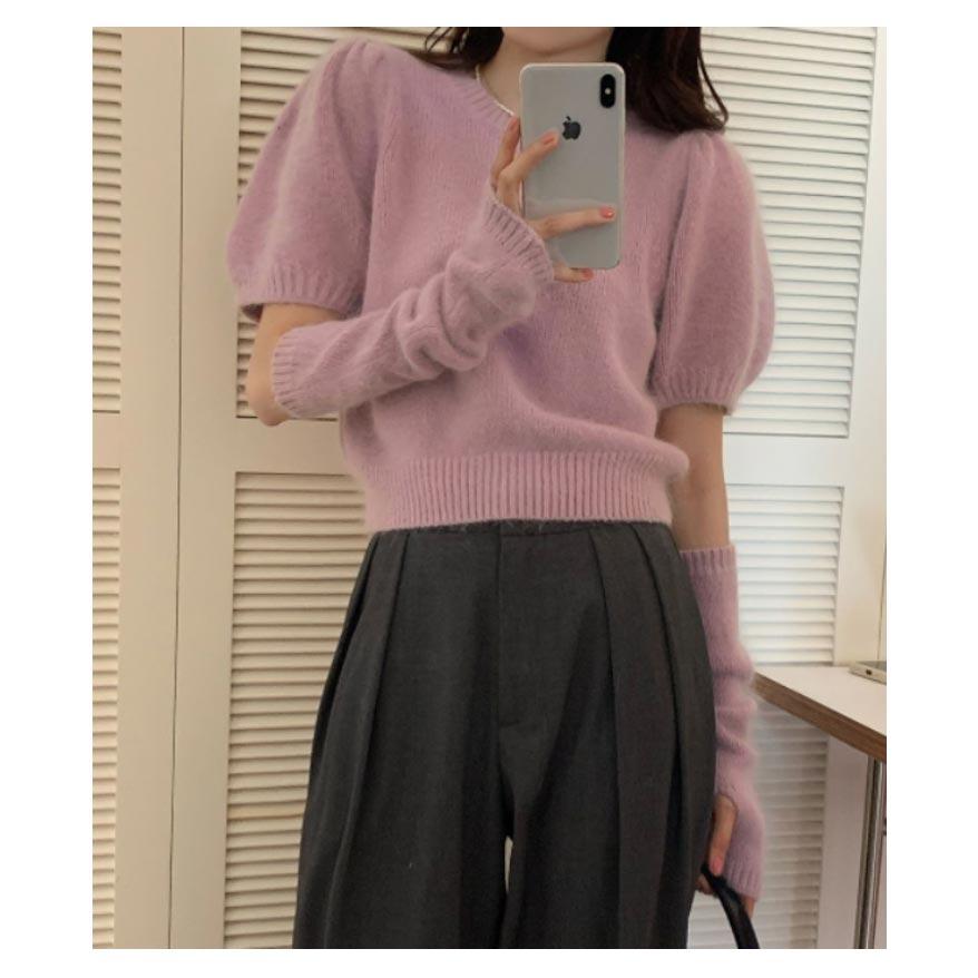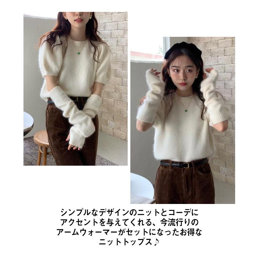 人気商品超目玉 ニット セーター トップス レディース 半袖 半袖ニット 秋 冬 アームカバー付き クルーネック もこもこ ふわふわ アームウォーマー付き