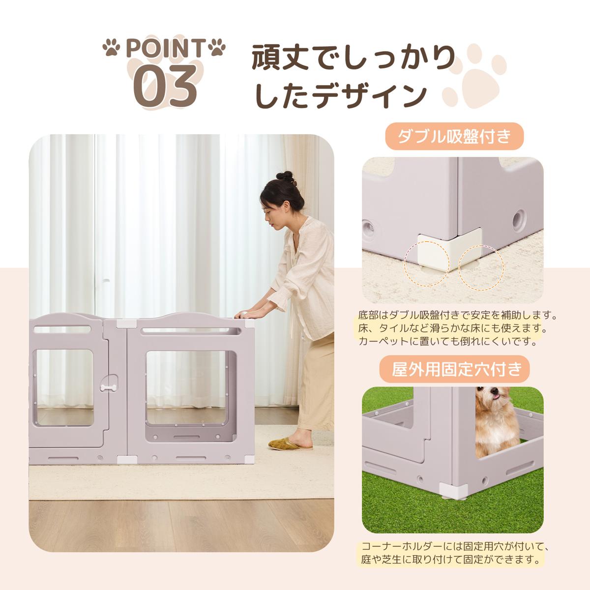 ◆02パネルの高さは75センチで、飼い主さんは出入りしやすい、いつでもペットの状態をチェックできます。ペットにとっても飛び出しにくい十分な高さです。適応対象:子犬・小型犬(肩の高さが45センチ以下の犬)