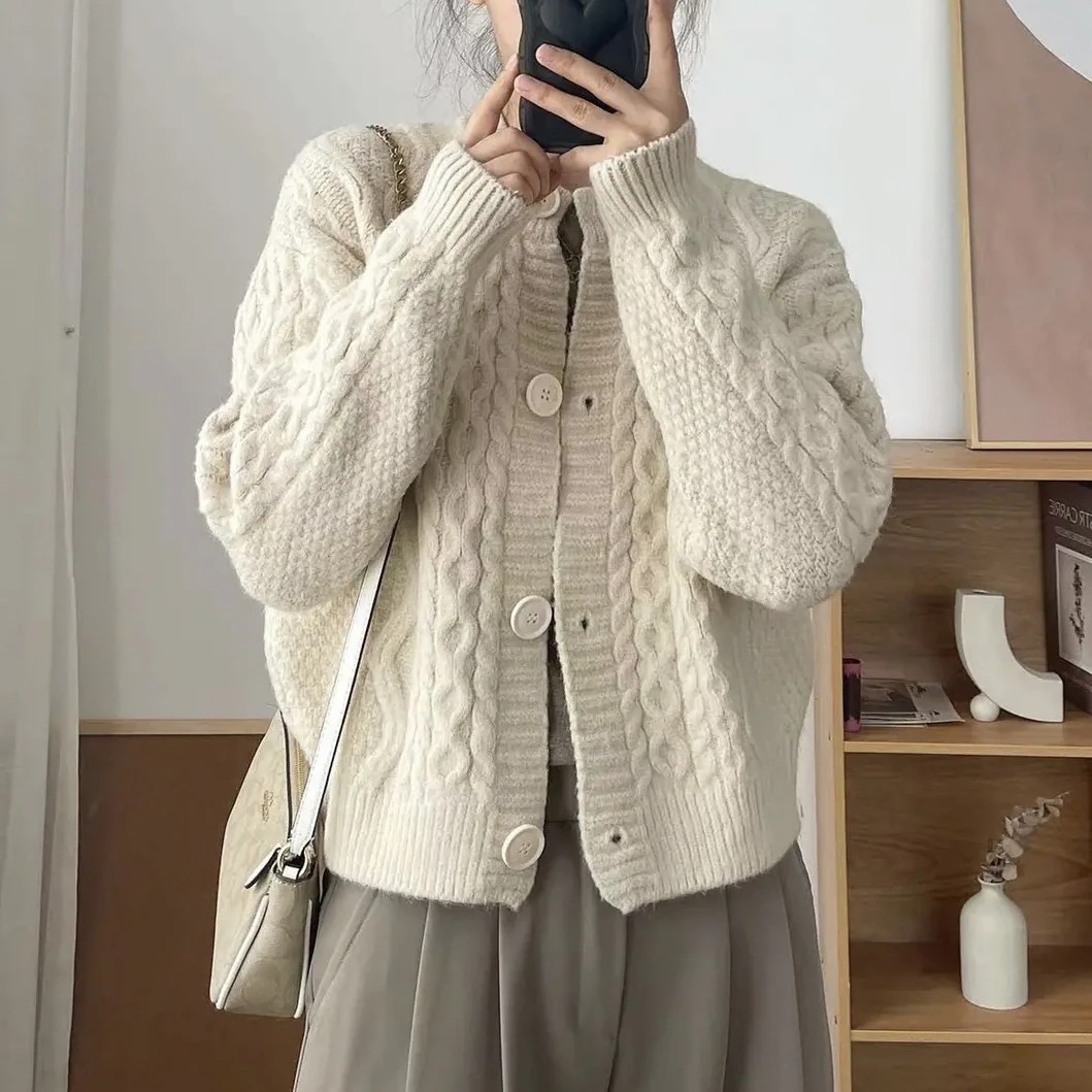 レトロツイストラウンドネックジャンパージャケット韓国ファッション女性の秋と冬の新しい緩い怠惰な風野生肥厚ニットカーディガンブラウス カーディガン