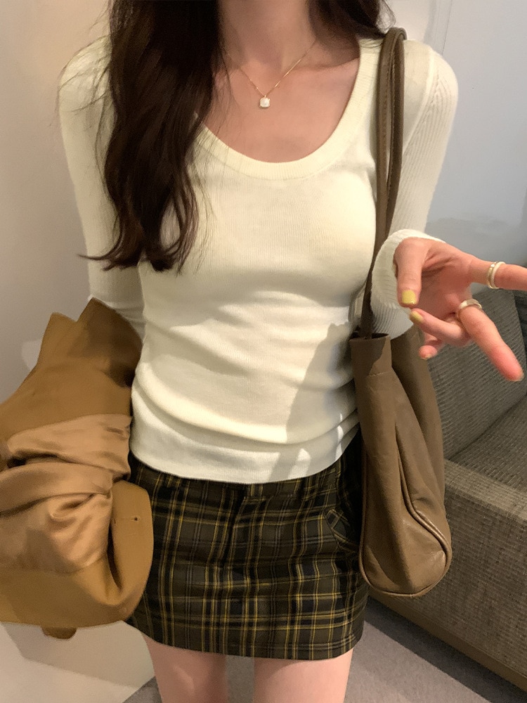 Uネック長袖スリムボトムシャツレディースニットトップス2024秋長袖インナー チュニック