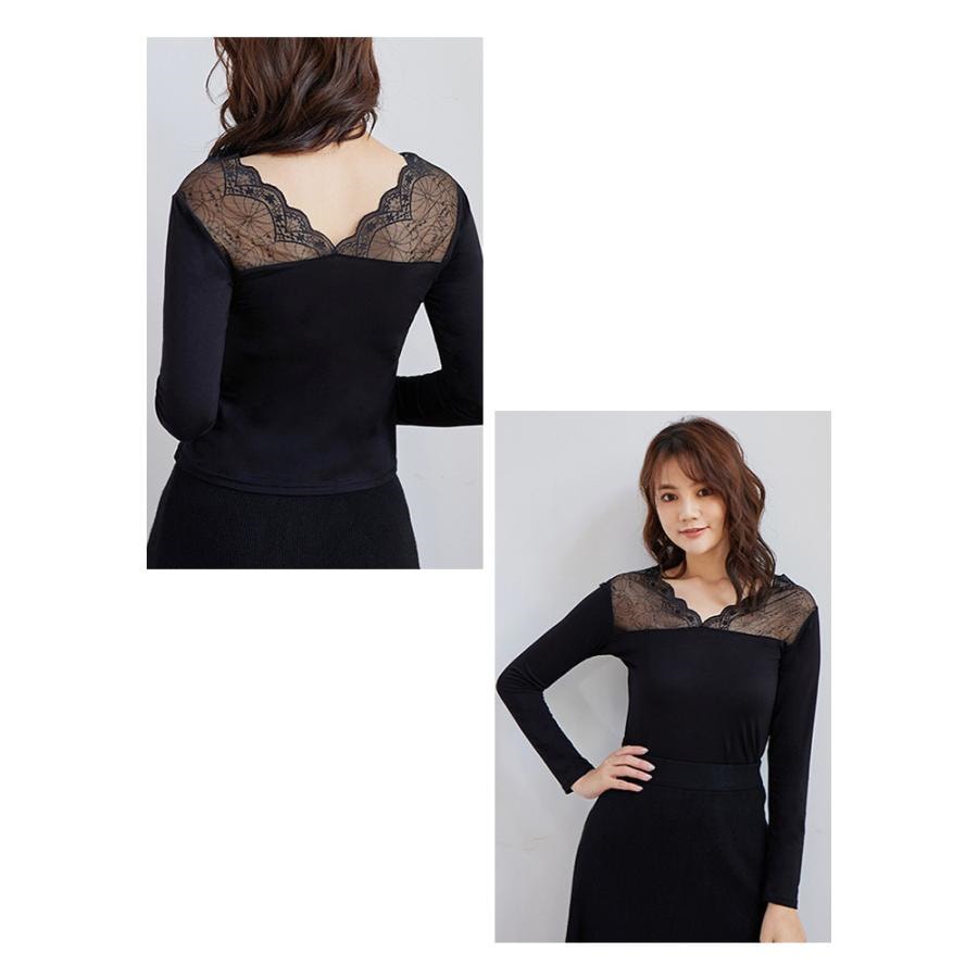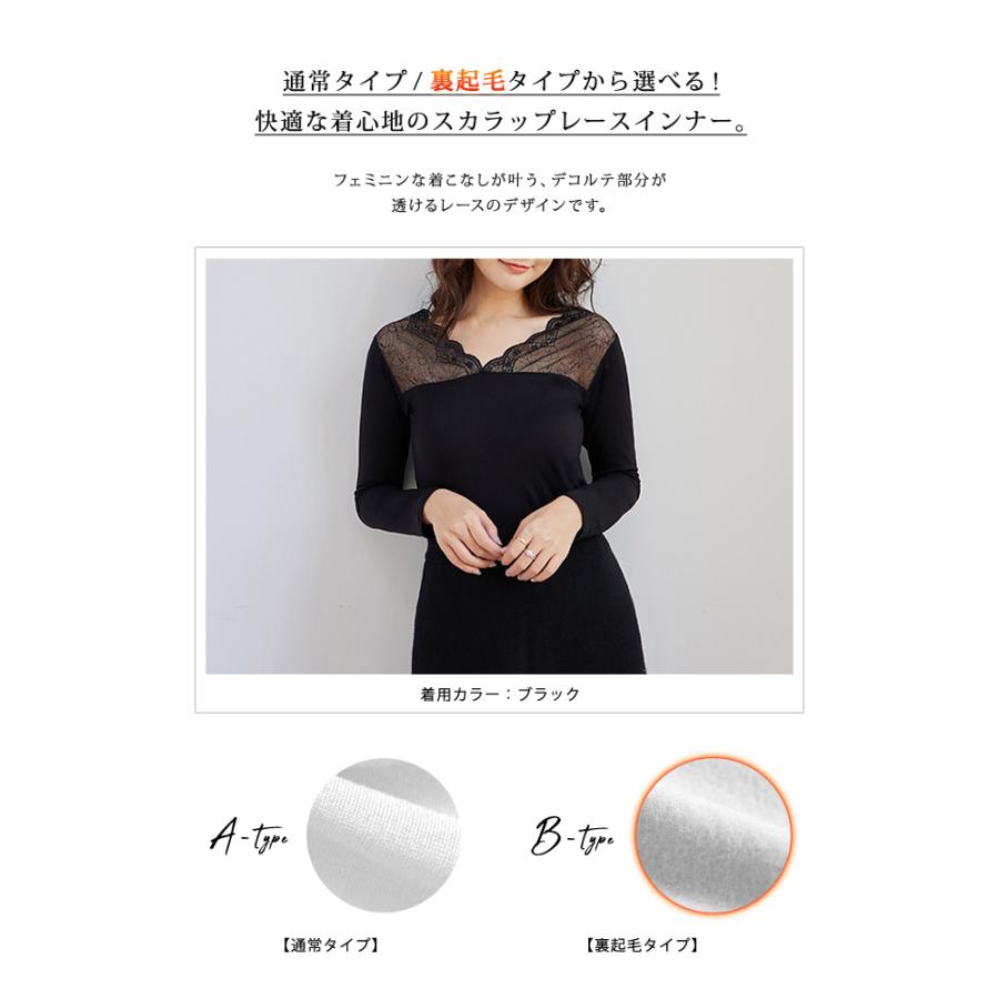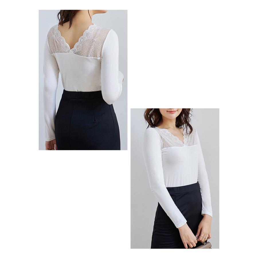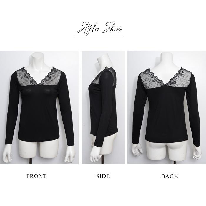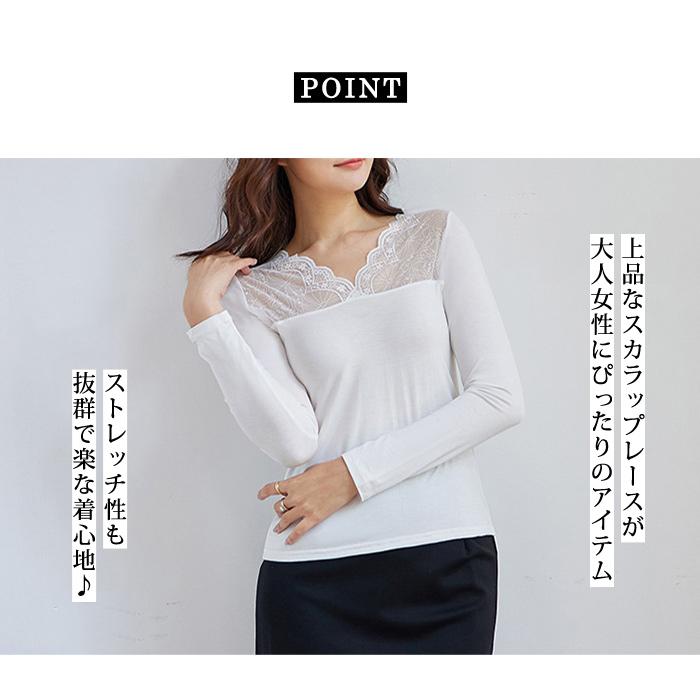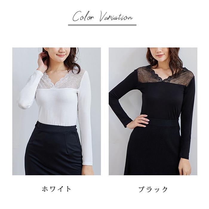トップス レディース 秋 冬 秋冬 黒 白 裏起毛 カットソー 長袖 インナー 下着 あったか レースインナー Vネック インナー 無地 ブラック ホワイト