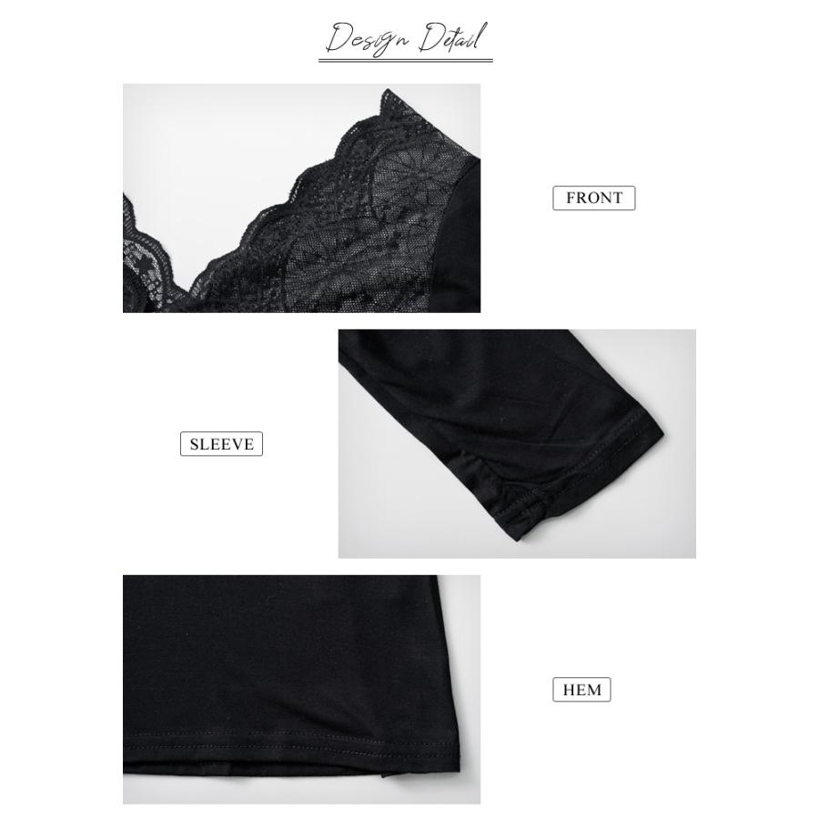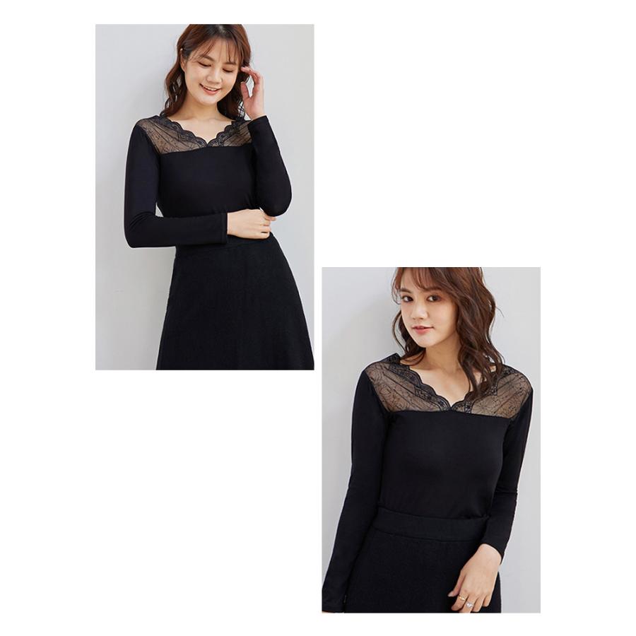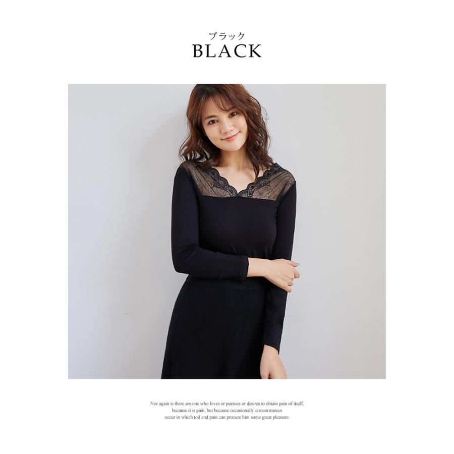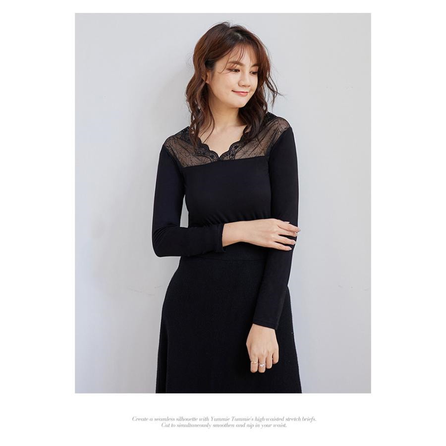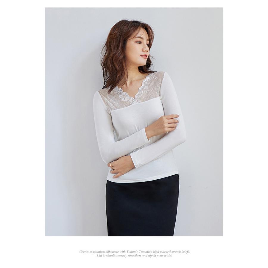 トップス レディース 秋 冬 秋冬 黒 白 裏起毛 カットソー 長袖 インナー 下着 あったか レースインナー Vネック インナー 無地 ブラック ホワイト