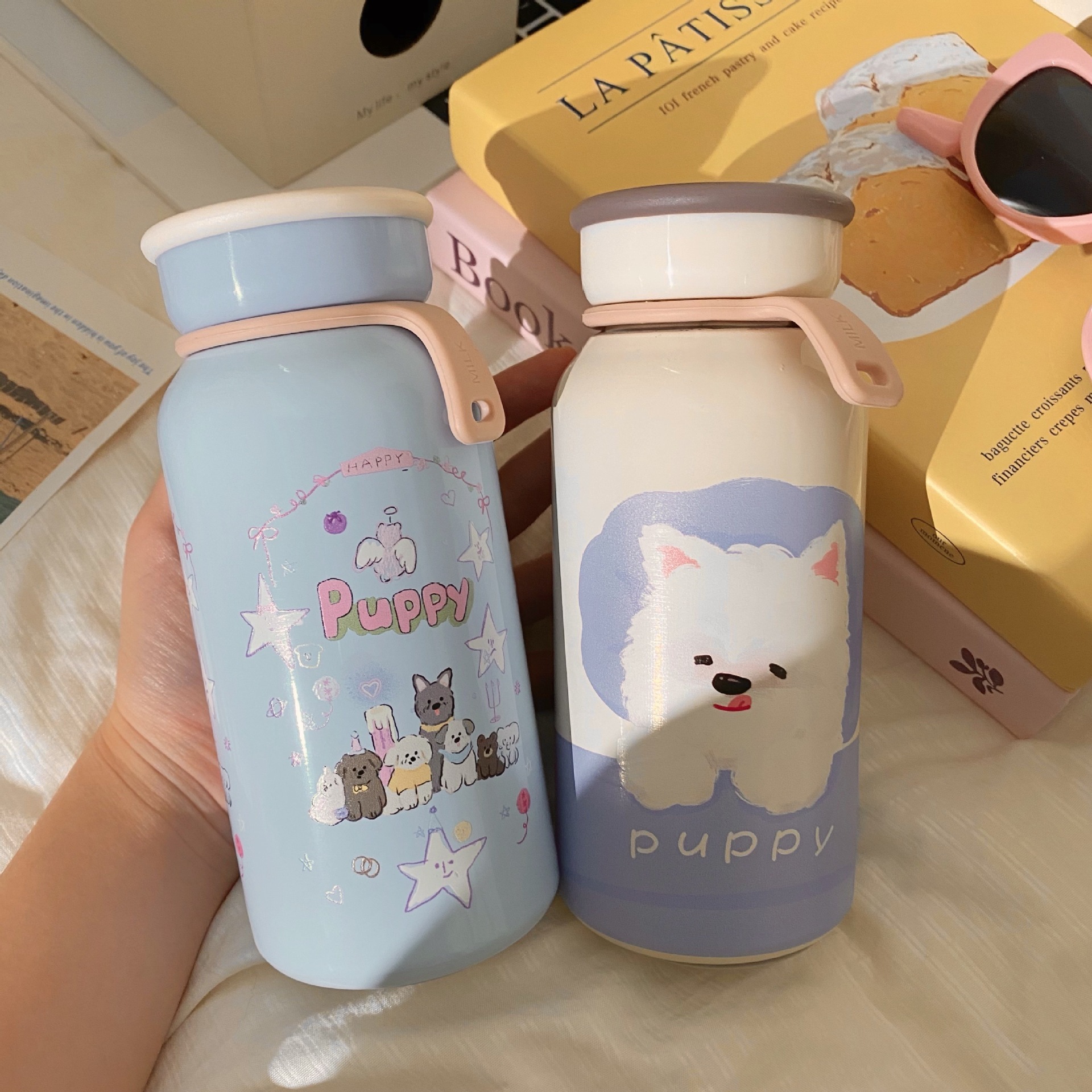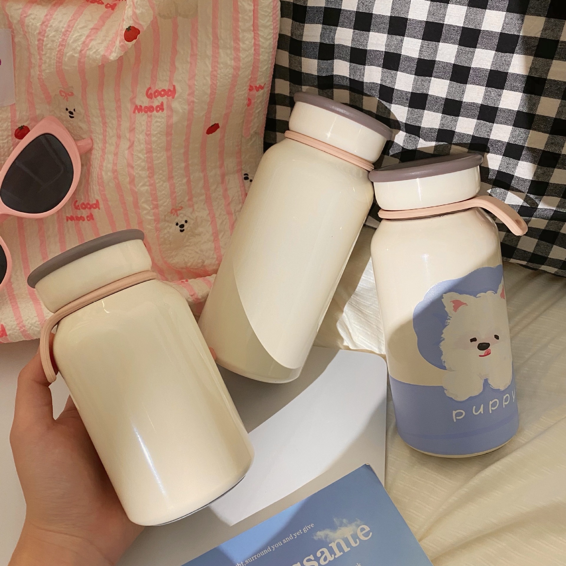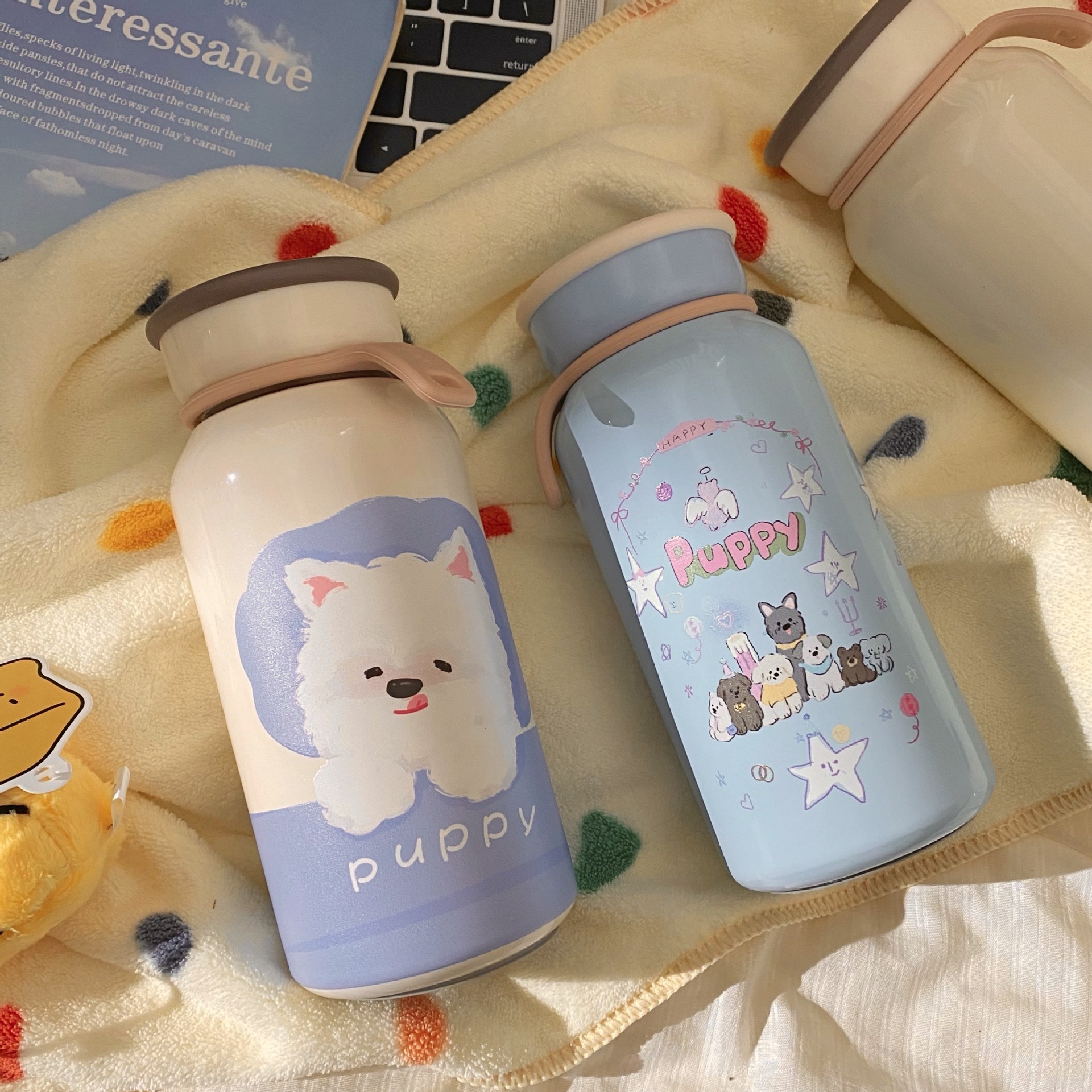 かわいい漫画子犬保温カップ高颜値女子ステンレスカップ携帯付きカップコップ タンブラー