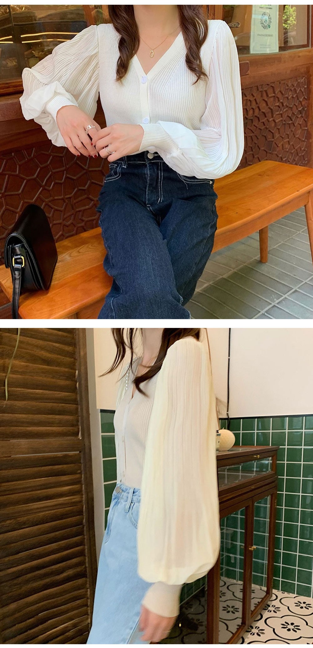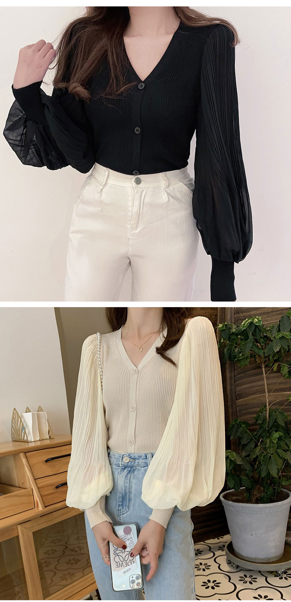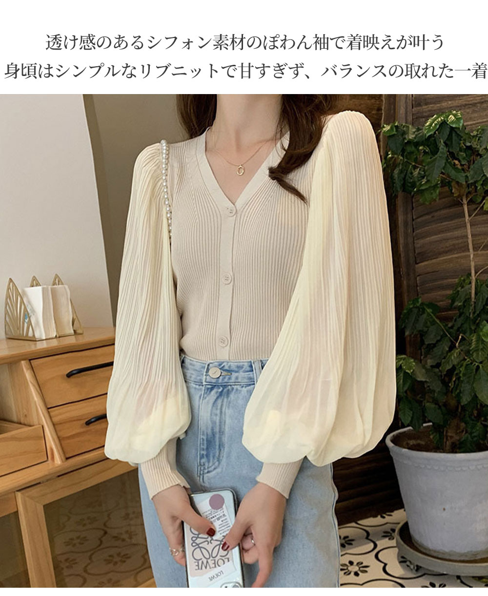 春 秋 長袖 ブラウス ニット ドッキング トップス レディース 切り替え シアー袖 ボリューム袖 レイヤード風 重ね着風 ニットトップス プルオーバー 薄手 ボタン
