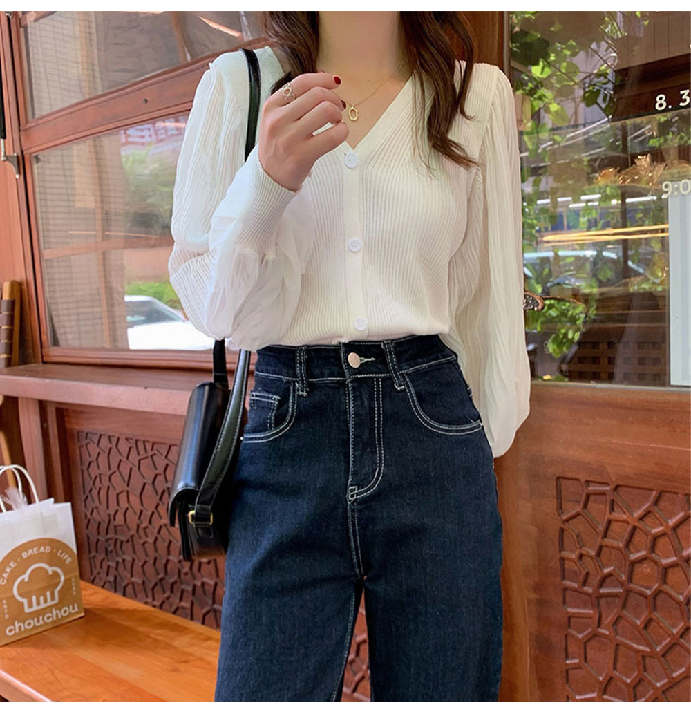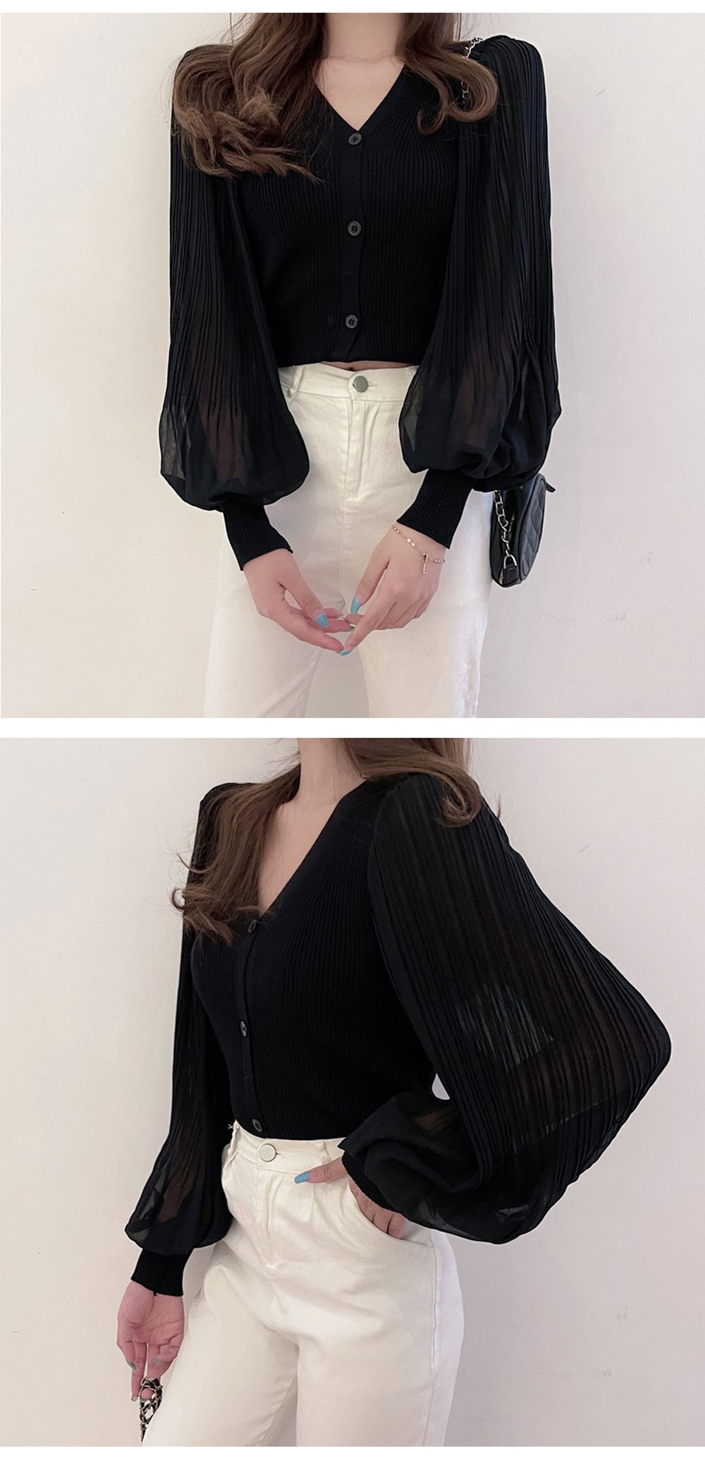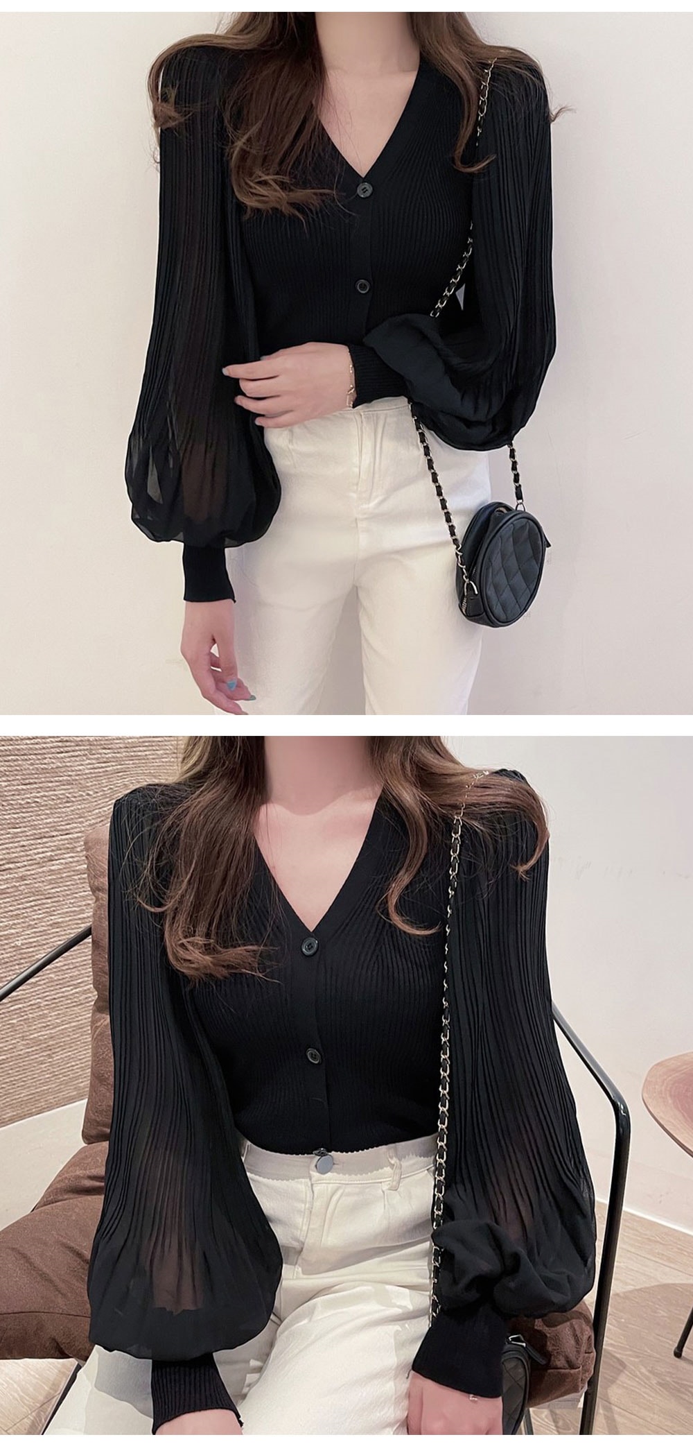 春 秋 長袖 ブラウス ニット ドッキング トップス レディース 切り替え シアー袖 ボリューム袖 レイヤード風 重ね着風 ニットトップス プルオーバー 薄手 ボタン