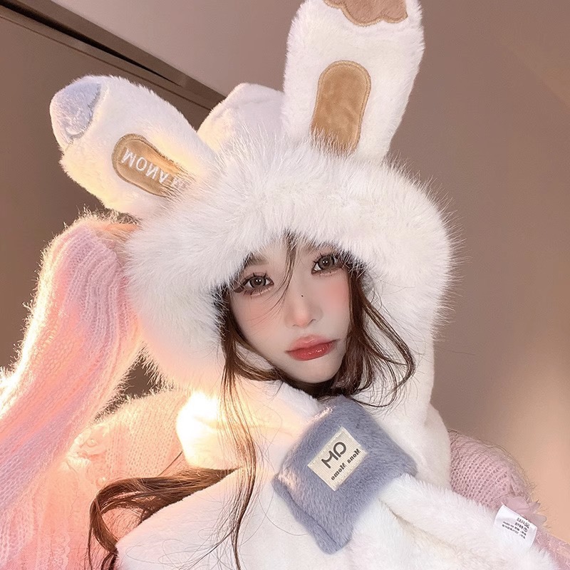 冬用の可愛いウサギ耳つきモフモフのフードとセットの韓国風の暖かい耳を守る防風性なニット帽です加わった毛が厚くどんなスタイルにも合わせやすい百搭アイテムですかぶせ式のデザインで快適に装着いた