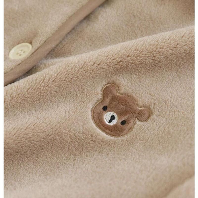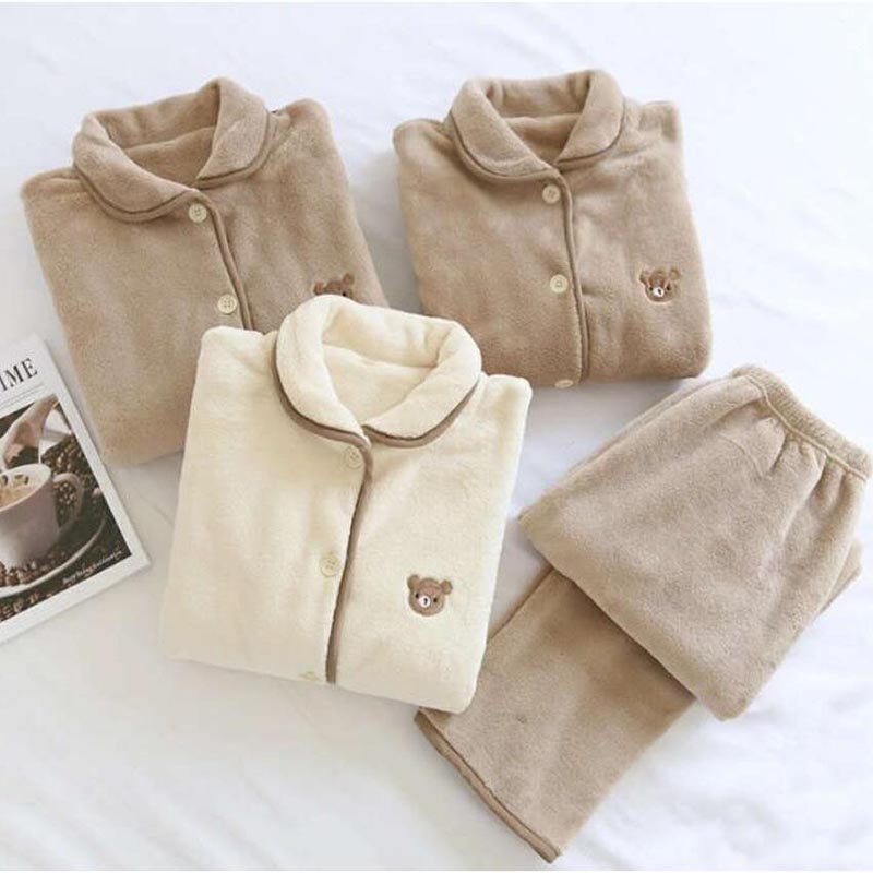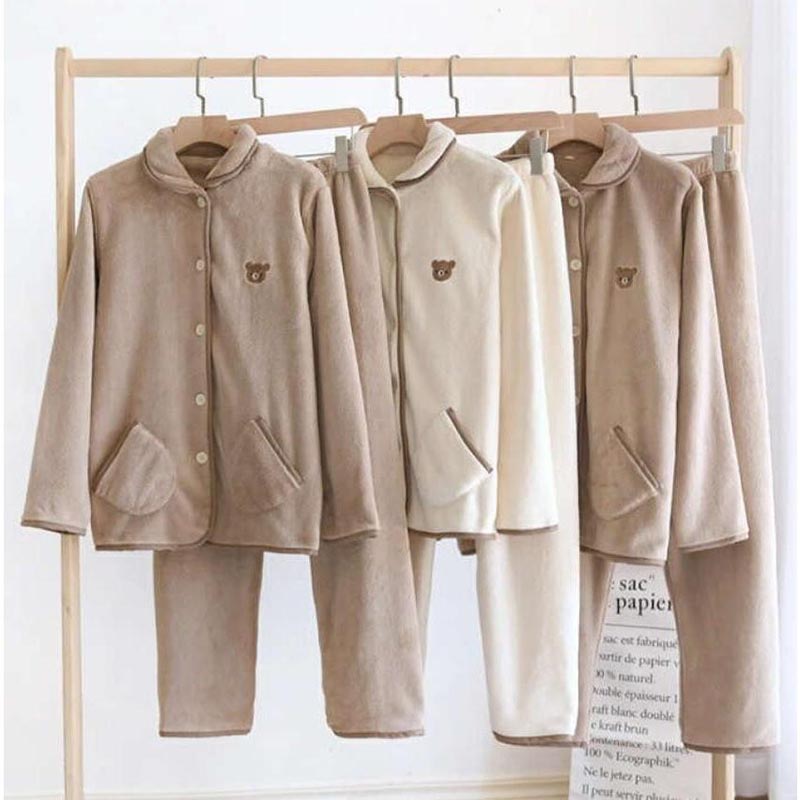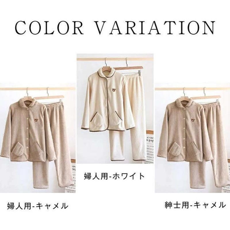 ペア パジャマ レディース メンズ ルームウェア 可愛いクマ柄 上下セット カップル 婦人用 紳士用 秋冬 防寒 ふわふわ もこもこ 前開き 厚手 長袖