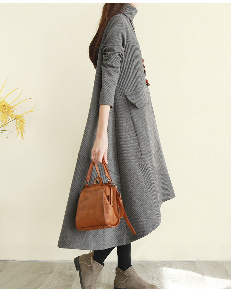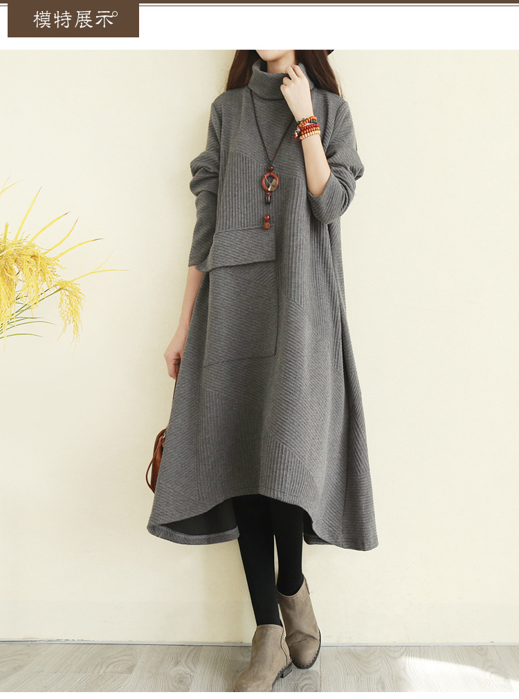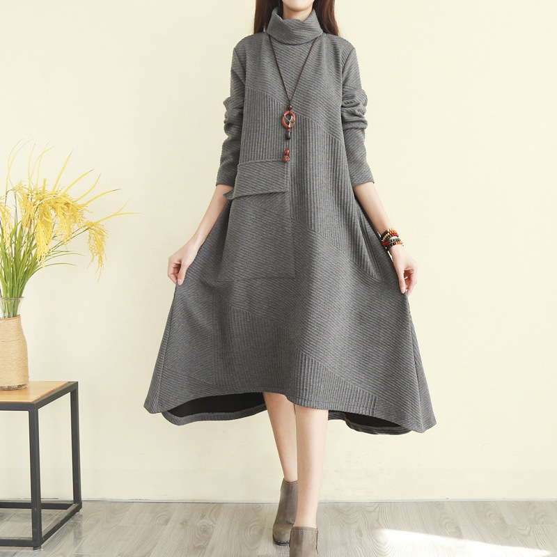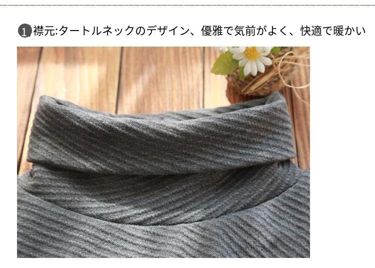 ロングワンピース レディース ストライプ ハイネック ゆったり 体型カバー 着痩せ ポケット付き 立ち襟 Aライン 普段着 可愛い お洒落 カジュアル 保温 通勤 秋 冬