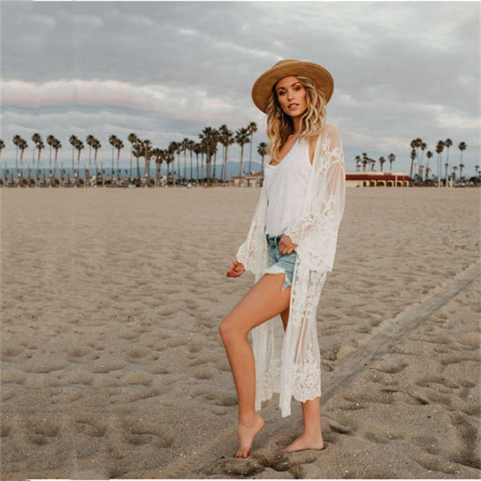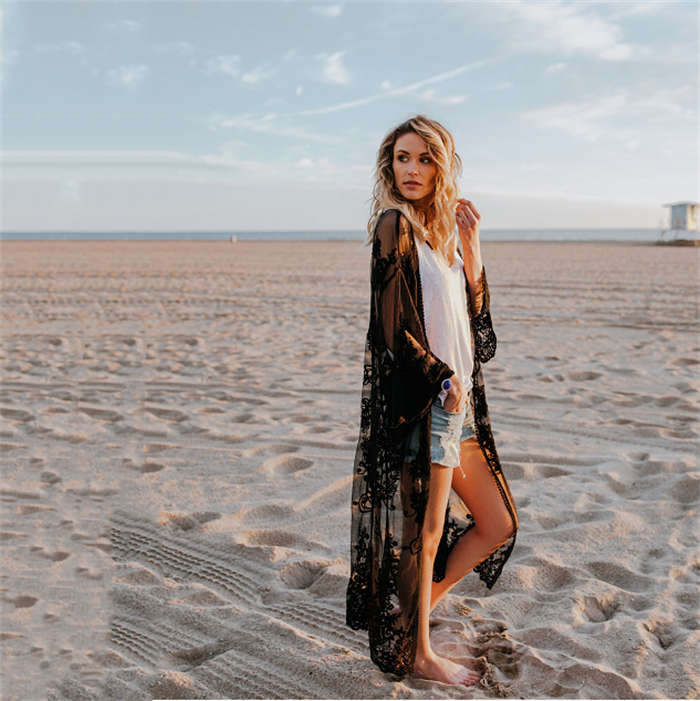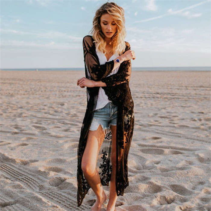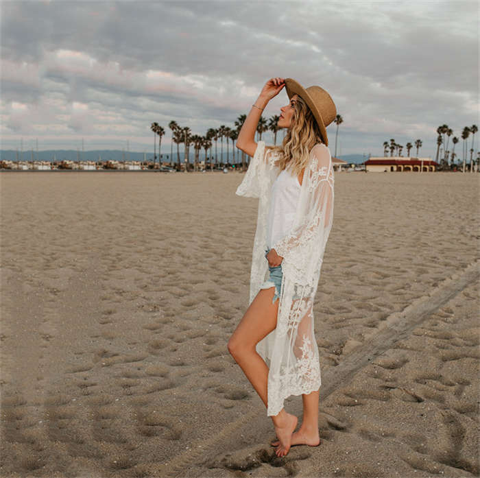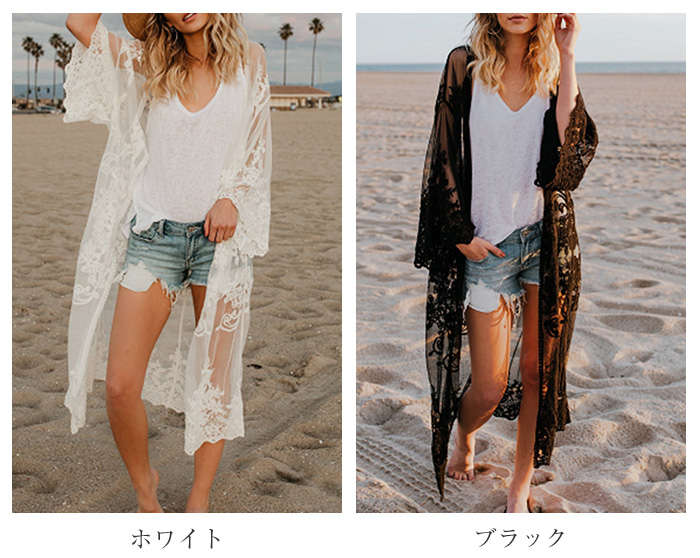 レースガウン ビーチウェア カーディガン ロング レース 刺繍 ビーチ 透け感 長袖 肩掛け ビーチカーディガン ビーチガウン レース肩掛け ロングガウン おしゃれ 日焼け対策 水着と合わせて 二の腕
