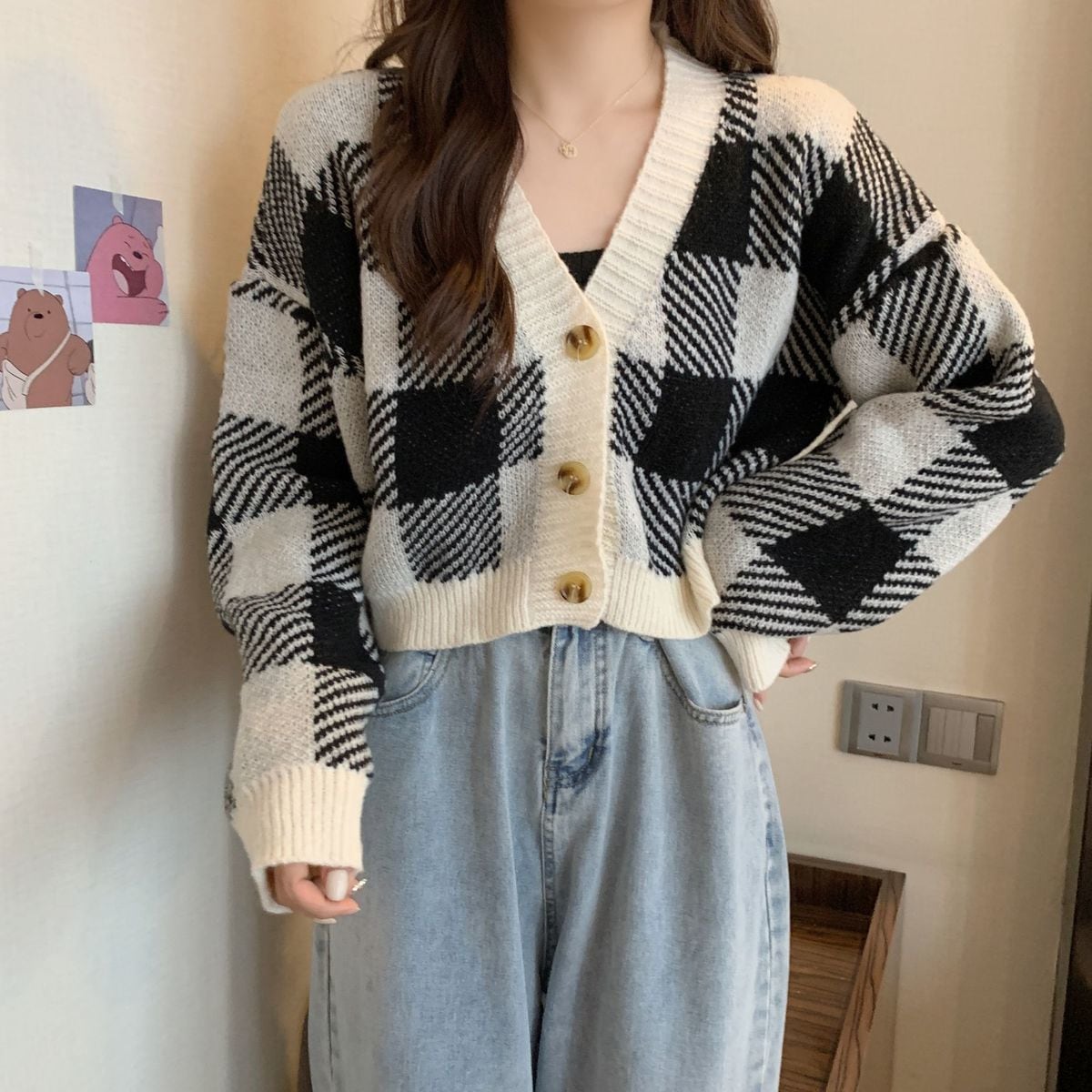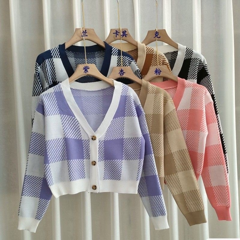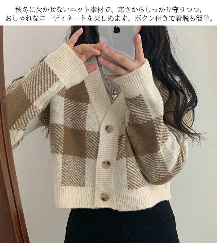 トップス ニットカーディガン レディース 秋冬 長袖 Vネックニット チェック柄 ボタン付き ゆったり 厚手 ショート丈 ふわふわ