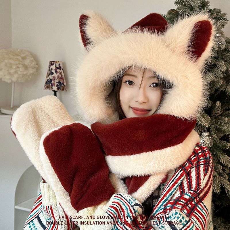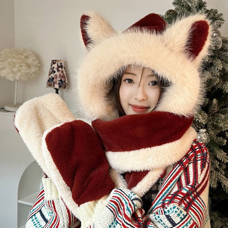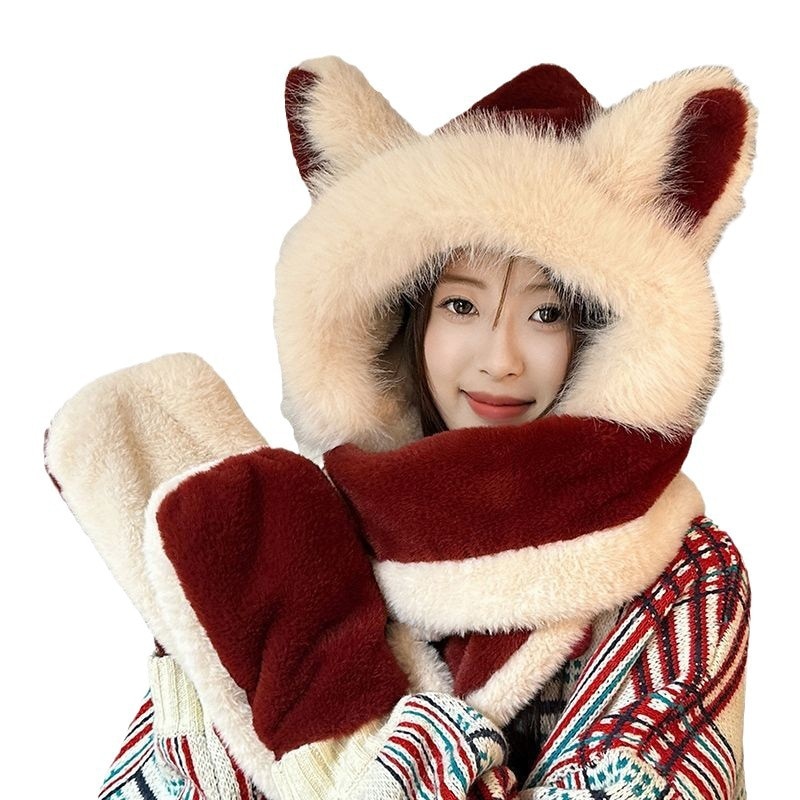 アンコラウールで作られた可愛いキツネ耳つきのモヘア帽子とスカラフがセットで冬用に加わった毛が厚く暖かい保温性なアイテムです 耳あて イヤーマフラー