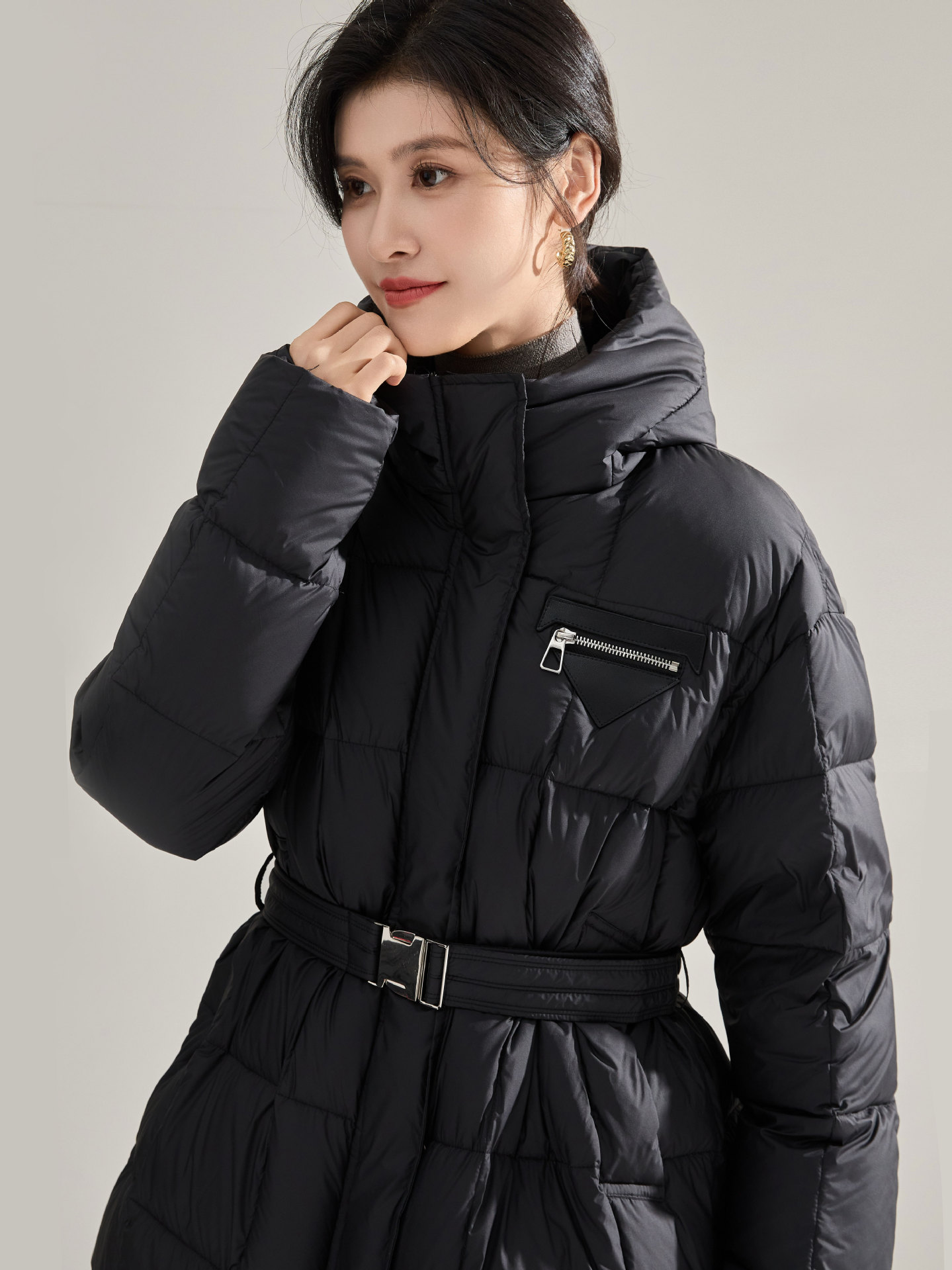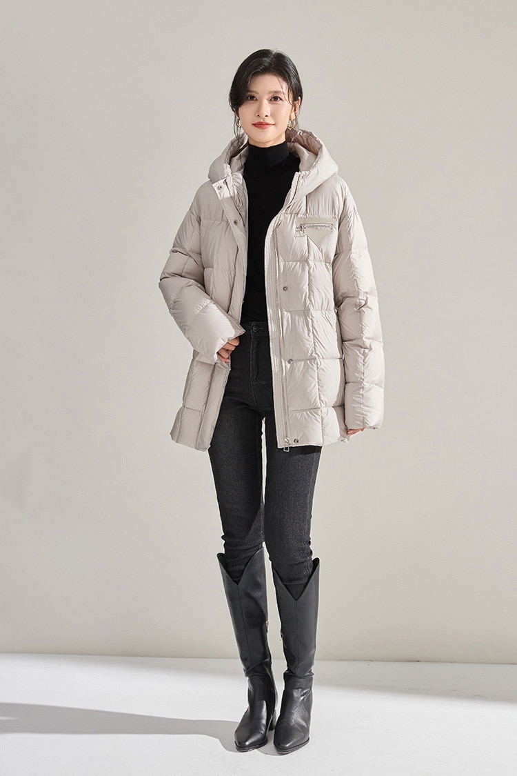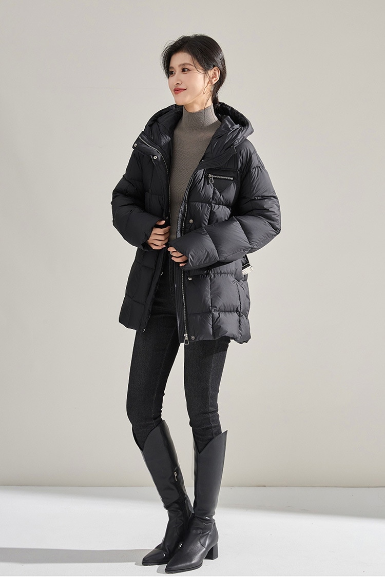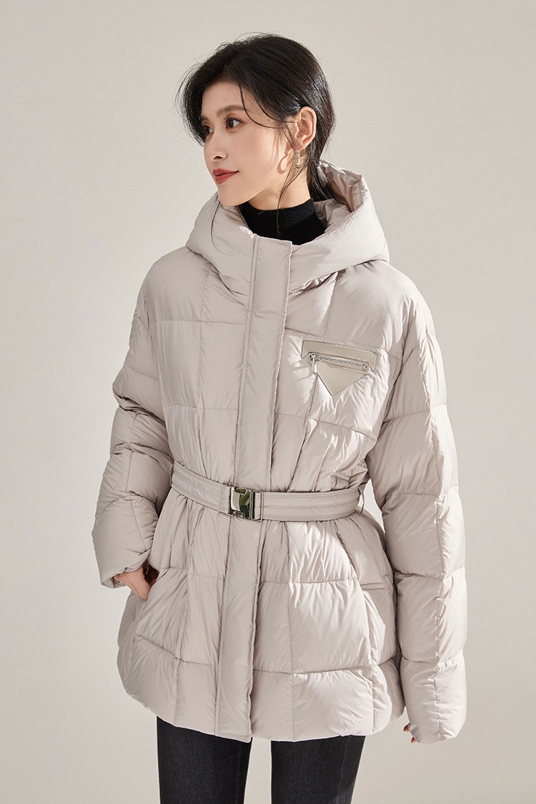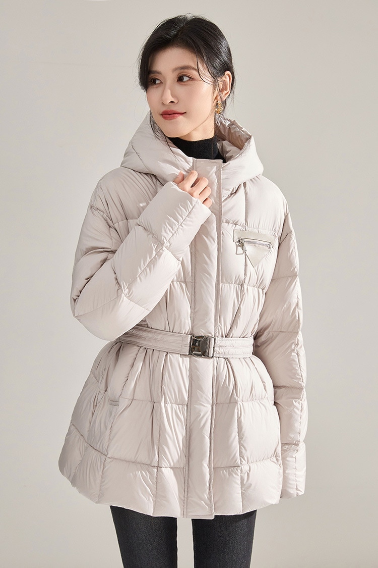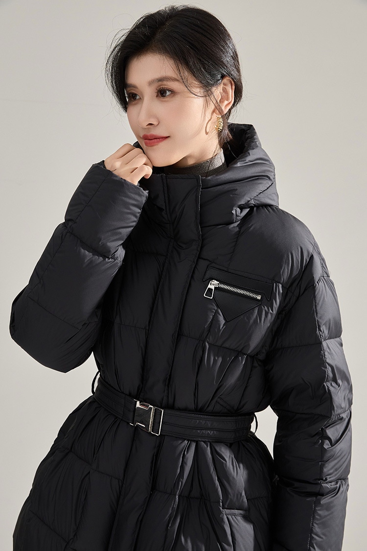 冬のふわふわ高い熱三角形のラベルのウエストはフード付きの長い片手90の白いダックのダウンジャケットを細くする ダウンジャケット コート
