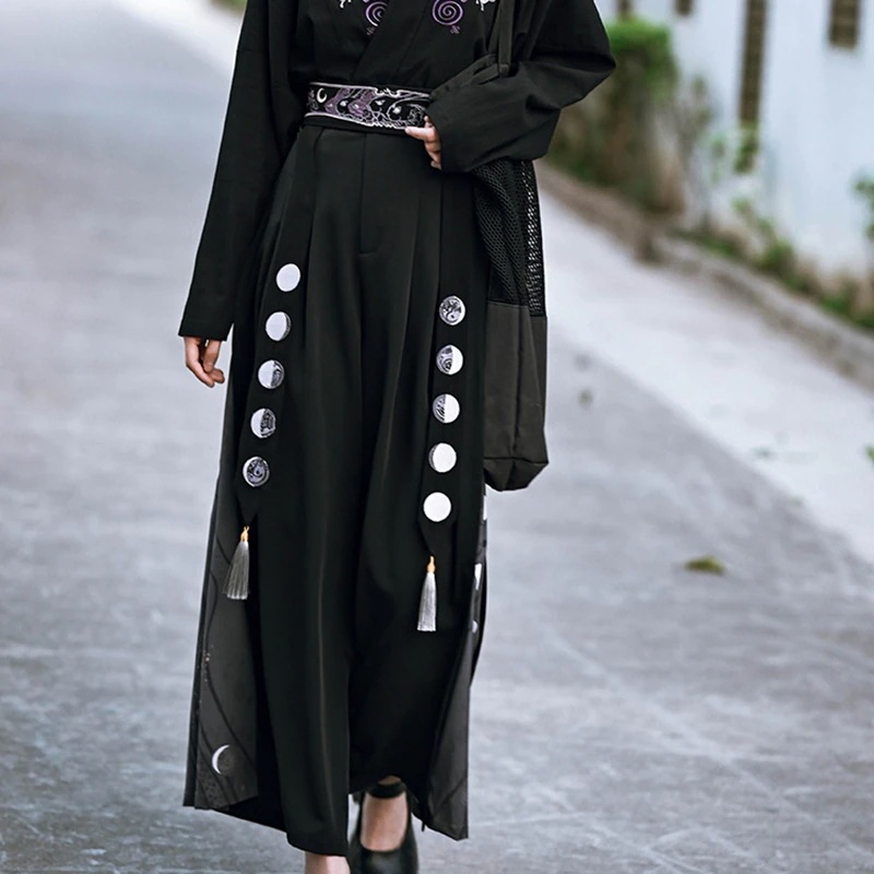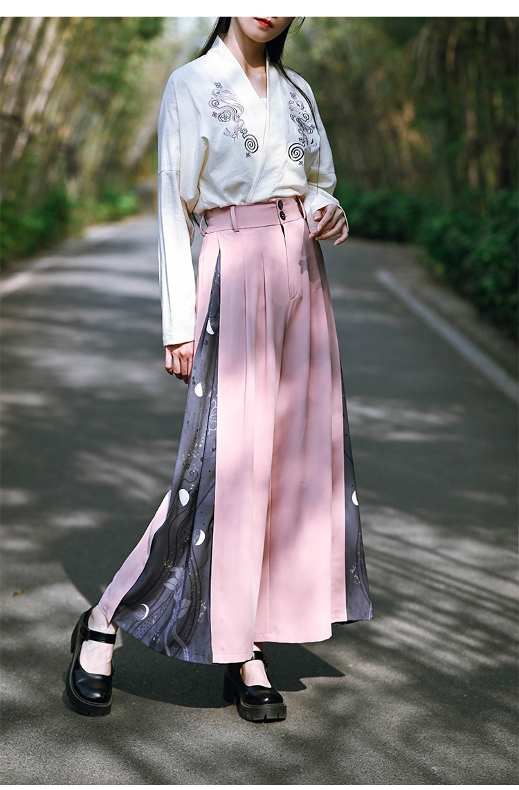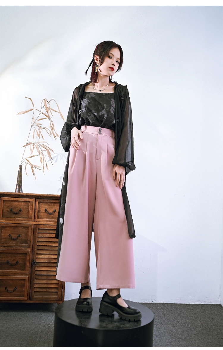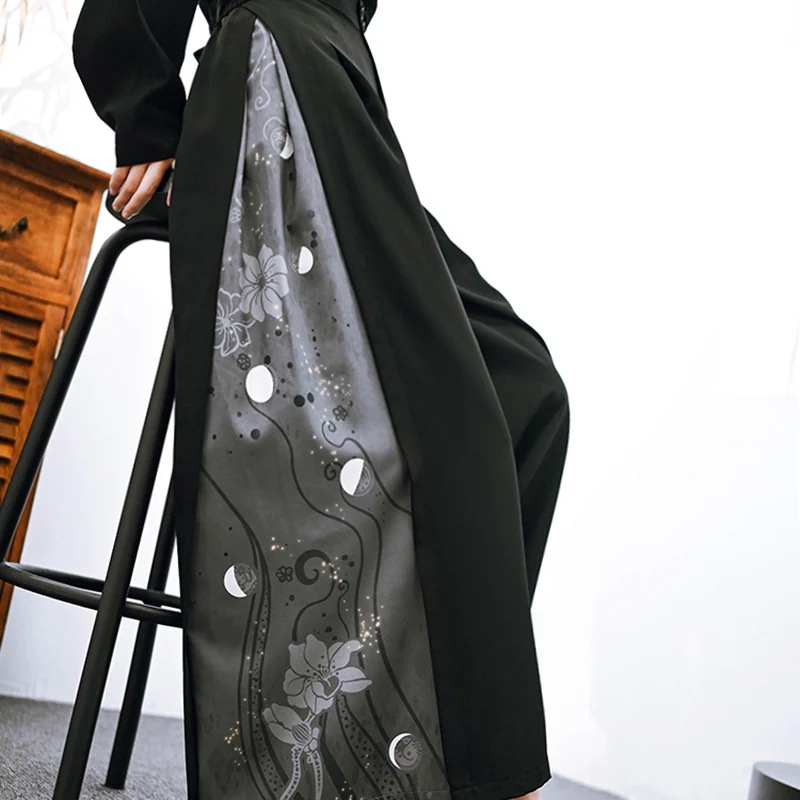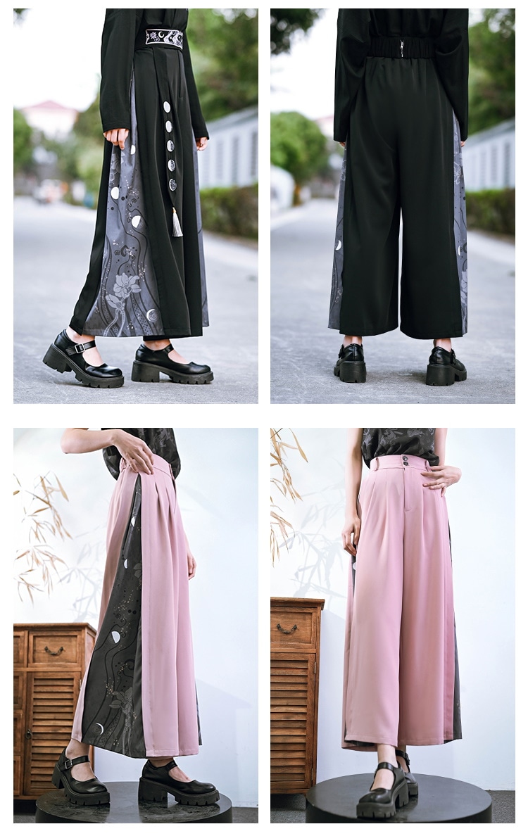 チャイナ風 ワイドパンツ レディース 柄パンツ 切り替え ボトムス ハイウエストズボン 黒 ピンク ロングパンツ